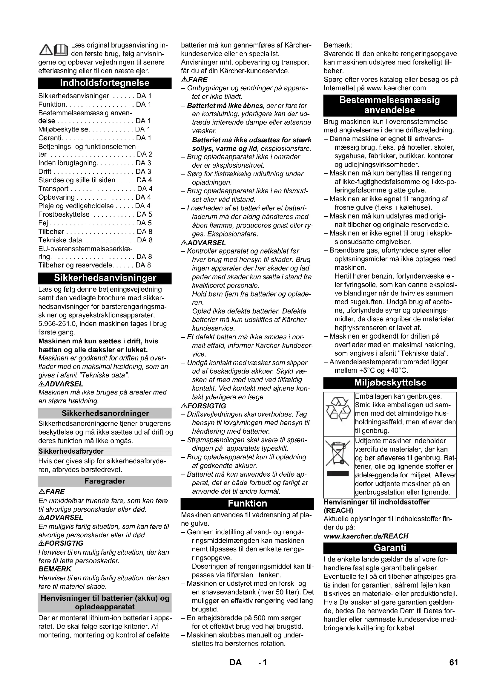 Chairman of the Board of Management Director Regulatory Affairs & Certification Acessórios e peças sobressalentes 60 PT- 1 Læs original brugsanvisning in- den første brug, følg anvisnin- gerne og opbevar vejledningen til senere efterlæsning eller til den næste ejer. Læs og følg denne betjeningsvejledning samt den vedlagte brochure med sikker- hedsanvisninger for børsterengøringsma- skiner og sprayekstraktionsapparater, 5.956-251.0, inden maskinen tages i brug første gang. Maskinen må kun sættes i drift, hvis hætten og alle dæksler er lukket. Maskinen er godkendt for driften på over- flader med en maksimal hældning, som an- gives i afsnit "Tekniske data". 몇 ADVARSEL Maskinen må ikke bruges på arealer med en større hældning. Sikkerhedsanordningerne tjener brugerens beskyttelse og må ikke sættes ud af drift og deres funktion må ikke omgås. Hvis der gives slip for sikkerhedsafbryde- ren, afbrydes børstedrevet. FARE En umiddelbar truende fare, som kan føre til alvorlige personskader eller død. 몇 ADVARSEL En muligvis farlig situation, som kan føre til alvorlige personskader eller til død. 몇 FORSIGTIG Henviser til en mulig farlig situation, der kan føre til lette personskader. BEMÆRK Henviser til en mulig farlig situation, der kan føre til materiel skade. Der er monteret lithium-ion batterier i appa- ratet. De skal følge særlige kriterier. Af- montering, montering og kontrol af defekte batterier må kun gennemføres af Kärcher- kundeservice eller en specialist. Anvisninger mht. opbevaring og transport får du af din Kärcher-kundeservice. FARE – Ombygninger og ændringer på appara- tet er ikke tilladt. – Batteriet må ikke åbnes, der er fare for en kortslutning, yderligere kan der ud- træde irriterende dampe eller ætsende væsker. Batteriet må ikke udsættes for stærk sollys, varme og ild, eksplosionsfare. – Brug opladeapparatet ikke i områder der er eksplosionstruet. – Sørg for tilstrækkelig udluftning under opladningen. – Brug opladeapparatet ikke i en tilsmud- set eller våd tilstand. – I nærheden af et batteri eller et batteri- laderum må der aldrig håndteres med åben flamme, produceres gnist eller ry- ges. Eksplosionsfare. 몇 ADVARSEL – Kontroller apparatet og netkablet før hver brug med hensyn til skader. Brug ingen apparater der har skader og lad parter med skader kun sætte i stand fra kvalificeret personale. Hold børn fjern fra batterier og oplade- ren. Oplad ikke defekte batterier. Defekte batterier må kun udskiftes af Kärcher- kundeservice. – Et defekt batteri må ikke smides i nor- malt affald, informer Kärcher-kundeser- vice. – Undgå kontakt med væsker som slipper ud af beskadigede akkuer. Skyld væ- sken af med med vand ved tilfældig kontakt. Ved kontakt med øjnene kon- takt yderligere en læge. 몇 FORSIGTIG – Driftsvejledningen skal overholdes. Tag hensyn til lovgivningen med hensyn til håndtering med batterier. – Strømspændingen skal svare til spæn- dingen på apparatets typeskilt. – Brug opladeapparatet kun til opladning af godkendte akkuer. – Batteriet må kun anvendes til dette ap- parat, det er både forbudt og farligt at anvende det til andre formål. Maskinen anvendes til vådrensning af pla- ne gulve. – Gennem indstilling af vand- og rengø- ringsmiddelmængden kan maskinen nemt tilpasses til den enkelte rengø- ringsopgave. Doseringen af rengøringsmiddel kan til- passes via tilførslen i tanken. – Maskinen er udstyret med en fersk- og en snavsevandstank (hver 50 liter). Det muliggør en effektiv rengøring ved lang brugstid. – En arbejdsbredde på 500 mm sørger for et effektivt brug ved høj brugstid. – Maskinen skubbes manuelt og under- støttes fra børsternes rotation. Bemærk: Svarende til den enkelte rengøringsopgave kan maskinen udstyres med forskelligt til- behør. Spørg efter vores katalog eller besøg os på Internettet på www.kaercher.com. Brug maskinen kun i overensstemmelse med angivelserne i denne driftsvejledning. – Denne maskine er egnet til erhvervs- mæssig brug, f.eks. på hoteller, skoler, sygehuse, fabrikker, butikker, kontorer og udlejningsvirksomheder. – Maskinen må kun benyttes til rengøring af ikke-fugtighedsfølsomme og ikke-po- leringsfølsomme glatte gulve. – Maskinen er ikke egnet til rengøring af frosne gulve (f.eks. i kølehuse). – Maskinen må kun udstyres med origi- nalt tilbehør og originale reservedele. – Maskinen er ikke egnet til brug i eksplo- sionsudsatte omgivelser. – Brændbare gas, ufortyndede syrer eller opløsningsmidler må ikke optages med maskinen. Hertil hører benzin, fortyndervæske el- ler fyringsolie, som kan danne eksplosi- ve blandinger når de hvirvles sammen med sugeluften. Undgå brug af aceto- ne, ufortyndede syrer og opløsnings- midler, da disse angriber de materialer, højtryksrenseren er lavet af. – Maskinen er godkendt for driften på overflader med en maksimal hældning, som angives i afsnit "Tekniske data". – Anvendelsestemperaturområdet ligger mellem +5°C og +40°C. Henvisninger til indholdsstoffer (REACH) Aktuelle oplysninger til indholdsstoffer fin- der du på: www.kaercher.de/REACH I de enkelte lande gælder de af vore for- handlere fastlagte garantibetingelser. Eventuelle fejl på dit tilbehør afhjælpes gra- tis inden for garantien, såfremt fejlen kan tilskrives en materiale- eller produktionsfejl. Hvis De ønsker at gøre garantien gælden- de, bedes De henvende Dem til Deres for- handler eller nærmeste kundeservice med- bringende kvittering for købet. Indholdsfortegnelse Sikkerhedsanvisninger . . . . . . DA 1 Funktion. . . . . . . . . . . . . . . . . . DA 1 Bestemmelsesmæssig anven- delse . . . . . . . . . . . . . . . . . . . . DA 1 Miljøbeskyttelse. . . . . . . . . . . . DA 1 Garanti. . . . . . . . . . . . . . . . . . . DA 1 Betjenings- og funktionselemen- ter . . . . . . . . . . . . . . . . . . . . . . DA 2 Inden ibrugtagning. . . . . . . . . . DA 3 Drift . . . .