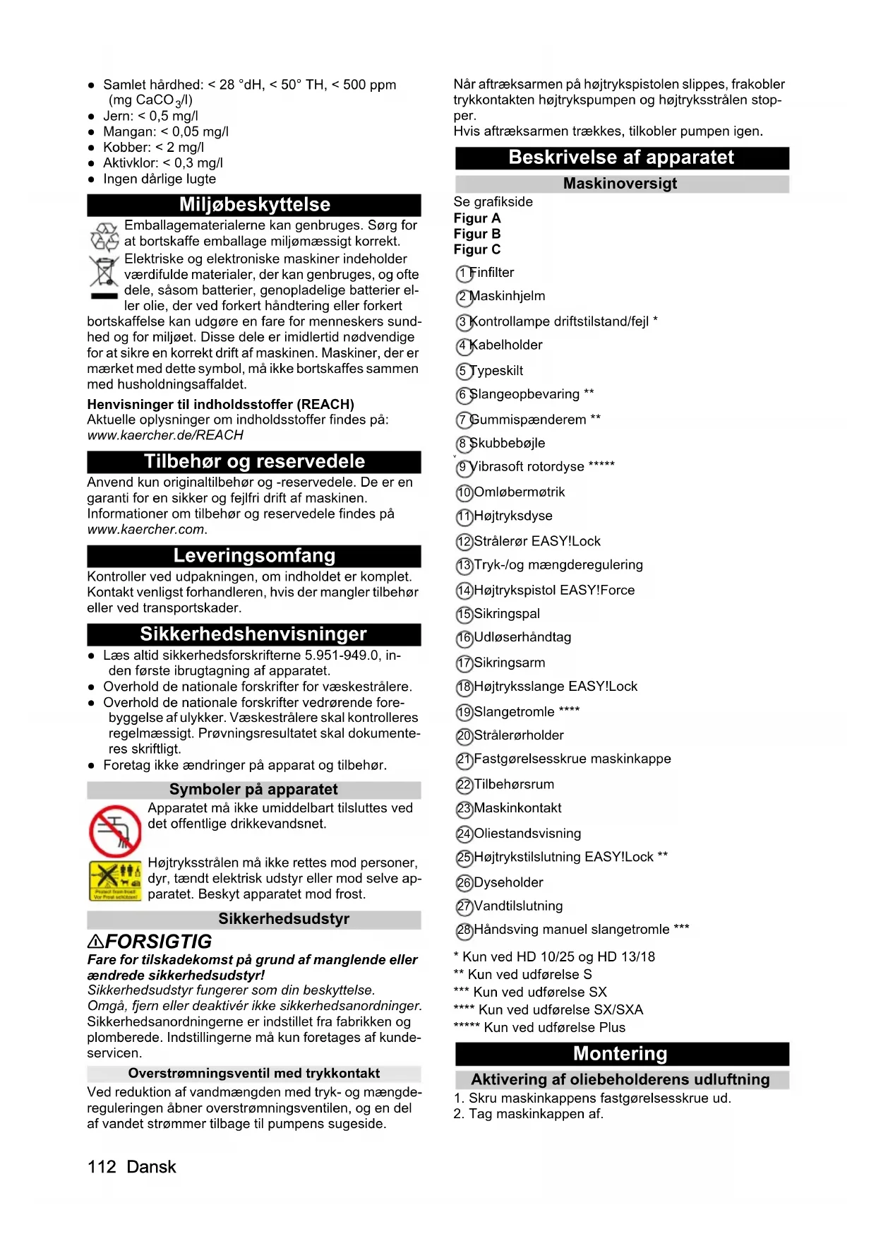 /l) ● Jern: < 0,5 mg/l ● Mangan: < 0,05 mg/l ● Kobber: < 2 mg/l ● Aktivklor: < 0,3 mg/l ● Ingen dårlige lugte Miljøbeskyttelse Emballagematerialerne kan genbruges. Sørg for at bortskaffe emballage miljømæssigt korrekt. Elektriske og elektroniske maskiner indeholder værdifulde materialer, der kan genbruges, og ofte dele, såsom batterier, genopladelige batterier el- ler olie, der ved forkert håndtering eller forkert bortskaffelse kan udgøre en fare for menneskers sund- hed og for miljøet. Disse dele er imidlertid nødvendige for at sikre en korrekt drift af maskinen. Maskiner, der er mærket med dette symbol, må ikke bortskaffes sammen med husholdningsaffaldet. Henvisninger til indholdsstoffer (REACH) Aktuelle oplysninger om indholdsstoffer findes på: www.kaercher.de/REACH Tilbehør og reservedele Anvend kun originaltilbehør og -reservedele. De er en garanti for en sikker og fejlfri drift af maskinen. Informationer om tilbehør og reservedele findes på www.kaercher.com. Leveringsomfang Kontroller ved udpakningen, om indholdet er komplet. Kontakt venligst forhandleren, hvis der mangler tilbehør eller ved transportskader. Sikkerhedshenvisninger ● Læs altid sikkerhedsforskrifterne 5.951-949.0, in- den første ibrugtagning af apparatet. ● Overhold de nationale forskrifter for væskestrålere. ● Overhold de nationale forskrifter vedrørende fore- byggelse af ulykker. Væskestrålere skal kontrolleres regelmæssigt. Prøvningsresultatet skal dokumente- res skriftligt. ● Foretag ikke ændringer på apparat og tilbehør. Symboler på apparatet Apparatet må ikke umiddelbart tilsluttes ved det offentlige drikkevandsnet. Højtryksstrålen må ikke rettes mod personer, dyr, tændt elektrisk udstyr eller mod selve ap- paratet. Beskyt apparatet mod frost. Sikkerhedsudstyr 몇 FORSIGTIG Fare for tilskadekomst på grund af manglende eller ændrede sikkerhedsudstyr! Sikkerhedsudstyr fungerer som din beskyttelse. Omgå, fjern eller deaktivér ikke sikkerhedsanordninger. Sikkerhedsanordningerne er indstillet fra fabrikken og plomberede. Indstillingerne må kun foretages af kunde- servicen. Overstrømningsventil med trykkontakt Ved reduktion af vandmængden med tryk- og mængde- reguleringen åbner overstrømningsventilen, og en del af vandet strømmer tilbage til pumpens sugeside. Når aftræksarmen på højtrykspistolen slippes, frakobler trykkontakten højtrykspumpen og højtryksstrålen stop- per. Hvis aftræksarmen trækkes, tilkobler pumpen igen. Beskrivelse af apparatet Maskinoversigt Se grafikside Figur A Figur B Figur C 1 Finfilter 2 Maskinhjelm 3 Kontrollampe driftstilstand/fejl * 4 Kabelholder 5 Typeskilt 6 Slangeopbevaring ** 7 Gummispænderem ** 8 Skubbebøjle