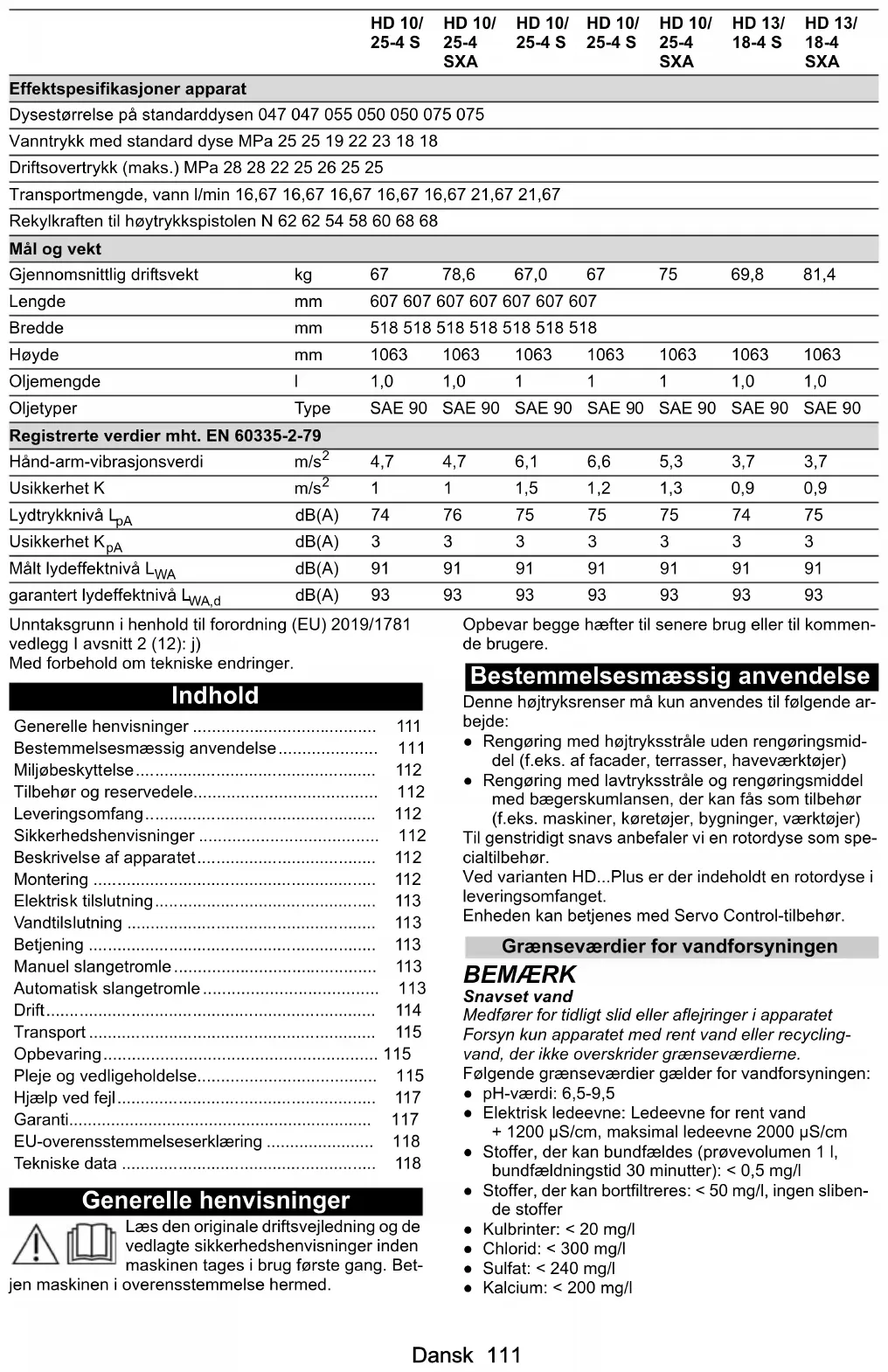 4.730- 012.0Dansk 111 Unntaksgrunn i henhold til forordning (EU) 2019/1781 vedlegg I avsnitt 2 (12): j) Med forbehold om tekniske endringer. Indhold Generelle henvisninger Læs den originale driftsvejledning og de vedlagte sikkerhedshenvisninger inden maskinen tages i brug første gang. Bet- jen maskinen i overensstemmelse hermed. Opbevar begge hæfter til senere brug eller til kommen- de brugere. Bestemmelsesmæssig anvendelse Denne højtryksrenser må kun anvendes til følgende ar- bejde: ● Rengøring med højtryksstråle uden rengøringsmid- del (f.eks. af facader, terrasser, haveværktøjer) ● Rengøring med lavtryksstråle og rengøringsmiddel med bægerskumlansen, der kan fås som tilbehør (f.eks. maskiner, køretøjer, bygninger, værktøjer) Til genstridigt snavs anbefaler vi en rotordyse som spe- cialtilbehør. Ved varianten HD...Plus er der indeholdt en rotordyse i leveringsomfanget. Enheden kan betjenes med Servo Control-tilbehør. Grænseværdier for vandforsyningen BEMÆRK Snavset vand Medfører for tidligt slid eller aflejringer i apparatet Forsyn kun apparatet med rent vand eller recycling- vand, der ikke overskrider grænseværdierne. Følgende grænseværdier gælder for vandforsyningen: ● pH-værdi: 6,5-9,5 ● Elektrisk ledeevne: Ledeevne for rent vand + 1200 µS/cm, maksimal ledeevne 2000 µS/cm ● Stoffer, der kan bundfældes (prøvevolumen 1 l, bundfældningstid 30 minutter): < 0,5 mg/l ● Stoffer, der kan bortfiltreres: < 50 mg/l, ingen sliben- de stoffer ● Kulbrinter: < 20 mg/l ● Chlorid: < 300 mg/l ● Sulfat: < 240 mg/l ● Kalcium: < 200 mg/l Effektspesifikasjoner apparat Dysestørrelse på standarddysen 047 047 055 050 050 075 075 Vanntrykk med standard dyse MPa 25 25 19 22 23 18 18 Driftsovertrykk (maks.) MPa 28 28 22 25 26 25 25 Transportmengde, vann l/min 16,67 16,67 16,67 16,67 16,67 21,67 21,67 Rekylkraften til høytrykkspistolen N 62 62 54 58 60 68 68 Mål og vekt Gjennomsnittlig driftsvekt kg 67 78,6 67,0 67 75 69,8 81,4 Lengde mm 607 607 607 607 607 607 607 Bredde mm 518 518 518 518 518 518 518 Høyde mm 1063 1063 1063 1063 1063 1063 1063 Oljemengde l 1,0 1,0 1111,01,0 Oljetyper Type SAE 90 SAE 90 SAE 90 SAE 90 SAE 90 SAE 90 SAE 90 Registrerte verdier mht. EN 60335-2-79 Hånd-arm-vibrasjonsverdi m/s
