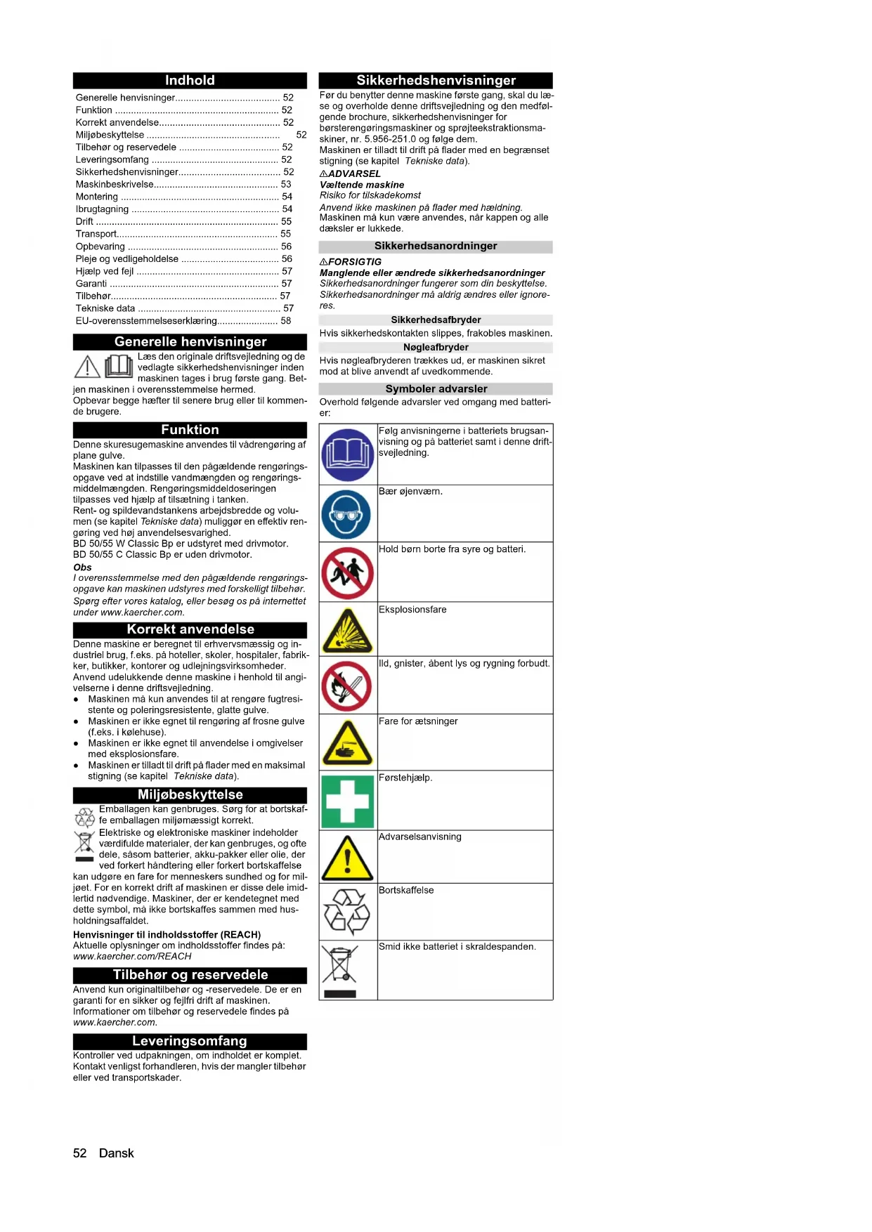 - dB(A) 84,1 84,1 BD 50/55 W Classic Bp BD 50/55 C Classic Bp Chairman of the Board of Management Director Regulatory Affairs & Certification H. Jenner S. Reiser52 Dansk Indhold Generelle henvisninger Læs den originale driftsvejledning og de vedlagte sikkerhedshenvisninger inden maskinen tages i brug første gang. Bet- jen maskinen i overensstemmelse hermed. Opbevar begge hæfter til senere brug eller til kommen- de brugere. Funktion Denne skuresugemaskine anvendes til vådrengøring af plane gulve. Maskinen kan tilpasses til den pågældende rengørings- opgave ved at indstille vandmængden og rengørings- middelmængden. Rengøringsmiddeldoseringen tilpasses ved hjælp af tilsætning i tanken. Rent- og spildevandstankens arbejdsbredde og volu- men (se kapitel Tekniske data) muliggør en effektiv ren- gøring ved høj anvendelsesvarighed. BD 50/55 W Classic Bp er udstyret med drivmotor. BD 50/55 C Classic Bp er uden drivmotor. Obs I overensstemmelse med den pågældende rengørings- opgave kan maskinen udstyres med forskelligt tilbehør. Spørg efter vores katalog, eller besøg os på internettet under www.kaercher.com. Korrekt anvendelse Denne maskine er beregnet til erhvervsmæssig og in- dustriel brug, f.eks. på hoteller, skoler, hospitaler, fabrik- ker, butikker, kontorer og udlejningsvirksomheder. Anvend udelukkende denne maskine i henhold til angi- velserne i denne driftsvejledning. ● Maskinen må kun anvendes til at rengøre fugtresi- stente og poleringsresistente, glatte gulve. ● Maskinen er ikke egnet til rengøring af frosne gulve (f.eks. i kølehuse). ● Maskinen er ikke egnet til anvendelse i omgivelser med eksplosionsfare. ● Maskinen er tilladt til drift på flader med en maksimal stigning (se kapitel Tekniske data). Miljøbeskyttelse Emballagen kan genbruges. Sørg for at bortskaf- fe emballagen miljømæssigt korrekt. Elektriske og elektroniske maskiner indeholder værdifulde materialer, der kan genbruges, og ofte dele, såsom batterier, akku-pakker eller olie, der ved forkert håndtering eller forkert bortskaffelse kan udgøre en fare for menneskers sundhed og for mil- jøet. For en korrekt drift af maskinen er disse dele imid- lertid nødvendige. Maskiner, der er kendetegnet med dette symbol, må ikke bortskaffes sammen med hus- holdningsaffaldet. Henvisninger til indholdsstoffer (REACH) Aktuelle oplysninger om indholdsstoffer findes på: www.kaercher.com/REACH Tilbehør og reservedele Anvend kun originaltilbehør og -reservedele. De er en garanti for en sikker og fejlfri drift af maskinen. Informationer om tilbehør og reservedele findes på www.kaercher.com. Leveringsomfang Kontroller ved udpakningen, om indholdet er komplet. Kontakt venligst forhandleren, hvis der mangler tilbehør eller ved transportskader. Sikkerhedshenvisninger Før du benytter denne maskine første gang, skal du læ- se og overholde denne driftsvejledning og den medføl- gende brochure, sikkerhedshenvisninger for børsterengøringsmaskiner og sprøjteekstraktionsma- skiner, nr. 5.956-251.0 og følge dem. Maskinen er tilladt til drift på flader med en begrænset stigning (se kapitel Tekniske data). 몇 ADVARSEL Væltende maskine Risiko for tilskadekomst Anvend ikke maskinen på flader med hældning. Maskinen må kun være anvendes, når kappen og alle dæksler er lukkede. Sikkerhedsanordninger 몇 FORSIGTIG Manglende eller ændrede sikkerhedsanordninger Sikkerhedsanordninger fungerer som din beskyttelse. Sikkerhedsanordninger må aldrig ændres eller ignore- res. Sikkerhedsafbryder Hvis sikkerhedskontakten slippes, frakobles maskinen. Nøgleafbryder Hvis nøgleafbryderen trækkes ud, er maskinen sikret mod at blive anvendt af uvedkommende. Symboler advarsler Overhold følgende advarsler ved omgang med batteri- er: Generelle henvisninger p. 52
