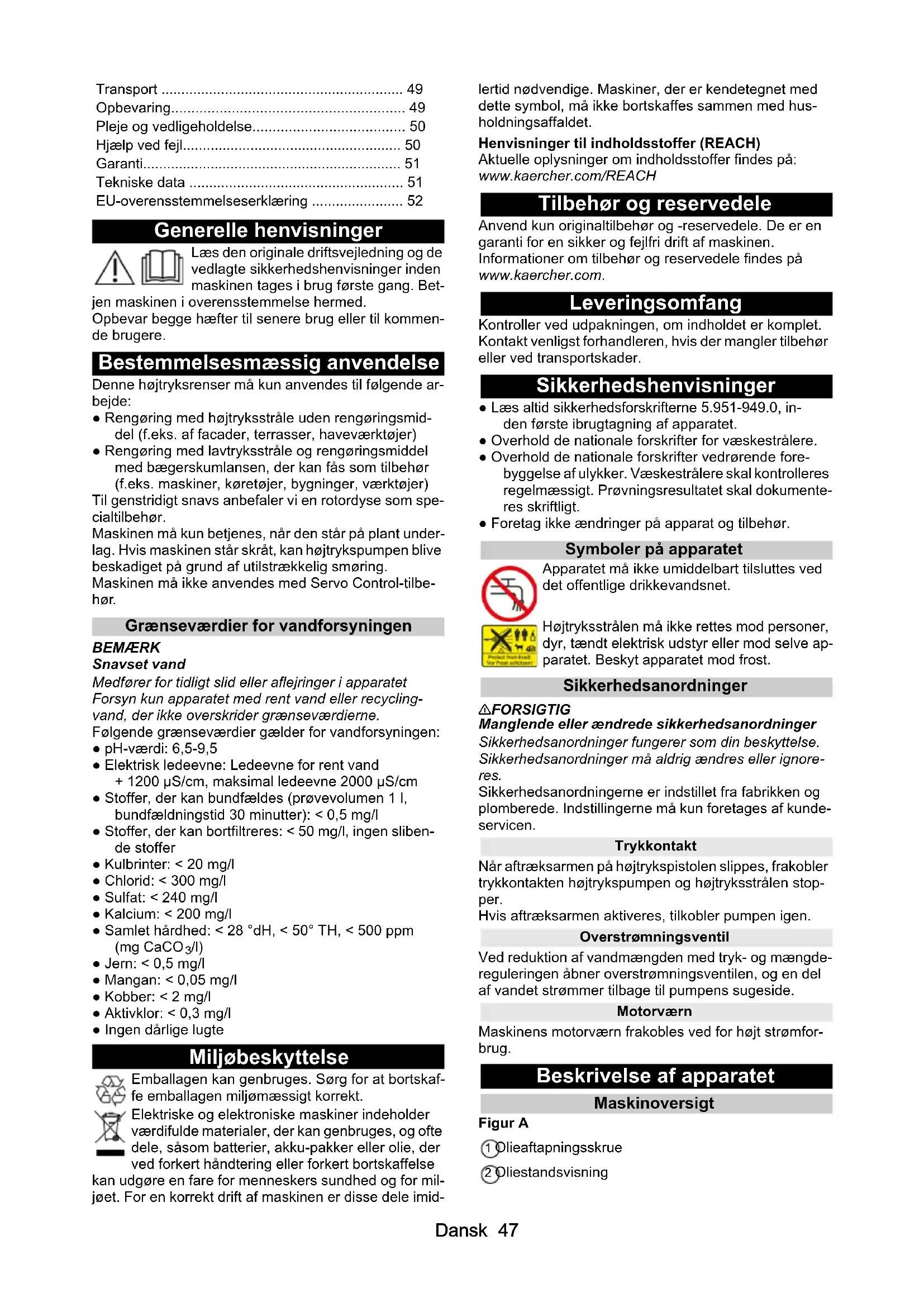 - /l) ● Jern: < 0,5 mg/l ● Mangan: < 0,05 mg/l ● Kobber: < 2 mg/l ● Aktivklor: < 0,3 mg/l ● Ingen dårlige lugte Miljøbeskyttelse Emballagen kan genbruges. Sørg for at bortskaf- fe emballagen miljømæssigt korrekt. Elektriske og elektroniske maskiner indeholder værdifulde materialer, der kan genbruges, og ofte dele, såsom batterier, akku-pakker eller olie, der ved forkert håndtering eller forkert bortskaffelse kan udgøre en fare for menneskers sundhed og for mil- jøet. For en korrekt drift af maskinen er disse dele imid- lertid nødvendige. Maskiner, der er kendetegnet med dette symbol, må ikke bortskaffes sammen med hus- holdningsaffaldet. Henvisninger til indholdsstoffer (REACH) Aktuelle oplysninger om indholdsstoffer findes på: www.kaercher.com/REACH Tilbehør og reservedele Anvend kun originaltilbehør og -reservedele. De er en garanti for en sikker og fejlfri drift af maskinen. Informationer om tilbehør og reservedele findes på www.kaercher.com. Leveringsomfang Kontroller ved udpakningen, om indholdet er komplet. Kontakt venligst forhandleren, hvis der mangler tilbehør eller ved transportskader. Sikkerhedshenvisninger ● Læs altid sikkerhedsforskrifterne 5.951-949.0, in- den første ibrugtagning af apparatet. ● Overhold de nationale forskrifter for væskestrålere. ● Overhold de nationale forskrifter vedrørende fore- byggelse af ulykker. Væskestrålere skal kontrolleres regelmæssigt. Prøvningsresultatet skal dokumente- res skriftligt. ● Foretag ikke ændringer på apparat og tilbehør. Symboler på apparatet Apparatet må ikke umiddelbart tilsluttes ved det offentlige drikkevandsnet. Højtryksstrålen må ikke rettes mod personer, dyr, tændt elektrisk udstyr eller mod selve ap- paratet. Beskyt apparatet mod frost. Sikkerhedsanordninger 몇 FORSIGTIG Manglende eller ændrede sikkerhedsanordninger Sikkerhedsanordninger fungerer som din beskyttelse. Sikkerhedsanordninger må aldrig ændres eller ignore- res. Sikkerhedsanordningerne er indstillet fra fabrikken og plomberede. Indstillingerne må kun foretages af kunde- servicen. Trykkontakt Når aftræksarmen på højtrykspistolen slippes, frakobler trykkontakten højtrykspumpen og højtryksstrålen stop- per. Hvis aftræksarmen aktiveres, tilkobler pumpen igen. Overstrømningsventil Ved reduktion af vandmængden med tryk- og mængde- reguleringen åbner overstrømningsventilen, og en del af vandet strømmer tilbage til pumpens sugeside. Motorværn Maskinens motorværn frakobles ved for højt strømfor- brug. Beskrivelse af apparatet Maskinoversigt Figur A 1 Olieaftapningsskrue 2 Oliestandsvisning Transport p. 49