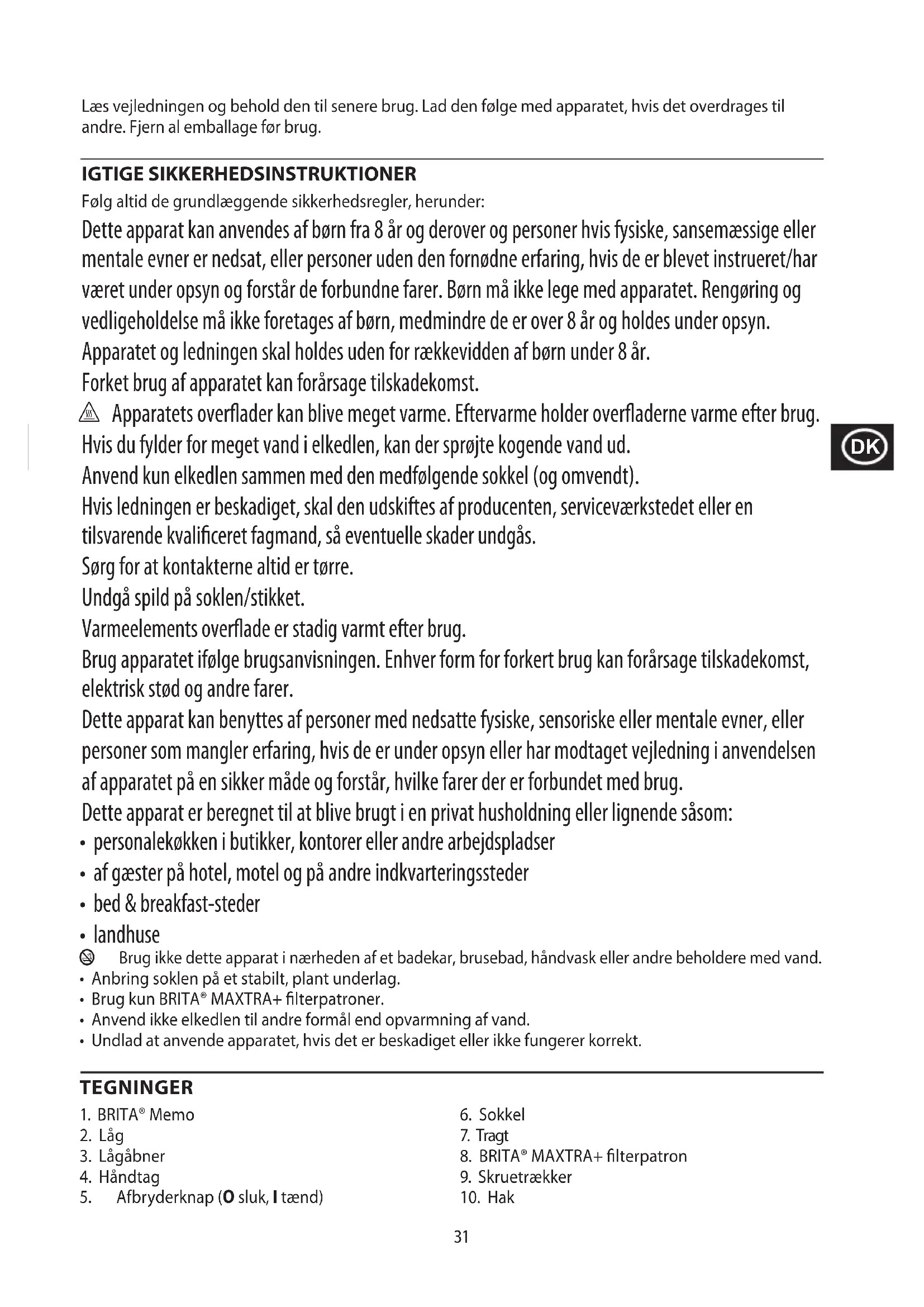 Para evitar problemas ambientais e de saúde devido a substâncias perigosas, os aparelhos e baterias recarregáveis e não recarregáveis com um destes símbolos não deverão ser eliminados com o lixo doméstico normal. Elimine sempre os produtos elétricos e eletrónicos e, quando aplicável, as baterias recarregáveis e não recarregáveis, no ponto de reciclagem/recolha ocial apropriado.31 Læs vejledningen og behold den til senere brug. Lad den følge med apparatet, hvis det overdrages til andre. Fjern al emballage før brug. IGTIGE SIKKERHEDSINSTRUKTIONER Følg altid de grundlæggende sikkerhedsregler, herunder: Dette apparat kan anvendes af børn fra 8 år og derover og personer hvis fysiske, sansemæssige eller mentale evner er nedsat, eller personer uden den fornødne erfaring, hvis de er blevet instrueret/har været under opsyn og forstår de forbundne farer. Børn må ikke lege med apparatet. Rengøring og vedligeholdelse må ikke foretages af børn, medmindre de er over 8 år og holdes under opsyn. Apparatet og ledningen skal holdes uden for rækkevidden af børn under 8 år. Forket brug af apparatet kan forårsage tilskadekomst. h Apparatets overader kan blive meget varme. Eftervarme holder overaderne varme efter brug. Hvis du fylder for meget vand i elkedlen, kan der sprøjte kogende vand ud. Anvend kun elkedlen sammen med den medfølgende sokkel (og omvendt). Hvis ledningen er beskadiget, skal den udskiftes af producenten, serviceværkstedet eller en tilsvarende kvaliceret fagmand, så eventuelle skader undgås. Sørg for at kontakterne altid er tørre. Undgå spild på soklen/stikket. Varmeelements overade er stadig varmt efter brug. Brug apparatet ifølge brugsanvisningen. Enhver form for forkert brug kan forårsage tilskadekomst, elektrisk stød og andre farer. Dette apparat kan benyttes af personer med nedsatte fysiske, sensoriske eller mentale evner, eller personer som mangler erfaring, hvis de er under opsyn eller har modtaget vejledning i anvendelsen af apparatet på en sikker måde og forstår, hvilke farer der er forbundet med brug. Dette apparat er beregnet til at blive brugt i en privat husholdning eller lignende såsom: