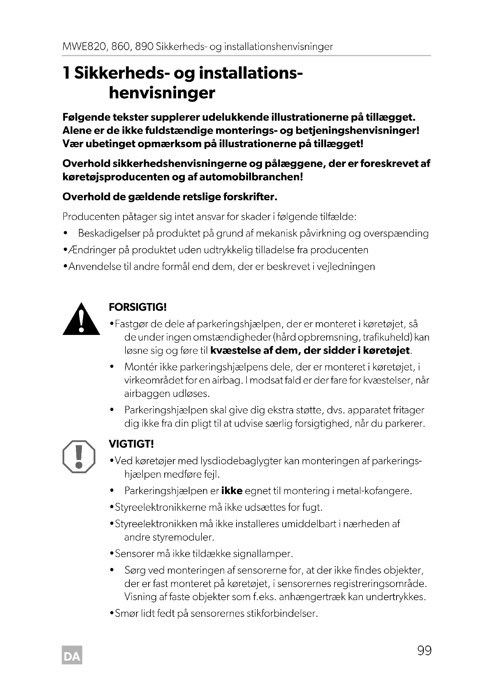 1 Sikkerheds- og installations- henvisninger Følgende tekster supplerer udelukkende illustrationerne på tillægget. Alene er de ikke fuldstændige monterings- og betjeningshenvisninger! Vær ubetinget opmærksom på illustrationerne på tillægget! Overhold sikkerhedshenvisningerne og pålæggene, der er foreskrevet af køretøjsproducenten og af automobilbranchen! Overhold de gældende retslige forskrifter. Producenten påtager sig intet ansvar for skader i følgende tilfælde: