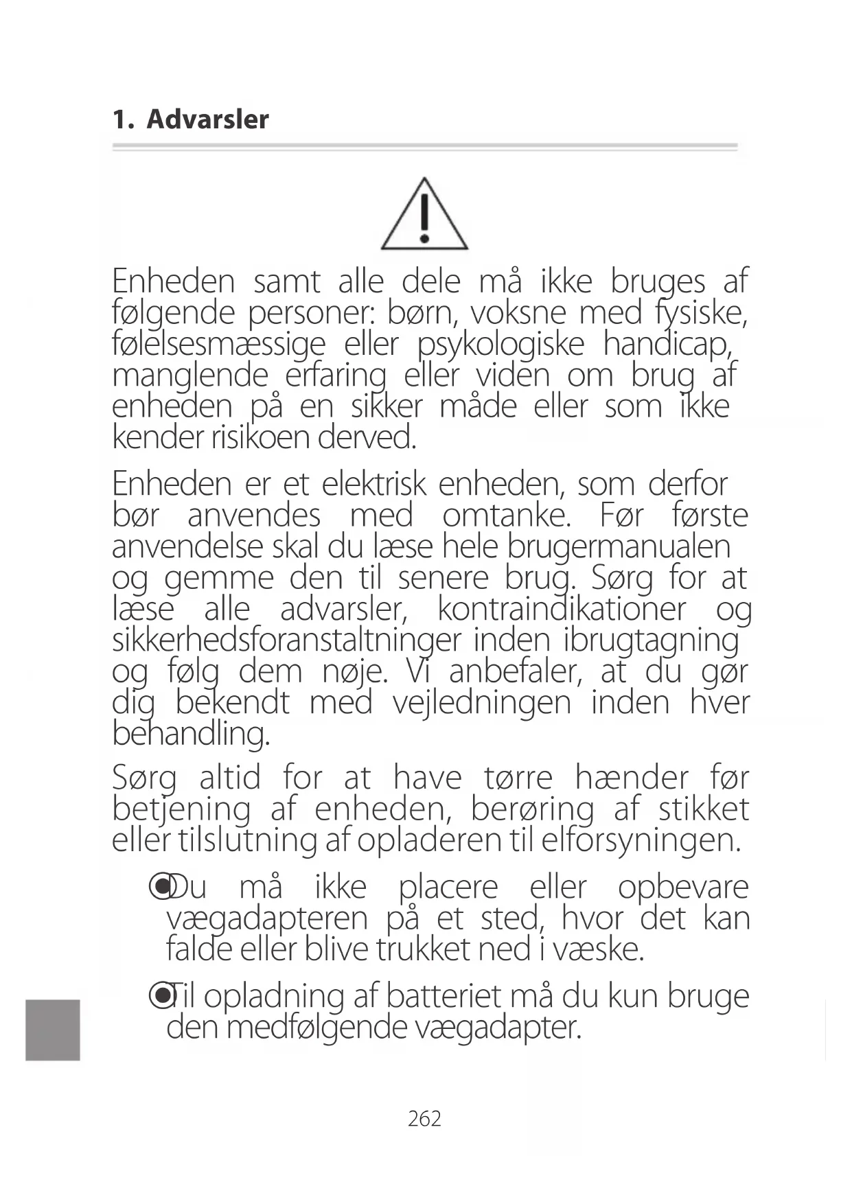 Enheden samt alle dele må ikke bruges af følgende personer: børn, voksne med fysiske, følelsesmæssige eller psykologiske handicap, manglende erfaring eller viden om brug af enheden på en sikker måde eller som ikke kender risikoen derved. Enheden er et elektrisk enheden, som derfor bør anvendes med omtanke. Før første anvendelse skal du læse hele brugermanualen og gemme den til senere brug. Sørg for at læse alle advarsler, kontraindikationer og sikkerhedsforanstaltninger inden ibrugtagning og følg dem nøje. Vi anbefaler, at du gør dig bekendt med vejledningen inden hver behandling. Sørg altid for at have tørre hænder før betjening af enheden, berøring af stikket eller tilslutning af opladeren til elforsyningen.
