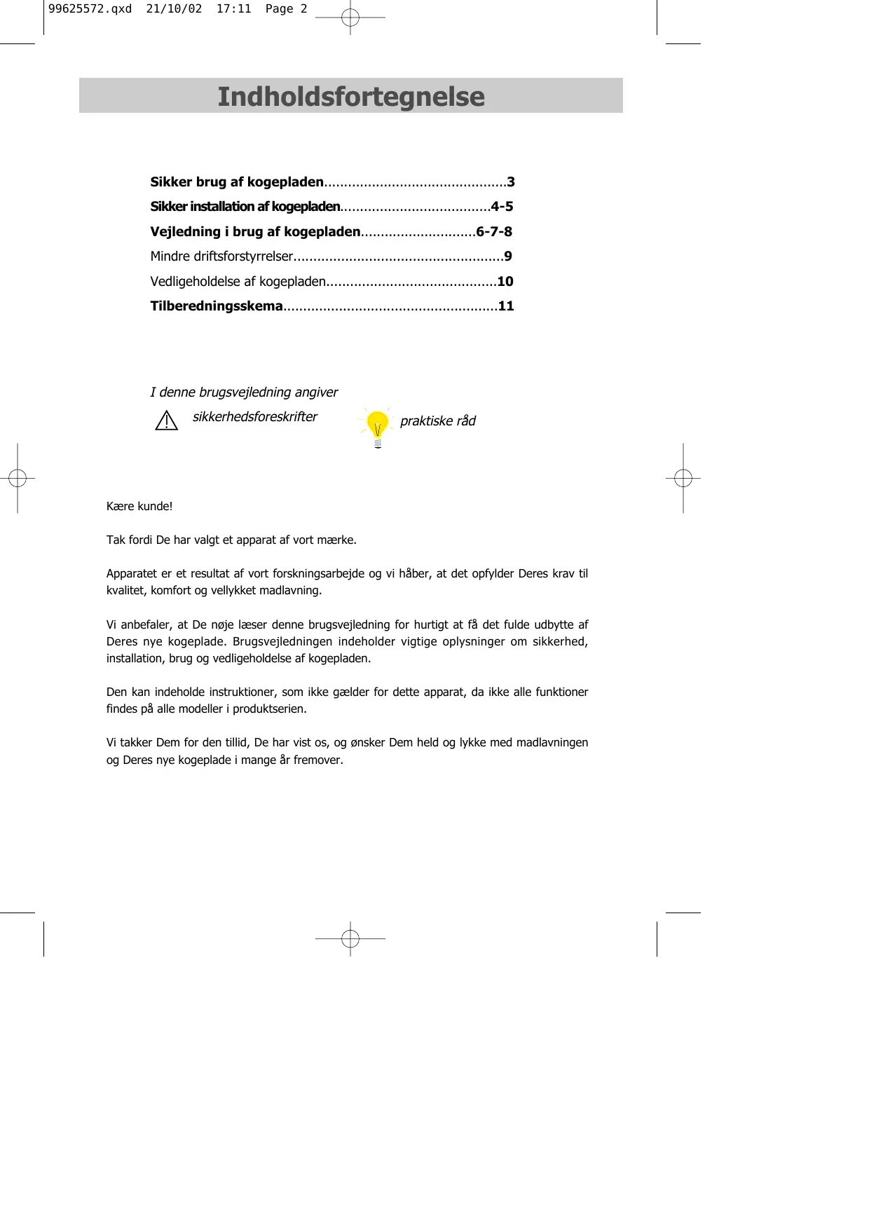 - 9962 5572 07/02 99625572.qxd 21/10/02 17:11 Page 2 Indholdsfortegnelse Sikker brug af kogepladen p. 3