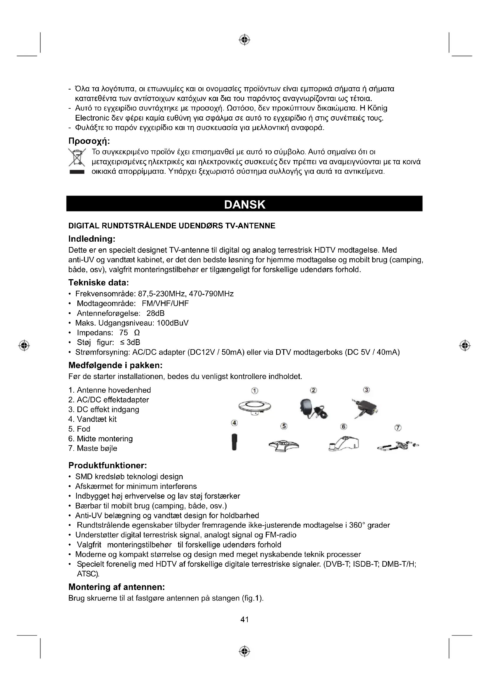 mellem antennen og udsendelsestårnet kan det forårsage midlertidigt signaltab. Så hvis antennen installeres så højt som muligt, vil disse modtagelser blive reducerert. Sikkerhedsforholdsregler: For at nedsætte risikoen for elektrisk stød, må dette produkt, f.eks. når der kræves service, KUN åbnes af en autoriseret tekniker. Frakobl produktet stikkontakten og andet udstyr, hvis der opstår et problem. Udsæt ikke produktet for vand eller fugt. Vedligeholdelse: Rengør kun med en tør klud. Brug ikke opløsningsmidler eller slibende rengøringsmidler. Digital antenne AC/DC adapter 12V 50mA Digital tuner STB Effektindgang Digital antenne 5V 40mA Digital tuner STB 360° RUNDTSTRÅLENDE TV-SIGNAL modtagelse44 Garanti: Ingen garanti og ikke noget ansvar kan påtages for ændringer af produktet eller for skade på grund af forkert brug af dette produkt. Generelt: - Design og specifikationer kan ændres uden varsel. - Alle bomærker og produktnavne er varemærker eller registrerede varemærker tilhørende deres respektive ejere og anses herved som sådan. - Denne vejledning blev udført omhyggeligt. Imidlertid kan der ikke afledes nogen rettigheder. König Electronic kan ikke holdes ansvarlig for eventuelle fejl i denne vejledning eller deres konsekvenser. - Gem brugervejledningen og emballagen til senere brug. Bemærk: Dette produkt er mærket med dette symbol. Det betyder, at brugt elektrisk og elektronisk udstyr ikke må bortskaffes sammen med almindeligt husholdningsaffald. Der findes særlige indsamlingssystemer for disse produkter.