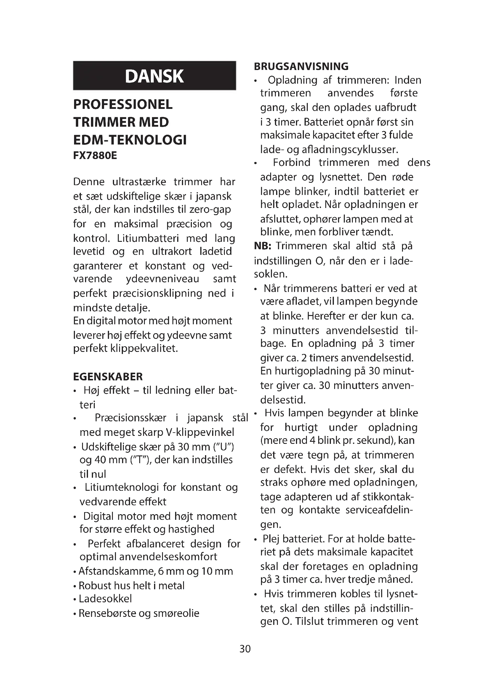 - Após a limpeza, volte a montar a cabeça de corte no seu lugar.30 PROFESSIONEL TRIMMER MED EDM-TEKNOLOGI FX7880E Denne ultrastærke trimmer har et sæt udskiftelige skær i japansk stål, der kan indstilles til zero-gap for en maksimal præcision og kontrol. Litiumbatteri med lang levetid og en ultrakort ladetid garanterer et konstant og ved- varende ydeevneniveau samt perfekt præcisionsklipning ned i mindste detalje. En digital motor med højt moment leverer høj eekt og ydeevne samt perfekt klippekvalitet. EGENSKABER