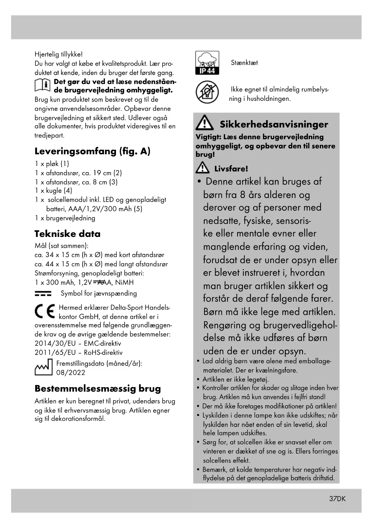 påvirkes af en anden lyskilde, f.eks. gård- eller gadebelysning, da artiklen ellers ikke tænder om aftenen. Vær opmærksom på, at mange lyskilder først tænder midt om natten afhængigt af tid og bevægelse. Før første ibrugtagning Bemærk: Artiklen er udstyret med en skum- ringssensor og en tænd/sluk-knap (5d).