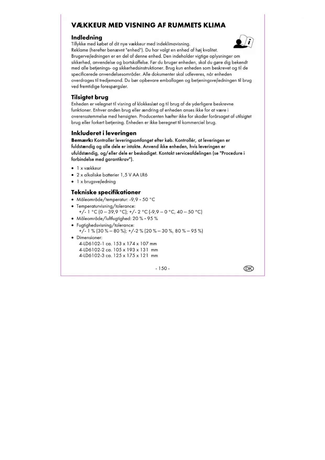 . Efter 5 min. lyder alarmen igen. Indstil lyskontakten (9) til OFF for at slukke for alarmen.- 159 - Lys/natlampe Du har mulighed for at lade lyset/natlampen skinne i forskellige niveauer, og du har forskellige lysfarver at vælge imellem. Indstil lys/natlampe Natlampefarve: Indstil lyskontakten (9) til 5 eller 15, tryk på Snooze/lys-knappen (11). Lyset/natlampen er tændt. Tryk på DOWN-/Ned-knappen (13) gentagne gange for at ændre farven på lyset. Rækkefølgen af valg er blå, cyan, grøn, gul, rød, lilla, hvid, flydende skiftende farver og gentages derefter igen fra blå. Displayet lyser altid hvidt. Varighed af belysning: Tænd lyskontakten (9) til 5 – 5 minutter eller 15 – 15 minutter, tryk på Snooze/lys- knappen (11), lys/natlampen tændes og slukkes automatisk efter den indstillede tid. Tænd og sluk lys/natlampe Indstil lyskontakten (9) til 5 eller 15, tryk på figuren ovenfor eller tryk på Snooze/lys-knappen (11) for at tænde lys/natlampe. Indstil lyskontakten (9) til OFF for at slukke for lys/natlampe. Temperatur I normal tidsvisning skal du trykke på DOWN/Ned-knappen (13), og holde den nede for at skifte mellem °C og °F. 12/24-timers visning I normal tidsvisning skal du trykke på UP/Op-knappen og holde den nede (10) for at skifte mellem 12/24 timers visning. Med 12-timers visning vises AM om morgenen (1) og PM om eftermiddagen (2) i displayet. Råd om rengøring Forkert rengøring kan beskadige enheden. Nedsænk ikke enheden i vand eller andre væsker. Brug ikke aggressive rengøringsmidler, børster med metal- eller nylonhår samt skarpe eller metalliske rengøringsgenstande såsom knive, hårde spatler og lignende. Disse kan beskadige overfladen. Rengør enheden med en blød, tør, fnugfri klud som den slags, der bruges til at rense briller.- 160 - Opbevaring Hvis enheden ikke bruges i længere tid, skal du fjerne batterierne og opbevare enheden, rengjort og beskyttet mod sollys, på et tørt, køligt sted, ideelt i originalemballagen. Forenklet EU-overensstemmelseserklæring digi-tech gmbh erklærer hermed, at vækkeuret med indeklimavisning 4-LD6102-1-3 overholder RoHS 2011/65/EU og EMC 2014/30/EU retningslinjer. Du kan downloade din betjeningsvejledning og overensstemmelseserklæring her: www.digi-tech-gmbh.com/downloads Klik derefter på forstørrelsesglasset og indtast artikelnummeret 414915_2201. Bortskaffelse Produktet og emballagematerialerne kan genbruges, bortskaffes separat for bedre behandling af affald. Du kan finde ud af, hvordan du bortskaffer det gamle produkt fra din lokale myndighed eller byrådet. Vær opmærksom på mærkningen af emballagematerialerne ved affaldssorteringen. Disse er mærket med forkortelser (a) og tal (b) med følgende betydning: 1-7: plast 20-22: papir og pap 80-98: kompositter. Bortskaffelse af det elektriske apparat Symbolet med den overstregede skraldespand betyder, at elektrisk og elektronisk udstyr ikke må bortskaffes sammen med husholdningsaffaldet. Forbrugere er lovmæssigt forpligtet til at bortskaffe elektrisk og elektronisk udstyr ved dets levetids udløb adskilt fra usorteret husholdningsaffald. Sådan sikres en miljøvenlig og ressourcebesparende genanvendelse. Batterier og akkumulatorer, der ikke er fast indkapslet i det elektriske eller elektroniske apparat, og som kan fjernes uden at beskadige det, skal adskilles fra apparatet, inden det afleveres til et indsamlingssted, og bortskaffes på et egnet bortskaffelsessted. Det samme gælder for pærer, hvis de kan fjernes fra apparatet, uden at man gør skade på det. Ejere af elektrisk og elektronisk udstyr fra private husholdninger kan aflevere det på de offentlige renovationsmyndigheders indsamlingssteder eller på de indsamlingssteder, der er oprettet af producenter eller distributører i henhold til ElektroG. Det er gratis at returnere gamle apparater. Du bedes aflevere det udtjente apparat i din LIDL-butik.- 161 - Forhandlere med et salgsareal til elektrisk og elektronisk udstyr på mindst 400 m