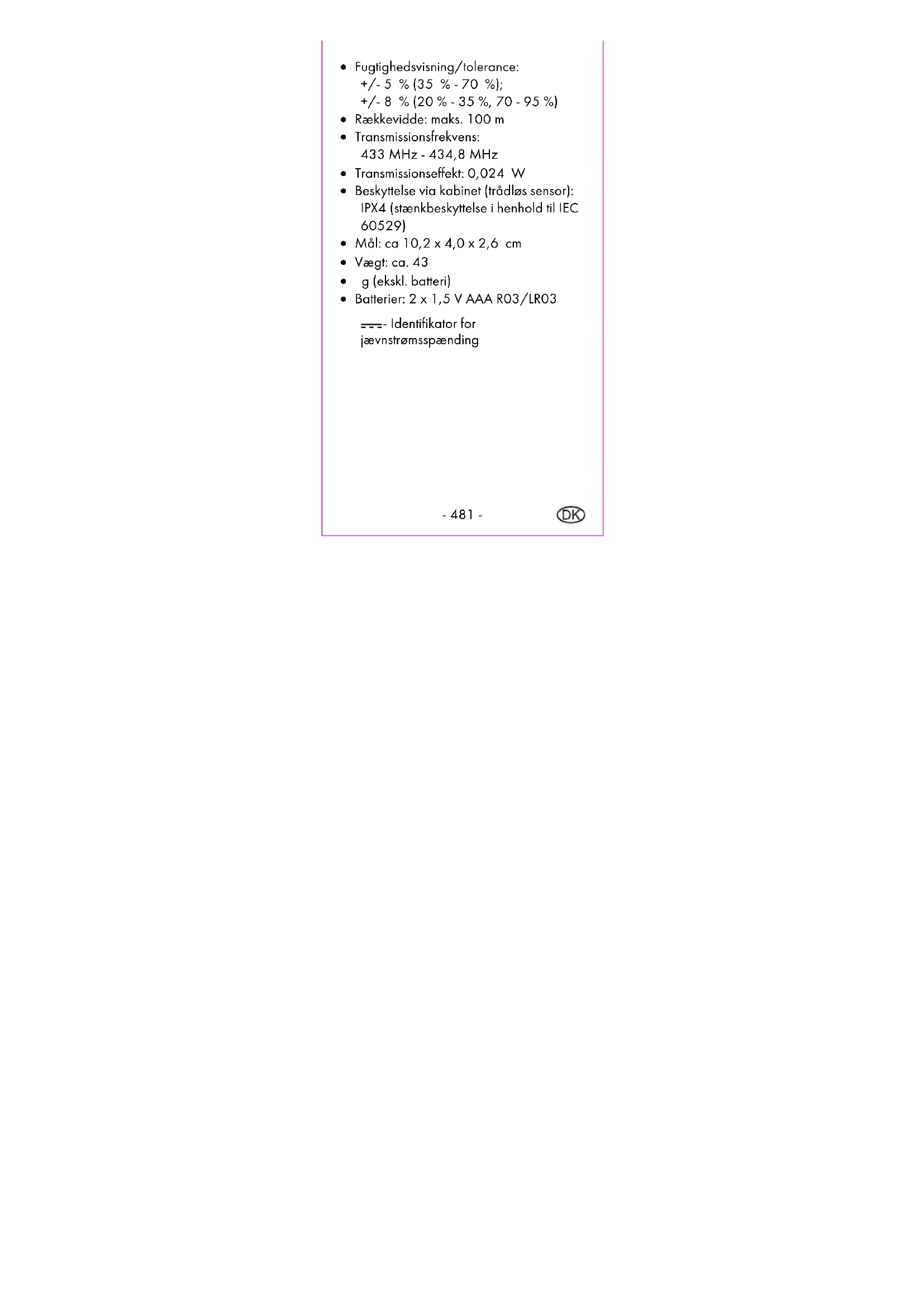 1 x betjeningsvejledning- 480 - Tekniske specifikationer Enhed DCF77 Trådløst ur Måleområde/temperatur: 0 °C - 50 °C Temperaturvisning/tolerance: +/- 2 °C (0 °C - 5 °C); +/- 1,5 °C (5 °C - 50 °C) Måleområde luftfugtighed: 20 % - 95 % Fugtighedsvisning/tolerance: +/- 5 % (35 % - 70 %); +/- 8 % (20 % - 35 %, 70 - 95 %) Mål: ca. 11,5 x 12 x 2,5 cm Vægt: ca. 177 g (ekskl. batteri) Batterier: 3 x 1,5 V AAA R03/LR03 Trådløs sensor Måleområde temperatur: -20 °C - 50 °C Temperaturvisning/tolerance: +/- 2 °C (0 °C - 5 °C); +/- 1,5 °C (5 °C - 50 °C) Måleområde luftfugtighed: 20 % - 95 %- 481 - Fugtighedsvisning/tolerance: +/- 5 % (35 % - 70 %); +/- 8 % (20 % - 35 %, 70 - 95 %) Rækkevidde: maks. 100 m Transmissionsfrekvens: 433 MHz - 434,8 MHz Transmissionseffekt: 0,024 W Beskyttelse via kabinet (trådløs sensor): IPX4 (stænkbeskyttelse i henhold til IEC 60529) Mål: ca 10,2 x 4,0 x 2,6 cm Vægt: ca. 43 g (ekskl. batteri) Batterier: 2 x 1,5 V AAA R03/LR03