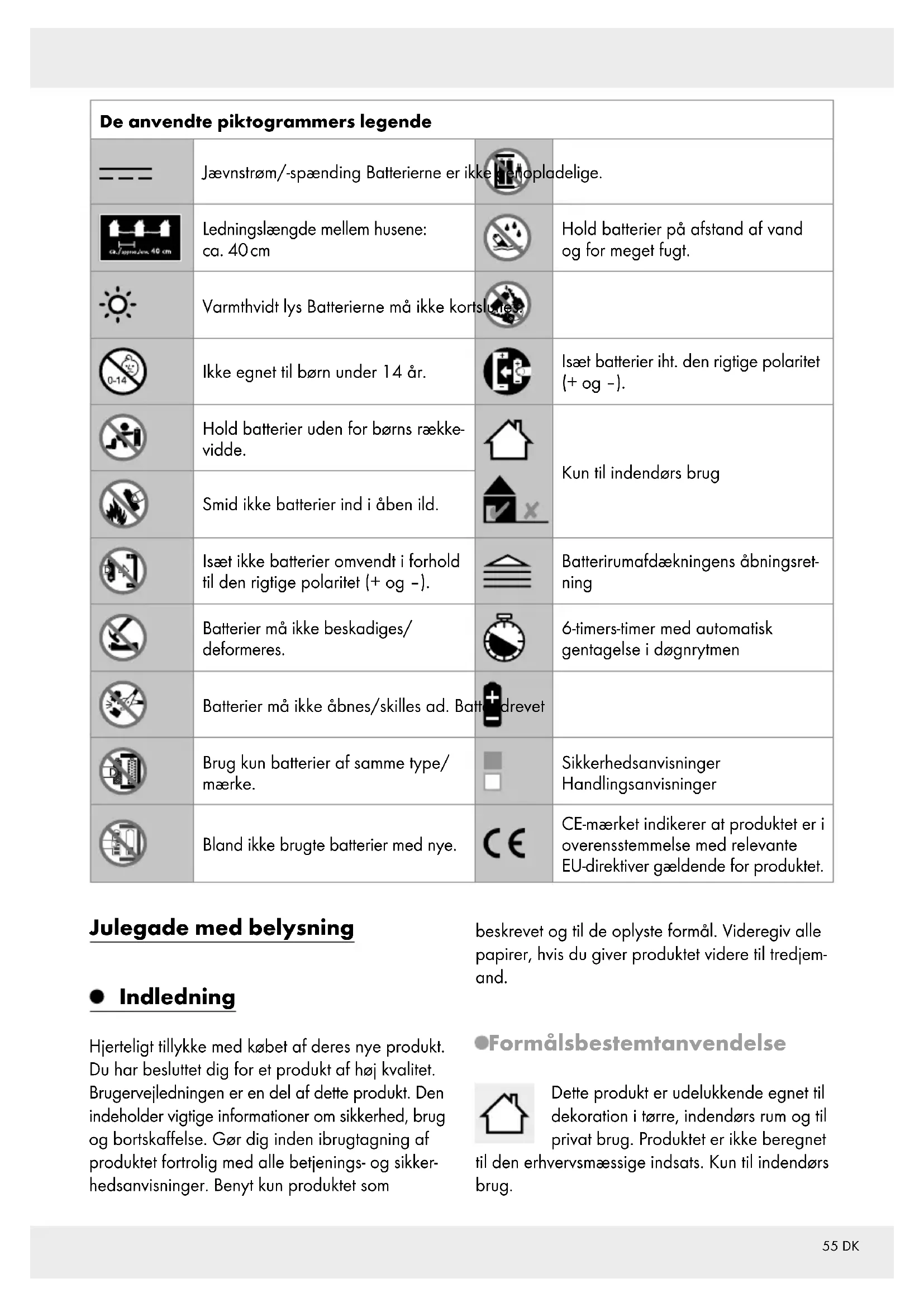OG BØRN! Lad aldrig børn lege med emballagen uden voksent opsyn. Der er fare for kvælning. Hold børn på afstand fra produktet. Produktet er ikke egnet for børn under 14 år. Dette produkt er til dekoration og ikke legetøj. Produktet bør opbevares uden for børns rækkevidde. Anvend ikke produktet, når du konstaterer nogle skader. Udsæt aldrig produktet for høje temperaturer og fugt, da produktet ellers kan tage skade. Undgå mekaniske belastninger af produktet! Henvend dig til en faguddannet elektriker ved beskadigelser, reparationer eller andre pro- blemer med produktet. Placér ikke produktet på sarte møbel-overflader, da det ellers kan ridse overfladerne. ADVARSEL! OVEROPHEDNINGSFARE! Brug ikke produktet i emballagen. Produktet indeholder ingen dele, som kan vedligeholdes af forbrugeren. LEDérne kan ikke udskiftes. Hvis LEDérne i slutningen af deres levetid er udtjente, skal hele produktet erstattes. Produktet må ikke forbindes elektrisk med andre lyskæder. Tilslut produktet aldrig direkte til en 230 V-til- slutning. Fastgør ikke yderligere genstande på produkte