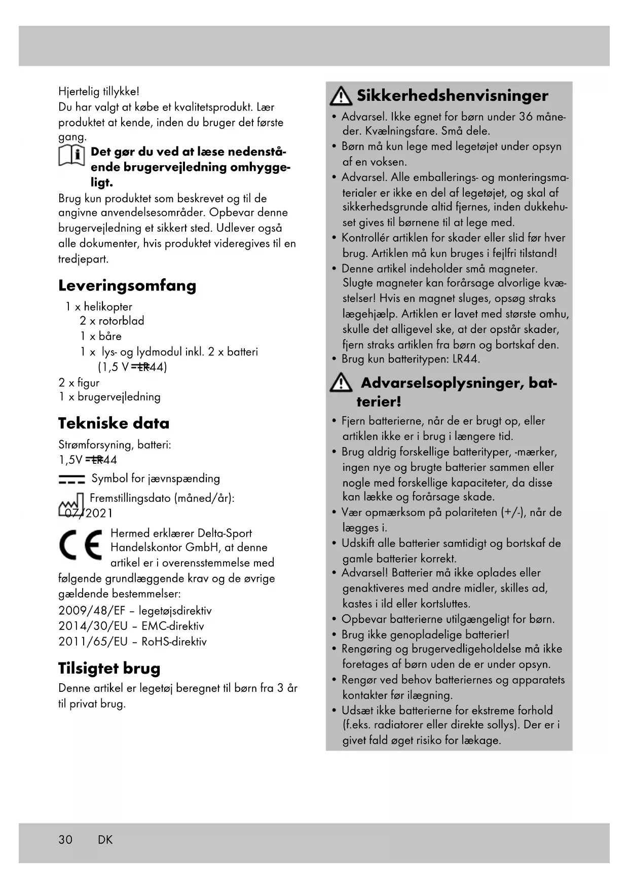 på helikopteren med skinnen (2b). Montering af rotorblade Sæt rotorbladene (1c) på helikopterens (1) holder (1b) et ad gangen. Opbevaring, rengøring Opbevar altid artiklen tør, ren, uden batterier og ved stuetemperatur, når den ikke er i brug. Tør den kun af med en tør rengøringsklud. VIGTIGT! Må aldrig rengøres med skrappe rengøringsmidler. Henvisninger vedr. bortskaffelse Med henblik på at beskytte miljøet bedst muligt, er det vigtigt, at du ikke smider dit produkt ud sammen med husholdningsaf- faldet, når det ikke længere kan anvendes, men i stedet sørger for at bortskaffe det på en forsvarlig måde. For at få oplysninger om genbrugsstationer og deres åbningstider, bedes du kontakte deres ansvarlige administrati- on. Defekte eller brugte batterier, genopladelige eller ej, skal genbruges i overensstemmelse med direktiv 2006/66/EF samt alle ændringer heraf. Du skal indlevere batterierne, genopladelige eller ej, og/eller produktet hos de genbrugsstati- oner, der findes i dit lokalområde. Emballagema- terialer som f.eks. plasticposer er ikke beregnede til børn. Opbevar emballagematerialet utilgæn- geligt for børn. Miljøskader på grund af ukorrekt bortskaffelse af batterierne, genopladeli- ge eller ej! Batterier, genopladelige eller ej, må ikke bortskaffes sammen med husholdningsaffaldet. De kan indeholde giftige tungmetaller, og er derfor underlagt den samme håndtering som farligt affald. Tungmetallernes kemiske symboler er som følger: Cd = cadmium, Hg = kviksølv, Pb = bly. Indlever derfor de brugte batterier, genopladelige eller ej, på en af de kommunale genbrugsstationer. Bortskaf produktet og emballagemateria- lerne miljørigtigt.32 Vær opmærksom på emballagemateria- lernes mærkning under affaldssorterin- gen. Disse er markeret med forkortelser (a) og tal (b), der har følgende betydning: 1-7: Kunststoffer/20-22: Papir og pap/80-98: Kompositmaterialer. Produktet og emballagematerialerne kan genbruges, hvorfor du bedes bortskaffe dem separat for at opnå en bedre affaldshåndtering. Triman-logoet er kun gældende for Frankrig. De forskellige bortskaffelsesmuligheder, der eksiste- rer for det udtjente produkt, kan du få mere infor- mation om hos kommune- eller byforvaltningen. Oplysninger om garanti og servicehåndtering Varen er fremstillet med største omhu og under løbende kontrol. DELTA-SPORT HANDELS- KONTOR GmbH yder private slutkunder tre års garanti på varen fra købsdato (Garantifrist) i henhold til følgende bestemmelser. Garantien gælder kun for materiale- og fremstillingsfejl. Garantien omfatter ikke dele, der er udsat for normal slid og derfor skal betragtes som sliddele (f.eks. batterier) og ikke skrøbelige dele, f.eks. kontakter, genopladelige batterier eller dele, der er fremstillet af glas. Garantien kan ikke gøres gældende, hvis varen er blevet anvendt ukorrekt eller uagtsomt eller til andre formål end det tilsigtede eller i det tilsigtede omfang. Garantien bortfalder ligeledes ved manglende overholdelse af anvisningerne i betjeningsvejledningen. Kunden skal kunne påvise, at der er tale om materiale- eller fremstil- lingsfejl og ikke fejl som følge af ovenstående omstændigheder. Garantien kan kun gøres gældende i garanti- perioden mod fremvisning af original kvittering. Gem derfor den originale kvittering Garantipe- rioden forlænges ikke i tilfælde af reparation i henhold til garantien, den lovpligtige garanti eller pr. kulance. Dette gælder også for udskifte- de og reparerede dele. I tilfælde af klager er det muligt at kontakte nedenstående servicelinje eller kontakte os pr. e-mail. Ved garantisager vil vi efter eget skøn reparere varen uden beregning, ombytte varen eller refundere købsprisen. Der er ingen yderli- gere rettigheder under garantien. Dine lovmæssige rettigheder, herunder navnlig garantikrav over for sælger, indskrænkes ikke som følge af denne garanti. IAN: 359783_2101 Service Danmark Tel.: 32 710005 E-Mail: deltasport@lidl.dk DK33343506.25.2021 / AM 10:29 IAN 359783_2101