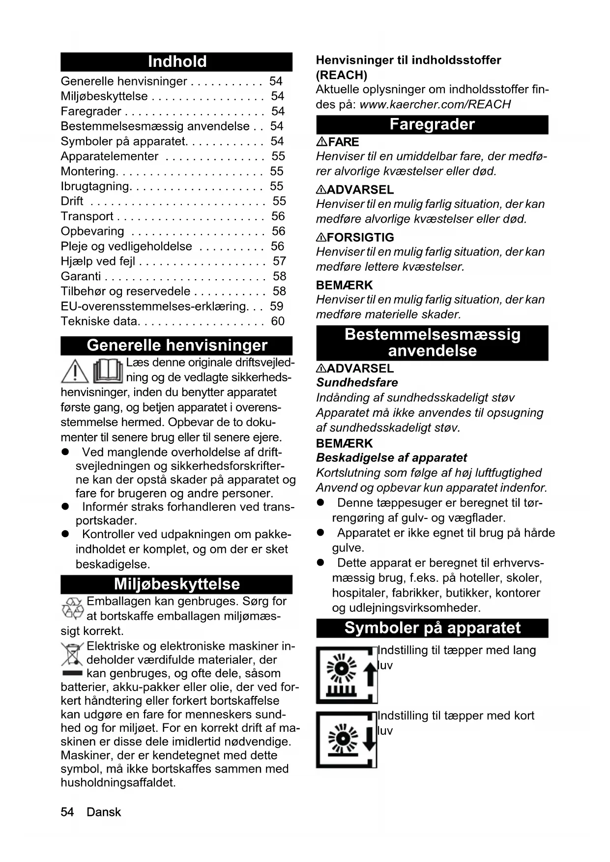 - H05VV-F 2x1,0 H05VV-F 2x1,0 Referência (EU/GB) 6.650-913.0 6.650-913.0 Comprimento do cabo m 0,1 0,154 Dansk Indhold Generelle henvisninger Læs denne originale driftsvejled- ning og de vedlagte sikkerheds- henvisninger, inden du benytter apparatet første gang, og betjen apparatet i overens- stemmelse hermed. Opbevar de to doku- menter til senere brug eller til senere ejere. Ved manglende overholdelse af drift- svejledningen og sikkerhedsforskrifter- ne kan der opstå skader på apparatet og fare for brugeren og andre personer. Informér straks forhandleren ved trans- portskader. Kontroller ved udpakningen om pakke- indholdet er komplet, og om der er sket beskadigelse. Miljøbeskyttelse Emballagen kan genbruges. Sørg for at bortskaffe emballagen miljømæs- sigt korrekt. Elektriske og elektroniske maskiner in- deholder værdifulde materialer, der kan genbruges, og ofte dele, såsom batterier, akku-pakker eller olie, der ved for- kert håndtering eller forkert bortskaffelse kan udgøre en fare for menneskers sund- hed og for miljøet. For en korrekt drift af ma- skinen er disse dele imidlertid nødvendige. Maskiner, der er kendetegnet med dette symbol, må ikke bortskaffes sammen med husholdningsaffaldet. Henvisninger til indholdsstoffer (REACH) Aktuelle oplysninger om indholdsstoffer fin- des på: www.kaercher.com/REACH Faregrader FARE Henviser til en umiddelbar fare, der medfø- rer alvorlige kvæstelser eller død. 몇 ADVARSEL Henviser til en mulig farlig situation, der kan medføre alvorlige kvæstelser eller død. 몇 FORSIGTIG Henviser til en mulig farlig situation, der kan medføre lettere kvæstelser. BEMÆRK Henviser til en mulig farlig situation, der kan medføre materielle skader. Bestemmelsesmæssig anvendelse 몇 ADVARSEL Sundhedsfare Indånding af sundhedsskadeligt støv Apparatet må ikke anvendes til opsugning af sundhedsskadeligt støv. BEMÆRK Beskadigelse af apparatet Kortslutning som følge af høj luftfugtighed Anvend og opbevar kun apparatet indenfor. Denne tæppesuger er beregnet til tør- rengøring af gulv- og vægflader. Apparatet er ikke egnet til brug på hårde gulve. Dette apparat er beregnet til erhvervs- mæssig brug, f.eks. på hoteller, skoler, hospitaler, fabrikker, butikker, kontorer og udlejningsvirksomheder. Symboler på apparatet Generelle henvisninger p. 54