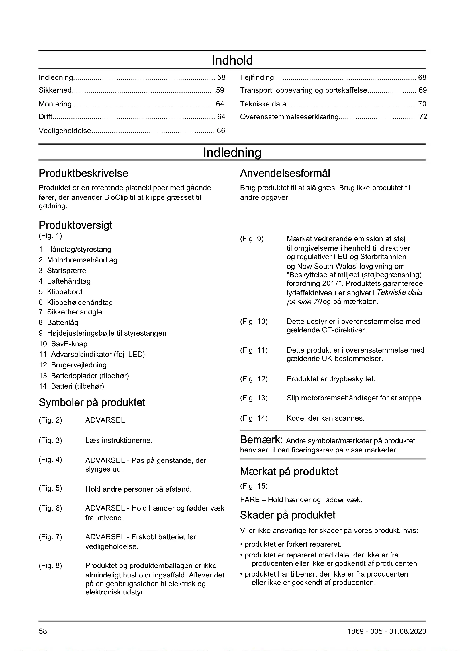 Symboler på produktet (Fig. 2) ADVARSEL (Fig. 3) Læs instruktionerne. (Fig. 4) ADVARSEL - Pas på genstande, der slynges ud. (Fig. 5) Hold andre personer på afstand. (Fig. 6) ADVARSEL - Hold hænder og fødder væk fra knivene. (Fig. 7) ADVARSEL - Frakobl batteriet før vedligeholdelse. (Fig. 8) Produktet og produktemballagen er ikke almindeligt husholdningsaffald. Aflever det på en genbrugsstation til elektrisk og elektronisk udstyr. (Fig. 9) Mærkat vedrørende emission af støj til omgivelserne i henhold til direktiver og regulativer i EU og Storbritannien og New South Wales' lovgivning om "Beskyttelse af miljøet (støjbegrænsning) forordning 2017". Produktets garanterede lydeffektniveau er angivet i Tekniske data på side 70 og på mærkaten. (Fig. 10) Dette udstyr er i overensstemmelse med gældende CE-direktiver. (Fig. 11) Dette produkt er i overensstemmelse med gældende UK-bestemmelser. (Fig. 12) Produktet er drypbeskyttet. (Fig. 13) Slip motorbremsehåndtaget for at stoppe. (Fig. 14) Kode, der kan scannes. Bemærk: Andre symboler/mærkater på produktet henviser til certificeringskrav på visse markeder. Mærkat på produktet (Fig. 15) FARE – Hold hænder og fødder væk. Skader på produktet Vi er ikke ansvarlige for skader på vores produkt, hvis: