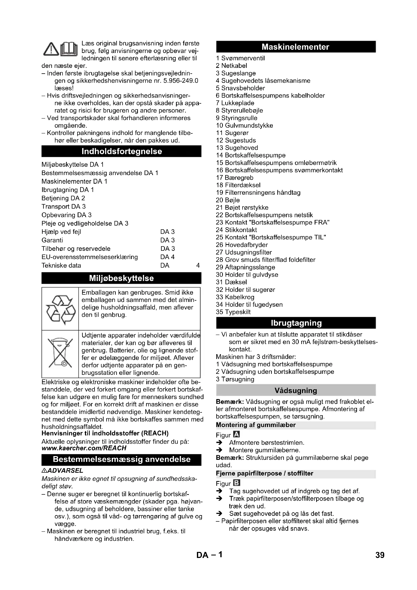 Refª Comprimento do cabo EU 6.649-413.0 10 m CH 6.649-254.0 10 m 38 PT– 1 Læs original brugsanvisning inden første brug, følg anvisningerne og opbevar vej- ledningen til senere efterlæsning eller til den næste ejer. – Inden første ibrugtagelse skal betjeningsvejlednin- gen og sikkerhedshenvisningerne nr. 5.956-249.0 læses! – Hvis driftsvejledningen og sikkerhedsanvisninger- ne ikke overholdes, kan der opstå skader på appa- ratet og risici for brugeren og andre personer. – Ved transportskader skal forhandleren informeres omgående. – Kontroller pakningens indhold for manglende tilbe- hør eller beskadigelser, når den pakkes ud. Elektriske og elektroniske maskiner indeholder ofte be- standdele, der ved forkert omgang eller forkert bortskaf- felse kan udgøre en mulig fare for menneskers sundhed og for miljøet. For en korrekt drift af maskinen er disse bestanddele imidlertid nødvendige. Maskiner kendeteg- net med dette symbol må ikke bortskaffes sammen med husholdningsaffaldet. Henvisninger til indholdsstoffer (REACH) Aktuelle oplysninger til indholdsstoffer finder du på: www.kaercher.com/REACH 몇 ADVARSEL Maskinen er ikke egnet til opsugning af sundhedsska- deligt støv. – Denne suger er beregnet til kontinuerlig bortskaf- felse af store væskemængder (skader pga. højvan- de, udsugning af beholdere, bassiner eller tanke osv.), som også til våd- og tørrengøring af gulve og vægge. – Maskinen er beregnet til industriel brug, f.eks. til håndværkere og industrien. 1 Svømmerventil 2 Netkabel 3 Sugeslange 4 Sugehovedets låsemekanisme 5 Snavsbeholder 6 Bortskaffelsespumpens kabelholder 7 Lukkeplade 8 Styrerullebøjle 9 Styringsrulle 10 Gulvmundstykke 11 Sugerør 12 Sugestuds 13 Sugehoved 14 Bortskaffelsespumpe 15 Bortskaffelsespumpens omløbermøtrik 16 Bortskaffelsespumpens svømmerkontakt 17 Bæregreb 18 Filterdæksel 19 Filterrensningens håndtag 20 Bøjle 21 Bøjet rørstykke 22 Bortskaffelsespumpens netstik 23 Kontakt "Bortskaffelsespumpe FRA" 24 Stikkontakt 25 Kontakt "Bortskaffelsespumpe TIL" 26 Hovedafbryder 27 Udsugningsfilter 28 Grov smuds filter/flad foldefilter 29 Aftapningsslange 30 Holder til gulvdyse 31 Dæksel 32 Holder til sugerør 33 Kabelkrog 34 Holder til fugedysen 35 Typeskilt – Vi anbefaler kun at tilslutte apparatet til stikdåser som er sikret med en 30 mA fejlstrøm-beskyttelses- kontakt. Maskinen har 3 driftsmåder: 1 Vådsugning med bortskaffelsespumpe 2 Vådsugning uden bortskaffelsespumpe 3 Tørsugning Bemærk: Vådsugning er også muligt med frakoblet el- ler afmonteret bortskaffelsespumpe. Afmontering af bortskaffelsespumpen, se tørsugning. Figur Afmontere børstestrimlen. Montere gummilæberne. Bemærk: Struktursiden på gummilæberne skal pege udad. Figur Tag sugehovedet ud af indgreb og tag det af. Træk papirfilterposen/stoffilterposen tilbage og træk den ud. Sæt sugehovedet på og lås det fast. – Papirfilterposen eller stoffilteret skal altid fjernes når der opsuges våd snavs. Indholdsfortegnelse Miljøbeskyttelse DA 1 Bestemmelsesmæssig anvendelse DA 1 Maskinelementer DA 1 Ibrugtagning DA 1 Betjening DA 2 Transport DA 3 Opbevaring DA 3 Pleje og vedligeholdelse DA 3 Hjælp ved fejl DA 3 Garanti DA 3 Tilbehør og reservedele DA 3 EU-overensstemmelseserklæring DA 4 Tekniske data DA 4 Miljøbeskyttelse Emballagen kan genbruges. Smid ikke emballagen ud sammen med det almin- delige husholdningsaffald, men aflever den til genbrug. Udtjente apparater indeholder værdifulde materialer, der kan og bør afleveres til genbrug. Batterier, olie og lignende stof- fer er ødelæggende for miljøet. Aflever derfor udtjente apparater på en gen- brugsstation eller lignende. Bestemmelsesmæssig anvendelse Maskinelementer Ibrugtagning Vådsugning Montering af gummilæber Fjerne papirfilterpose / stoffilter 39DA– 2 Figur Tag sugehovedet ud af indgreb og tag det af. Fjerne membranfilteret. Sæt sugehovedet på og lås det fast. – Membranfilteret skal altid fjernes når der opsuges våd snavs. Åbn filterafdækningen. Fjern det flade foldefilter. Monter grovs smuds filteret. Luk filterafdækningen. Den skal gå hørbart i ind- greb. Figur Fjern påfyldningsdæklset. Tilkobl bortskaffelsesslangen (nominel bredde 3/4“ eller større). 몇 FORSIGTIG Følg de lokale bestemmelser vedrørende behandling af spildevand. Figur Det forurenede vand drænes over afløbsslangen. BEMÆRK Under sugningen må grov smuds filteret aldrig fjernes. – Vådsugning uden bortskaffelsespumpe: Det anbe- fales at anvende en special filterpose (våd) (se fil- tersystemer). – Når det maksimale væskeniveau er nået, slukker apparatet automatisk. – Efter opsugning af våd snavs er afsluttet: Rens og tør svømmeren, beholderen og evt. bortskaffelses- pumpen med en fugtet klud. BEMÆRK Før tørsugningen: Afmonter bortskaffelsespumpen og monter det flade foldefilter. Bemærk: Ved tørsugningen skal der generelt anven- des et fladt foldefilter. BEMÆRK Under sugningen må det flade foldefilter aldrig fjernes. – Hvis der opsuges fintstøv, kan der yderligere bru- ges en papirfilterpose, et stoffilter eller et mem- branfilter. Tag bortskaffelsespumpens netstik ud. Tag sugehovedet ud af indgreb og tag det af. Figur Skru bortskaffelsespumpens omløbermøtrik af. Tag bortskaffelsespumpens kabelholder ud og sæt lukkepladen på. Tag bortskaffelsespumpe og kunststofindsats ud af beholderen samtidigt, da bortskaffelsespumpens svømmerafbryder er fastgjort på kunststofindsat- sen og ellers kan blive beskadiget. Figur Monter lukkepladen i stedet for bortskaffelsesslan- gen. Sæt sugehovedet på og lås det fast. Bemærk: Et fladt foldefilter leveres ikke med. Åbn filterafdækningen. Tag grov smuds filteret ud. Monter det flade foldefilter. Luk filterafdækningen. Den skal gå hørbart i ind- greb. Figur Afmonter gummilæberne. Monter børsterne. Bemærk: En papirfilterpose, hhv. et stoffilter leveres ikke med. Figur Tag sugehovedet ud af indgreb og tag det 