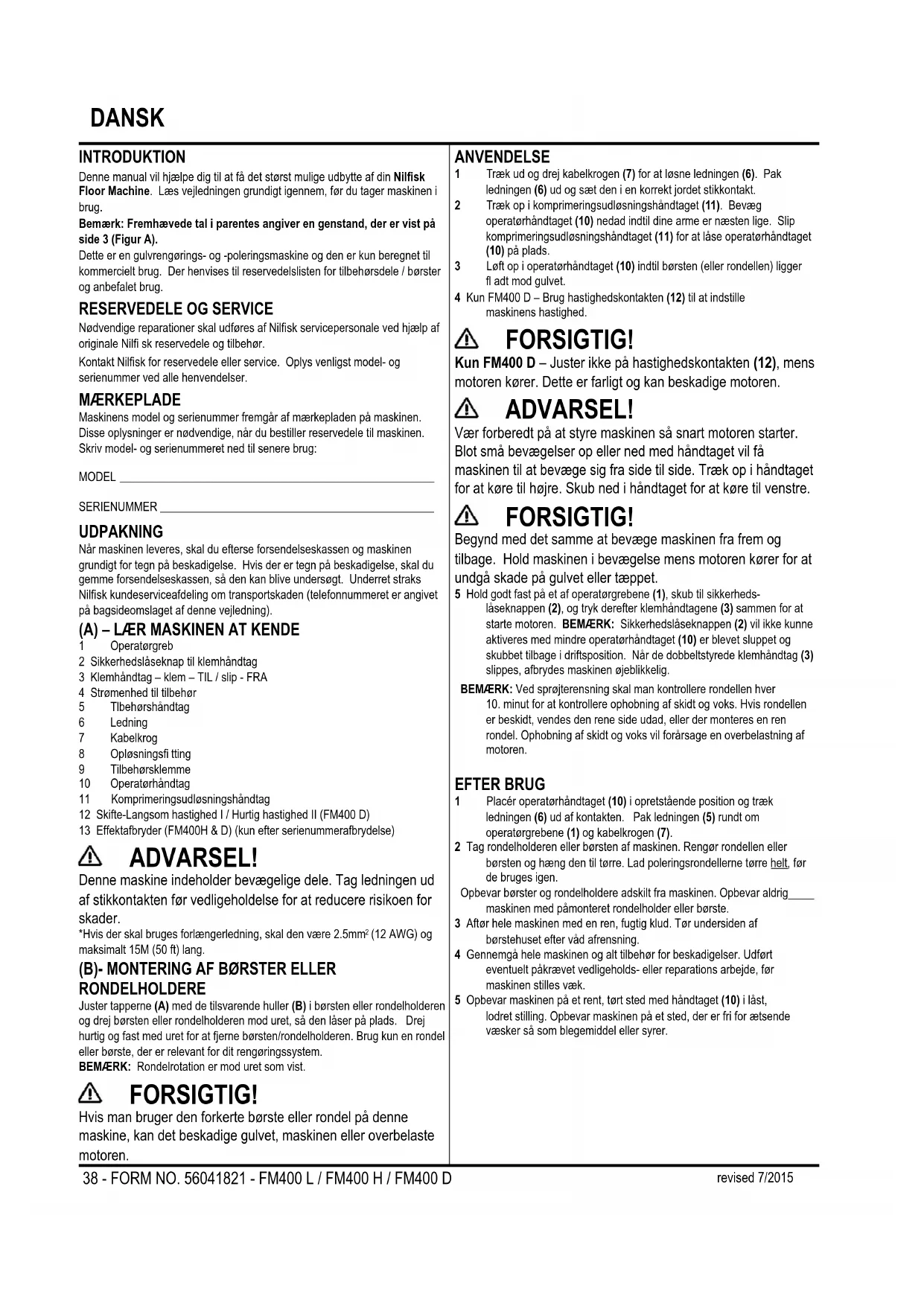 revised 7/201538 - FORM NO. 56041821 - FM400 L / FM400 H / FM400 D DANSK INTRODUKTION Denne manual vil hjælpe dig til at få det størst mulige udbytte af din Nilfi sk Floor Machine. Læs vejledningen grundigt igennem, før du tager maskinen i brug.Bemærk: Fremhævede tal i parentes angiver en genstand, der er vist på side 3 (Figur A).Dette er en gulvrengørings- og -poleringsmaskine og den er kun beregnet til kommercielt brug. Der henvises til reservedelslisten for tilbehørsdele / børster og anbefalet brug.
