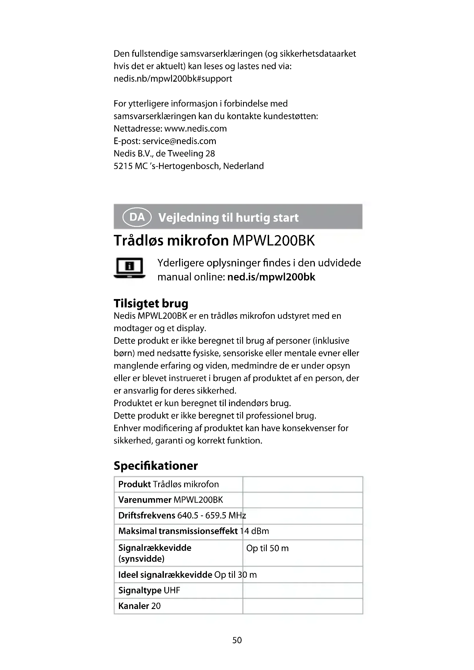, produceret i Kina, er blevet testet i overensstemmelse med alle relevante CE-standarder og regler, og at alle test er beståede. Dette indebærer også direktiv 2014/53/EU (radioudstyrsdirektivet). Den komplette overensstemmelseserklæring (og sikkerhedsdatabladet, hvis gældende) kan ndes og downloades via: nedis.da/mpwl200bk#support For yderligere information angående denne overholdelse, kontakt kundeservice: Web: www.nedis.com E-mail: service@nedis.com Nedis B.V., de Tweeling 28 5215 MC ’s-Hertogenbosch, the Netherlands