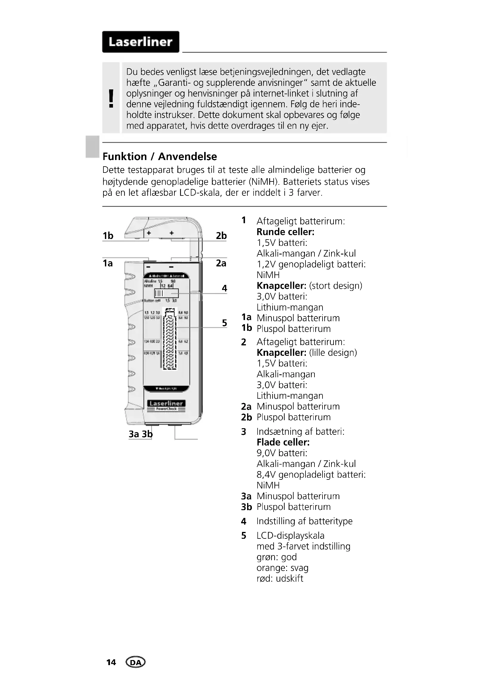 Anmærkning vedr. brug Skalaen klassificerer anvendelighedsgraden af batterier i mobile apparater i kategorierne „god“, „svag“ og „udskift“. Disse klassifikationer er fastlagt efter de generelle gennemsnits- værdier ved konstant forbrug og kan afvige for apparater med særlige strømforbrugsforhold. Især apparater med høje, kortvarige strømspidser og/eller batterier af dårlig kvalitet skal under særlige omstændigheder udskiftes tidligere, end displayet viser. Apparater med moderne strømstyring kan som regel også arbejde med kraftigt afladede batterier. I sådanne tilfælde kan man forsøge at fortolke LCD-displayet i forhold til funktionstiden for de(t) specielle apparat / batterier for at sikre optimal udnyttelse af batterierne.