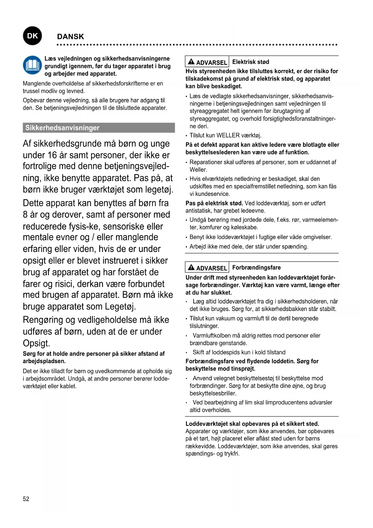 - Bring ikke brandbare genstande, væsker eller gasser i nærheden af varmt loddeværktøj. Netkablet må kun tilsluttes de dertil godkendte stikdåser eller adaptere. Kontroller,omnetspændingenstemmer overensmedoplysningernepåtypeskiltet.Tilslutkun maskinetilstikdåsenislukkettilstand. Anvend ikke kablet til formål, som det ikke er beregnet til.Bær aldrig apparatet i kablet. Benyt ikke kablet til at trække stikket ud af stikkontakten. Beskyt kablet mod varme, olie og skarpe kanter.. Vær opmærksom. Vær opmærksom på, hvad du foretager dig. Brug din sunde fornuft under arbejdet. Loddeværktøjet bør ikke anvendes, hvis man er ukoncentreret. Undgå unaturlige kropsstillinger. Indret arbejdspladsen ergonomiske rigtigt. Undgå en forkert kropsstilling under arbejdet, da dette kan medføre holdningsskader. Kun loddeværktøj i fejlfri stand må benyttes. Beskyttelse- sanordninger må ikke deaktiveres. Fejl og defekter skal afhjælpes omgående. Hver gang før brug af apparatet / værktøjet skal du omhyggeligt undersøge beskyttelsesanordninger for fejlfri og korrekt funktion. Kont- rollér, om de bevægelige dele fungerer fejlfrit og ikke sidder fast, eller om dele er beskadiget. Alle dele skal monteres korrekt og opfylde alle betingelser for at sikre en fejlfri drift af apparatet. Anvend det rigtige værktøj. Anvend kun tilbehør eller hjæl- peudstyr, som fremgår af tilbehørslisten eller er godkendt af producenten. Anvend kun WELLER tilbehør eller hjælpeud- styr til originale WELLER apparater. Hvis du anvender andet værktøj eller tilbehør, kan det medføre fare for personskader for dig. Sørg for at sikre værktøjet. Anvend spændeanordninger til at holde emnet fast. Anvend en udsugningsanordning til lodderør. Hvis der er mulighed for tilslutning af udsugningsanordninger til lodderøg, skal du kontrollere, at disse er tilsluttet og anvendes korrekt. Tiltænkt Formål Forsyningsenhed til WELLER WX-loddeværktøj. Anvend altid loddestationen / aoddestationen / varmluftstationen i henhold til det i betjeningsvejledningen beskrevne formål til lodning og aodning under de i vejledningen beskrevne betingelser. ADVARSEL Brændbare gasser og væsker må ikke udsuges. Apparatet må kun bruges med de dertil beregnede lterpatroner, som skal være indsat korrekt. Udskift fyldte lterpatroner. Dette apparat må kun anvendes ved stuetemperatur og indendørs. Skal beskyttes mod fugt og direkte sollys. Brugergrupper På grund af varierende høje risici og potentielle farer må visse arbejdstrin kun udføres af uddannede fagfolk. Arbejdstrin Brugergrupper Fastsættelse af loddepa- rametre Fagpersonale med teknisk uddannelse Udskiftning af elektriske af reservedele Elektriker Fastsættelse af vedligehol- delsesintervaller Sikkerhedsrepræsentant Betjening Filterskift Lægmænd Betjening Filterskift Udskiftning af elektriske af reservedele Tekniske lærlinge under vejledning og opsyn af en uddannet fagmand Pleje og vedligeholdelse ADVARSEL Træk stik ud af stikdåsen før alle arbejder på maskinen. Lad apparatet køle af. Rengør betjeningspanelet med en egnet rengøringsklud, når det er tilsmudset. Luk interfaces, der ikke anvendes, med en lukkekappe. Kontrollér regelmæssigt alle tilsluttede kabler og slanger. Beskadigede elværktøjer skal omgående tages ud af drift. ADVARSEL Forbrændingsfare