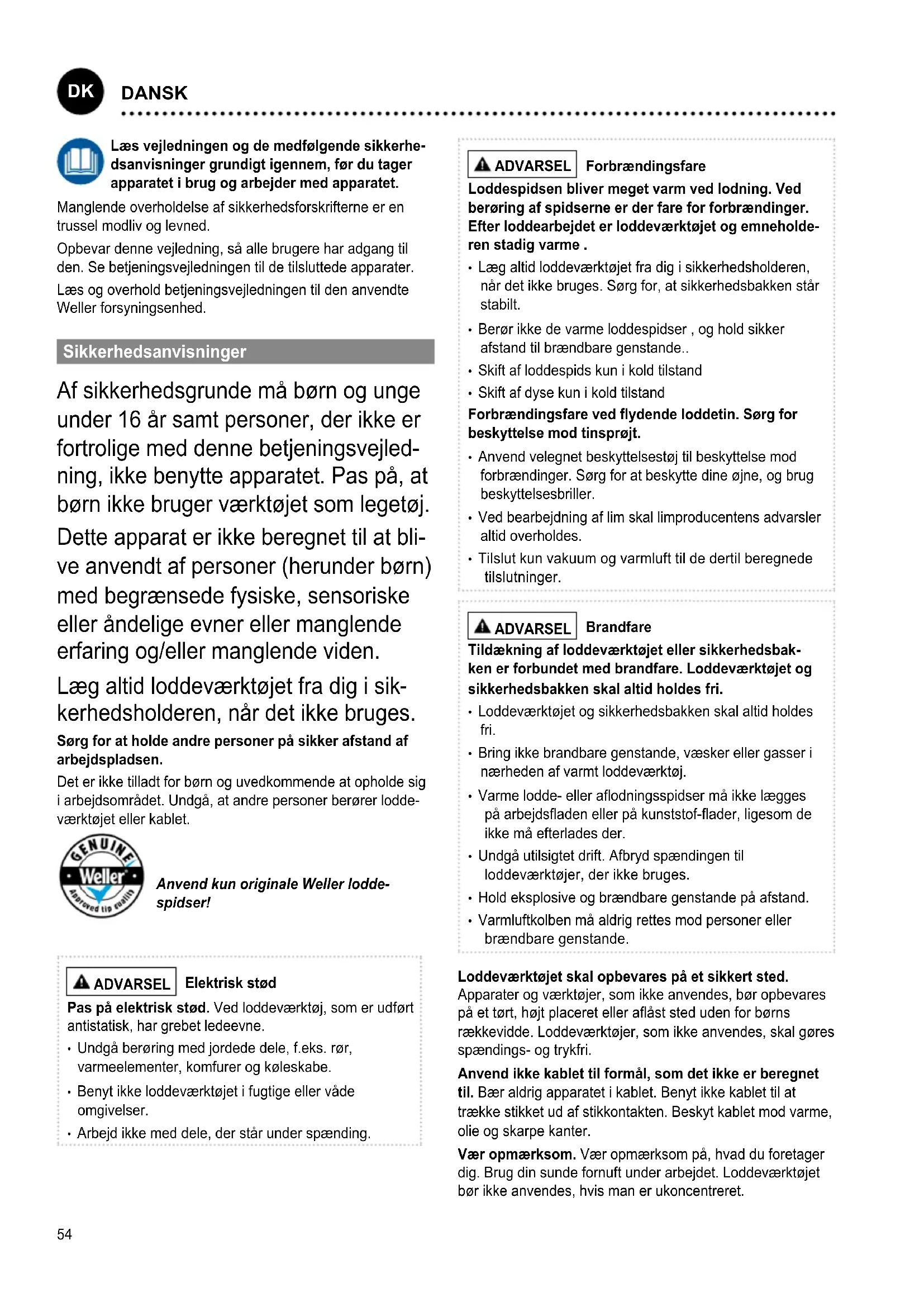 kerhedsholderen, når det ikke bruges. Sørg for at holde andre personer på sikker afstand af arbejdspladsen. Det er ikke tilladt for børn og uvedkommende at opholde sig i arbejdsområdet. Undgå, at andre personer berører lodde- værktøjet eller kablet. Anvend kun originale Weller lodde- spidser! ADVARSEL Elektrisk stød Pas på elektrisk stød. Ved loddeværktøj, som er udført antistatisk, har grebet ledeevne.