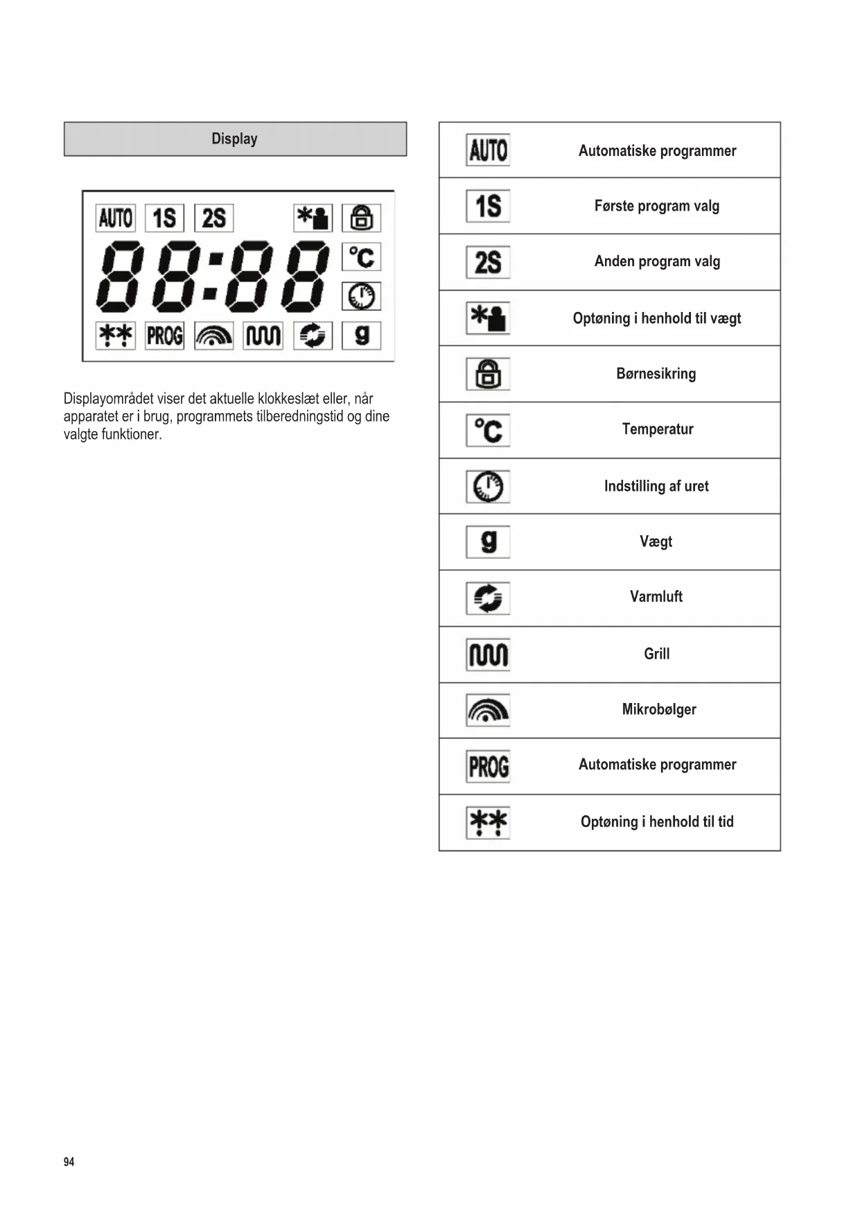 DK93 142 x 208 mm Kontrolpanelets funktioner Knap Funktion Tastelyd og Børnesikring Favorit retter & ur Kvik-start / Øg tilberedningstiden med 30 sekunder Mikrobølger Grill Varmluftsfunktion Afbryd / Stop Drejeknap Funktion Tryk Start / Kvik-start Drej Tidsindstilling &Automatisk tilberedningsprogram94 142 x 208 mm Display Displayområdet viser det aktuelle klokkeslæt eller, når apparatet er i brug, programmets tilberedningstid og dine valgte funktioner. Automatiske programmer Første program valg Anden program valg Optøning i henhold til vægt Børnesikring Temperatur Indstilling af uret Vægt Varmluft Grill Mikrobølger Automatiske programmer Optøning i henhold til tid95 142 x 208 mm Sikkerhedsforskrifter Vigtige sikkerhedsforskrifter Læs venligst brugsanvisningen omhyggeligt igennem og gem den til senere reference. Tilslutning til lysnettet Mikrobølgeovnen bør kun tilsluttes til et stik med jordforbindelse, der er installeret i overensstemmelse med el-regulativet. Spændingen på typeskiltet skal svare til spændingen i el-installationen. Dette produkt overholder direktiverne, som gælder for CE-mærkning. Placering af mikrobølgeovnen ∙ Placer altid mikrobølgeovnen på en stabil, plan og varmefast overade og sørg for at den ikke udsættes for andre varmekilder eller meget høj fugtighed. ∙ Benyt ikke apparatet udendørs. ∙ Fødderne under ovnen må ikke fjernes. ∙ Der skal altid være tilstrækkelig ventilation. Placer ikke andre ting ovenpå mikrobølgeovnen, og sørg for at overholde følgende minimumsafstande mellem ovn og vægge eller andre genstande: Siderne: 7,5 cm Bagpå: 7,5 cm Top: 30,0 cm Apparatet må ikke installeres inde i et skab; når mikrobølgeovnen skal placeres bør man også sikre sig at den ikke står tæt op under et skab eller noget tilsvarende. Vigtige noter ∙ Advarsel: Nogle typer af fødevarer er letantændelige. Lad aldrig under nogen omstændigheder ovnen være uden opsyn, når mikrobølge - , grill - , varmluft – eller kombinationsfunktionerne er i brug. ∙ Denne mikrobølgeovn er kun beregnet til optøning, opvarmning eller tilberedning af mad. Advarsel: Forsøg aldrig på at tørre mad eller tøj, eller på at opvarme varmepuder, indesko, svampe, våde rengøringsklude el. lign., da dette kan forårsage tilskadekomst, brandsår eller brand. ∙ Ansvar accepteres ikke, hvis ødelæggelse skyldes ukorrekt brug, eller hvis denne brugsanvisning ikke er fulgt. ∙ Benyt kun køkkenudstyr som er egnet til brug i mikrobølgeovne. Brug aldrig metalbeholdere ved opvarmning af mad eller drikkevarer ved hjælp af mikrobølgefunktionen. For detaljeret information, se venligst afsnittet ’Benyt altid velegnede køkkenredskaber’.96 142 x 208 mm ∙ Apparatet er ikke beregnet til brug ved hjælp af en ekstern timer eller et separat fjernstyringssystem. ∙ Dette apparat kan benyttes af børn (som er mindst 8 år) og af personer med reducerede fysiske, sensoriske eller mentale evner, eller mangel på erfaring eller viden, såfremt de har fået vejledning og instruktion i brugen af dette apparat og fuldt ud forstår alle farer og forholdsregler vedrørende sikkerheden som brug af apparatet medfører. ∙ Børn må aldrig få lov til at lege med apparatet. ∙ Børn må aldrig få lov til at udføre rengørings- eller vedligeholdelsesarbejde på dette apparat, medmindre de er under opsyn og mindst 8 år gamle. ∙ Apparatet og dets ledning må altid holdes væk fra børn som er yngre en 8 år. ∙ For at undgå elektrisk stød bør apparatet ikke rengøres med vand og heller ikke nedsænkes i vand. ∙ Advarsel: Som følge af de høje temperaturer der opstår ved brug af grill- og/eller varmluftsfunktionerne, må børn ikke benytte apparatet medmindre de er under nøje opsyn af en voksen. ∙ Når kombinationsfunktionerne eller grill- og/eller varmluftsfunktionerne benyttes, skal man være ekstra påpasselig med ikke at berøre de indvendige varmeelementer. ∙ Brug heller aldrig dampapparater til rengøringen. ∙ Sluk altid apparatet og tag stikket ud af stikkontakten: - inden rengøring, - tilfælde af fejlfunktion. - efter brug. ∙ Træk aldrig i selve ledningen, når ledningen tages ud af stikkontakten; tag altid fat i selve stikket.