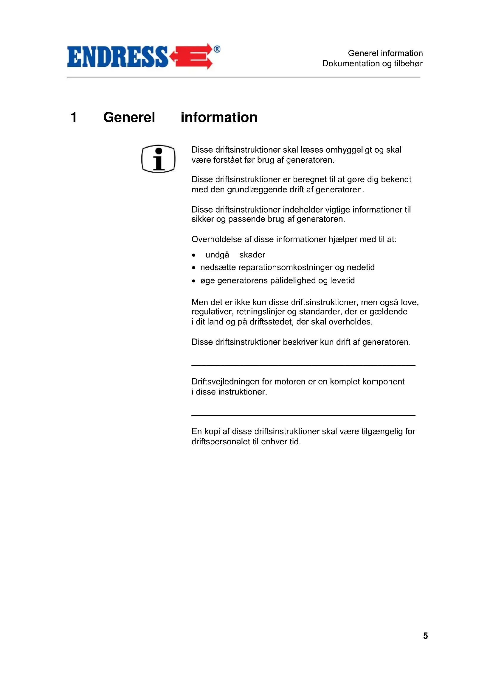 WWW: http://www.endress-generators.de E134038 Maj 2011 © 2011, ENDRESS Elektrogerätebau GmbH Denne dokumentation inkl. alt indhold er beskyttet af copyright. Al brug eller ændring udover begrænsningerne i loven om Copyright uden samtykke fra ENDRESS Elektrogerätebau GmbH er forbudt og vil være genstand for straf. Dette gælder specielt kopier, oversættelser, mikrofilm lige såvel som opbevaring og bearbejdning af elektroniske systemer. Udgiver Dokumentnummer Udstedelsesdato Cop yright3 1 Generel information .......................................................................................... 5