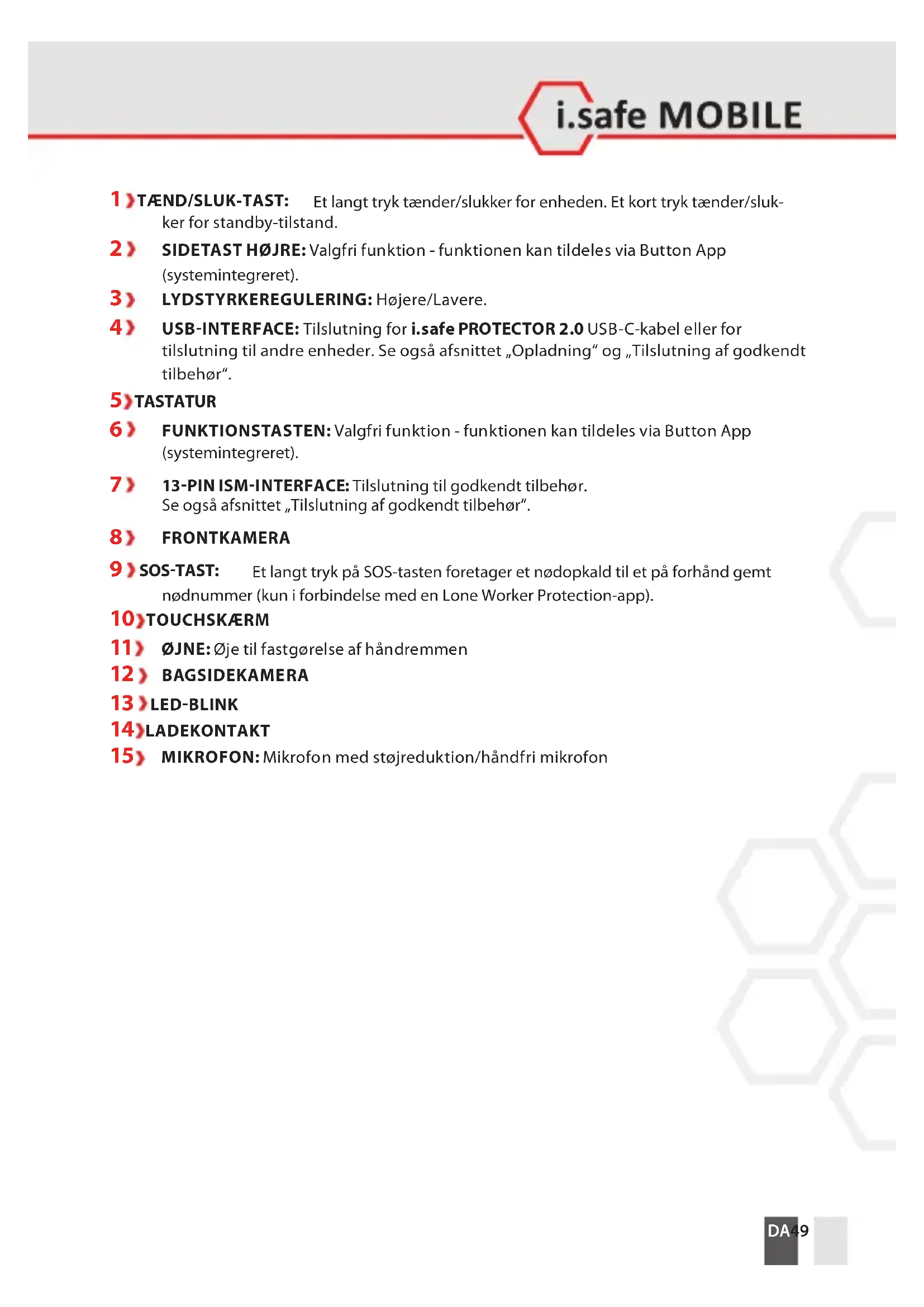 - mærkaterne på enheden ikke længere erlæselige. ANVENDELSE UDEN FOR OMRÅDER MED EKSPLOSIONSFARE FARE Forkert brug kan medføre dødsfald eller alvorlige kvæstelser! Undlad at bruge enheden på steder, hvor anvendelse er forbudt. Sluk for enheden på klinikker, hospitaler o.lign. Hold altid en sikkerhedsafstand på mindst 15cm mellem enheden og en pacemaker eller et høreapparat. Enheden kan påvirke funktionen af medicinsk apparatur, som f.eks. pacemakere og høreapparater. Ved brug af enheden under føring af et motorkøretøj skal du sikre dig, at du overholder gældende national lovgivning. Sørg for at forebygge de brugerfejl, der er beskrevet i afsnittet „Mulige brugerfejl“. Oplad udelukkende enheden som beskrevet i afsnittet „Opladning“.DA 51 FORSIGTIG Ved brug af høretelefoner eller headset med maksimal lydstyrke kan du beskadige din hørelse. Indstil først lydstyrkeknappen på enheden til 50% af den maksimale lydstyrke. Juster lydstyrken gradvist. BEMÆRK Forkert brug kan beskadige enheden. Anvend udelukkende tilbehør, der er godkendt af i.safe MOBILE som beskrevet i afsnittet „Tilslutning af godkendt tilbehør“. Beskyt enheden og adapteren mod stærke elektromagnetiske felter som f.eks. felter gene- reret af induktionskogeplader eller mikrobølgeovne. Undlad at berøre skærmen med skarpe genstande. MULIGE BRUGERFEJL FARE Forkert brug kan medføre dødsfald eller alvorlige kvæstelser! Følg nedenstående vejledning: Undlad at ændre enheden strukturelt. Undlad at udsætte enheden for høj temperatur. Undlad at udsætte enheden for stærk UV-stråling. Undlad at udsætte enheden for processer med høje elektriske udladninger. Undlad at udsætte enheden for stærk syre eller base. Ved arbejde i områder med eksplosionsfare skal du være opmærksom på: Undlad at løsne skruerne på enheden. Undlad at slutte tilbehør til enheden. Undlad at åbne interfacedæksler. Undlad at oplade enheden. Undlad at åbne enheden. Undlad at beskadige enheden.52 LEVERANCENS OMFANG Din pakke med enheden indeholder følgende: 1 x IS330.1 1 x batteri 1 x kvikstart-vejledning 1 x sikkerhedsinstruktioner 1 x folie til skærmbeskyttelse 1 x i.safe PROTECTOR2.0 USB-C-kabel 1 x Strømadapter universal (strømforsyning og forskellige landespecikke adaptere) 1 x torx-skruetrækker 1 x renseklud til skærm CELL BROADCAST Enheden understøtter cell broadcast. Cell broadcast er en mobiltjeneste til afsendelse af meddelelser til alle modtagere i en celle.