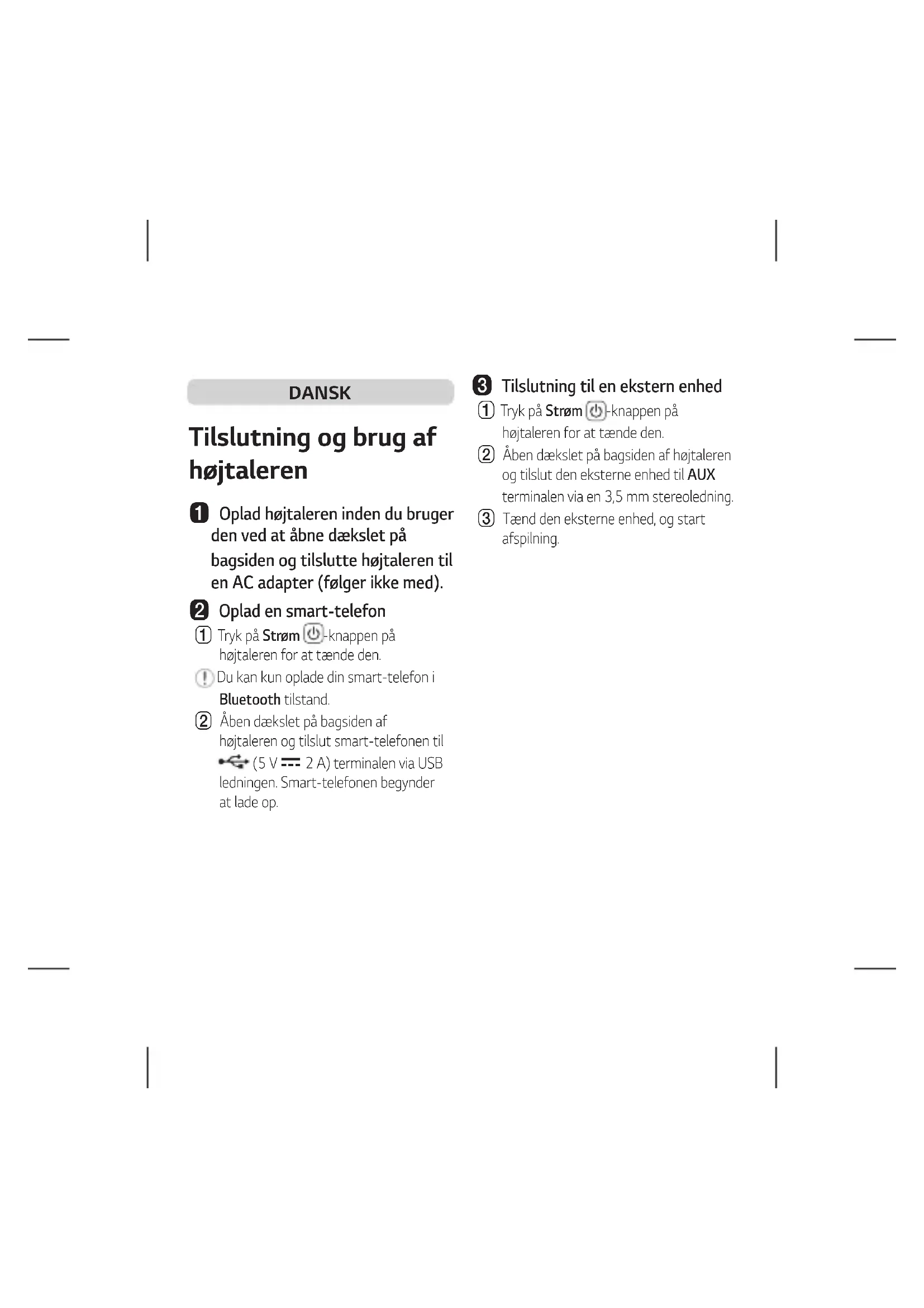 - För mer information, ladda ner bruksanvisningen online. http://www.lg.comDANSK Tilslutning og brug af højtaleren a Oplad højtaleren inden du bruger den ved at åbne dækslet på bagsiden og tilslutte højtaleren til en AC adapter (følger ikke med). b Oplad en smart-telefon A Tryk på Strøm -knappen på højtaleren for at tænde den. Du kan kun oplade din smart-telefon i Bluetooth tilstand. B Åben dækslet på bagsiden af højtaleren og tilslut smart-telefonen til (5 V 0 2 A) terminalen via USB ledningen. Smart-telefonen begynder at lade op. c Tilslutning til en ekstern enhed A Tryk på Strøm -knappen på højtaleren for at tænde den. B Åben dækslet på bagsiden af højtaleren og tilslut den eksterne enhed til AUX terminalen via en 3,5 mm stereoledning. C Tænd den eksterne enhed, og start afspilning.d Tilslut højtaleren til en smart- telefon med Bluetooth A Tryk på Strøm -knappen på højtaleren for at tænde den. Bluetooth LED lampen blinker. B Tryk på Indstillinger på smart- telefonen og vælg Bluetooth . Aktiver Bluetooth-funktionen. (Sluk > Tænd ) C Find “LG-XG7Q (XX)” på enhedslisten på smart-telefonen for at tilslutte den. Når smart-telefonen er tilsluttet via Bluetooth, tænder Bluetooth LED lampen. D På smart-telefonen afspil musikken, som du vil lytte til. e Tilslutning til LG XBOOM appen A Find LG XBOOM appen på Google Play eller App Store og installer den på din smart-telefon. B Kør LG XBOOM appen og brug ere funktioner. (EQ, Wireless Party Link, Lighting, Sleep Timer, Setting osv.)