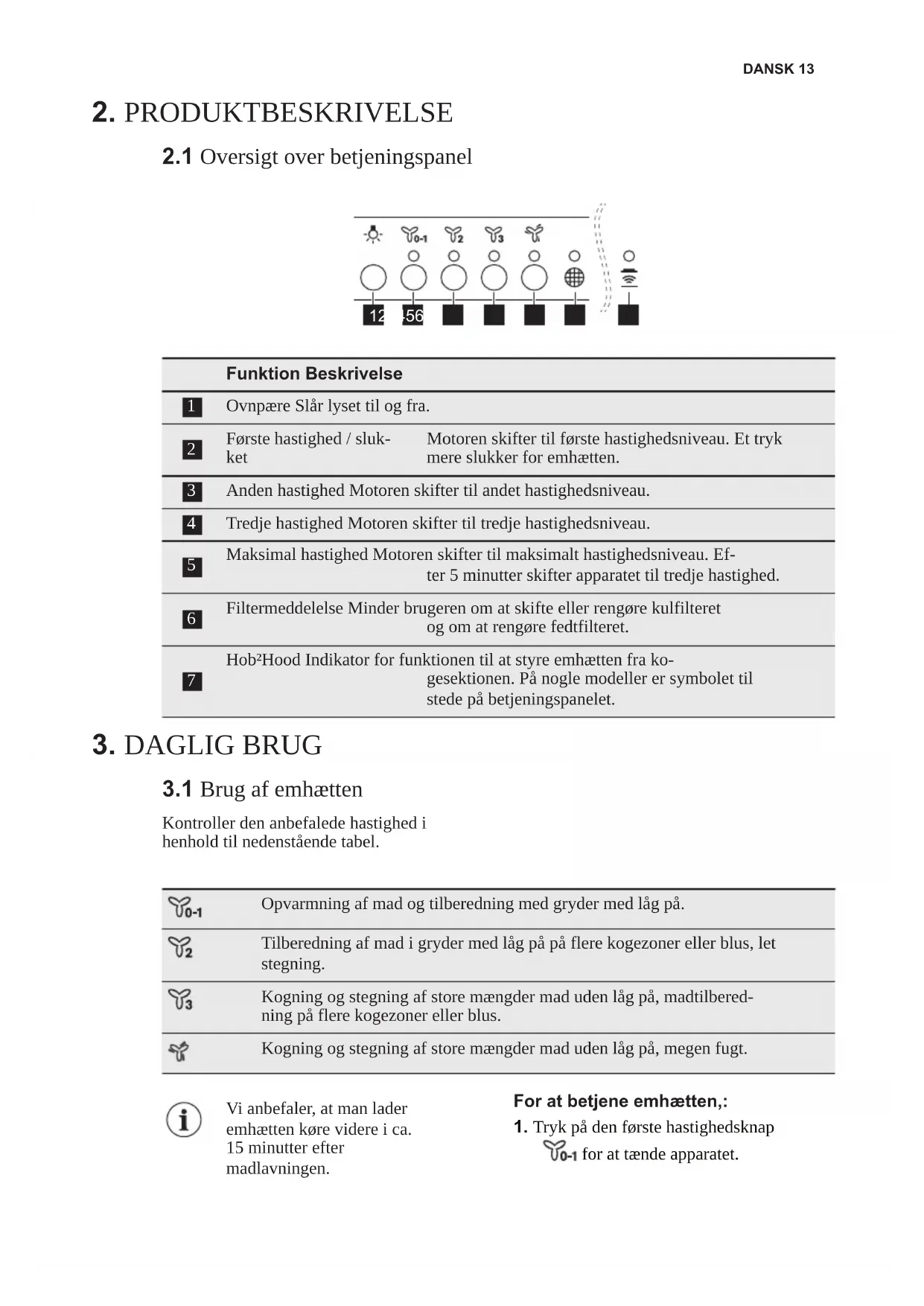 Kontroller den anbefalede hastighed i henhold til nedenstående tabel. Opvarmning af mad og tilberedning med gryder med låg på. Tilberedning af mad i gryder med låg på på flere kogezoner eller blus, let stegning. Kogning og stegning af store mængder mad uden låg på, madtilbered‐ ning på flere kogezoner eller blus. Kogning og stegning af store mængder mad uden låg på, megen fugt. Vi anbefaler, at man lader emhætten køre videre i ca. 15 minutter efter madlavningen. For at betjene emhætten,: