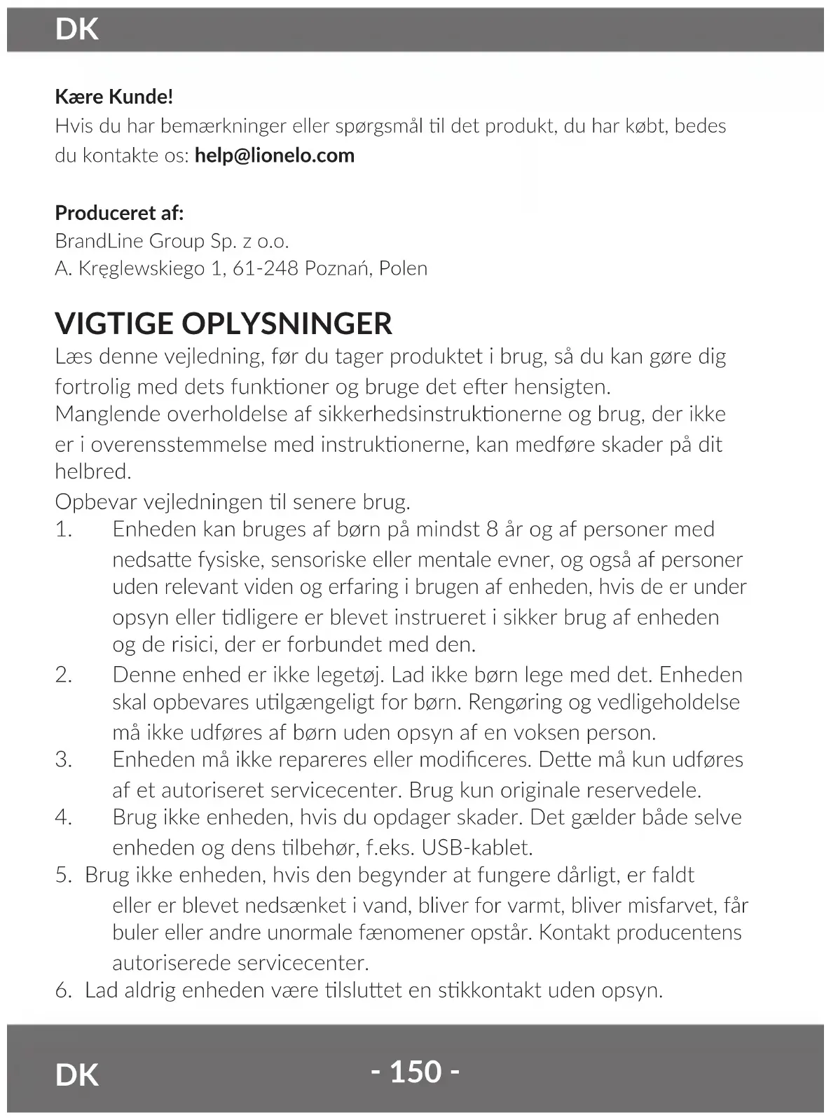 Kære Kunde! Hvis du har bemærkninger eller spørgsmål l det produkt, du har købt, bedes du kontakte os: help@lionelo.com Produceret af: BrandLine Group Sp. z o.o. A. Kręglewskiego 1, 61-248 Poznań, Polen VIGTIGE OPLYSNINGER Læs denne vejledning, før du tager produktet i brug, så du kan gøre dig fortrolig med dets funkoner og bruge det eer hensigten. Manglende overholdelse af sikkerhedsinstrukonerne og brug, der ikke er i overensstemmelse med instrukonerne, kan medføre skader på dit helbred. Opbevar vejledningen l senere brug.