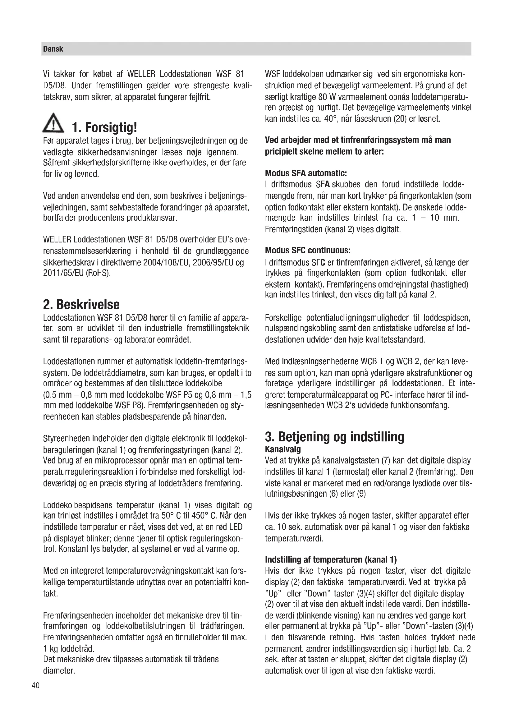Før apparatet tages i brug, bør betjeningsvejledningen og de vedlagte sikkerhedsanvisninger læses nøje igennem. Såfremt sikkerhedsforskrifterne ikke overholdes, er der fare for liv og levned. Ved anden anvendelse end den, som beskrives i betjenings- vejledningen, samt selvbestaltede forandringer på apparatet, bortfalder producentens produktansvar. WELLER Loddestationen WSF 81 D5/D8 overholder EU’s ove- rensstemmelseserklæring i henhold til de grundlæggende sikkerhedskrav i direktiverne 2004/108/EU, 2006/95/EU og 2011/65/EU (RoHS).