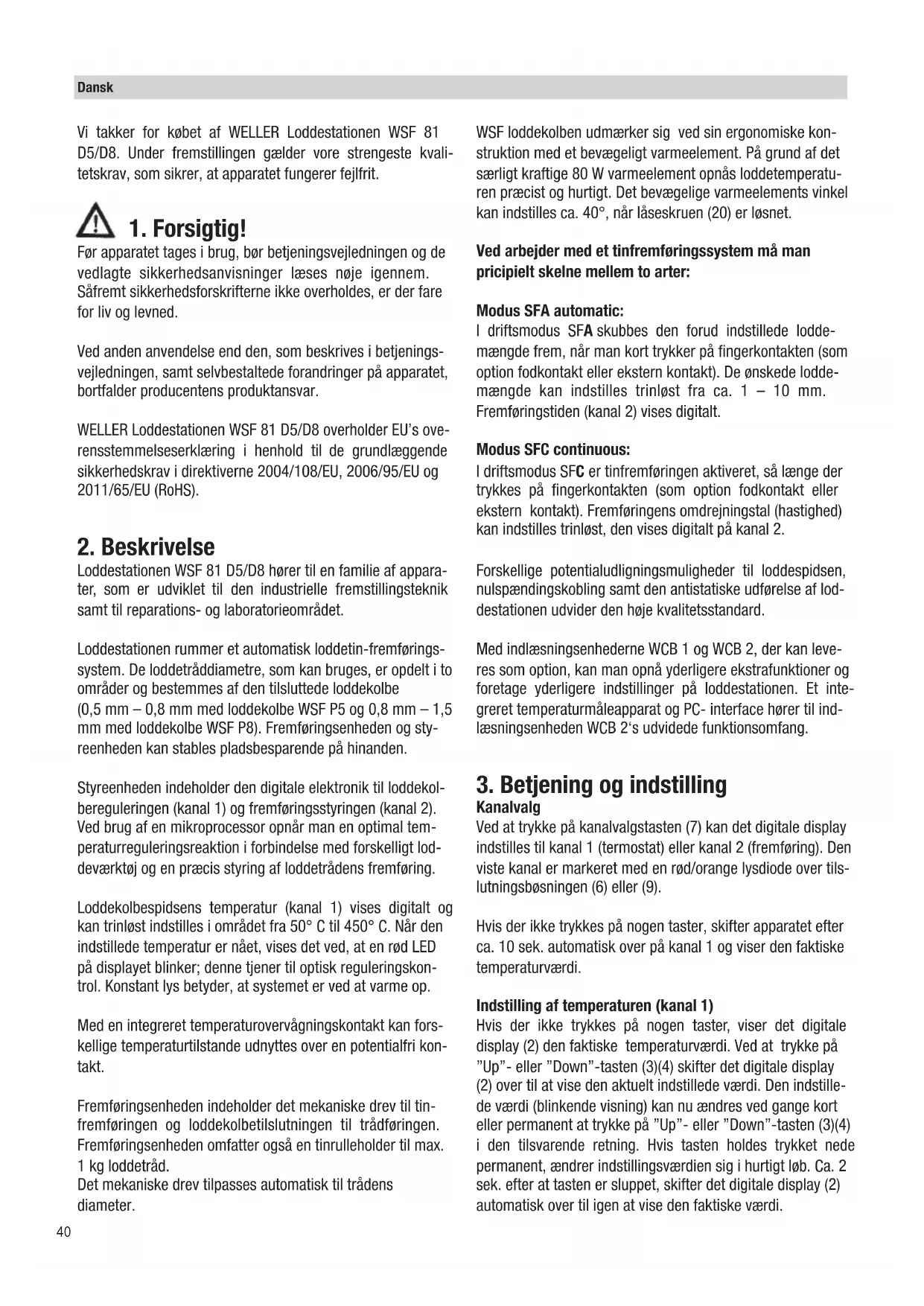 Før apparatet tages i brug, bør betjeningsvejledningen og de vedlagte sikkerhedsanvisninger læses nøje igennem. Såfremt sikkerhedsforskrifterne ikke overholdes, er der fare for liv og levned. Ved anden anvendelse end den, som beskrives i betjenings- vejledningen, samt selvbestaltede forandringer på apparatet, bortfalder producentens produktansvar. WELLER Loddestationen WSF 81 D5/D8 overholder EU’s ove- rensstemmelseserklæring i henhold til de grundlæggende sikkerhedskrav i direktiverne 2004/108/EU, 2006/95/EU og 2011/65/EU (RoHS).