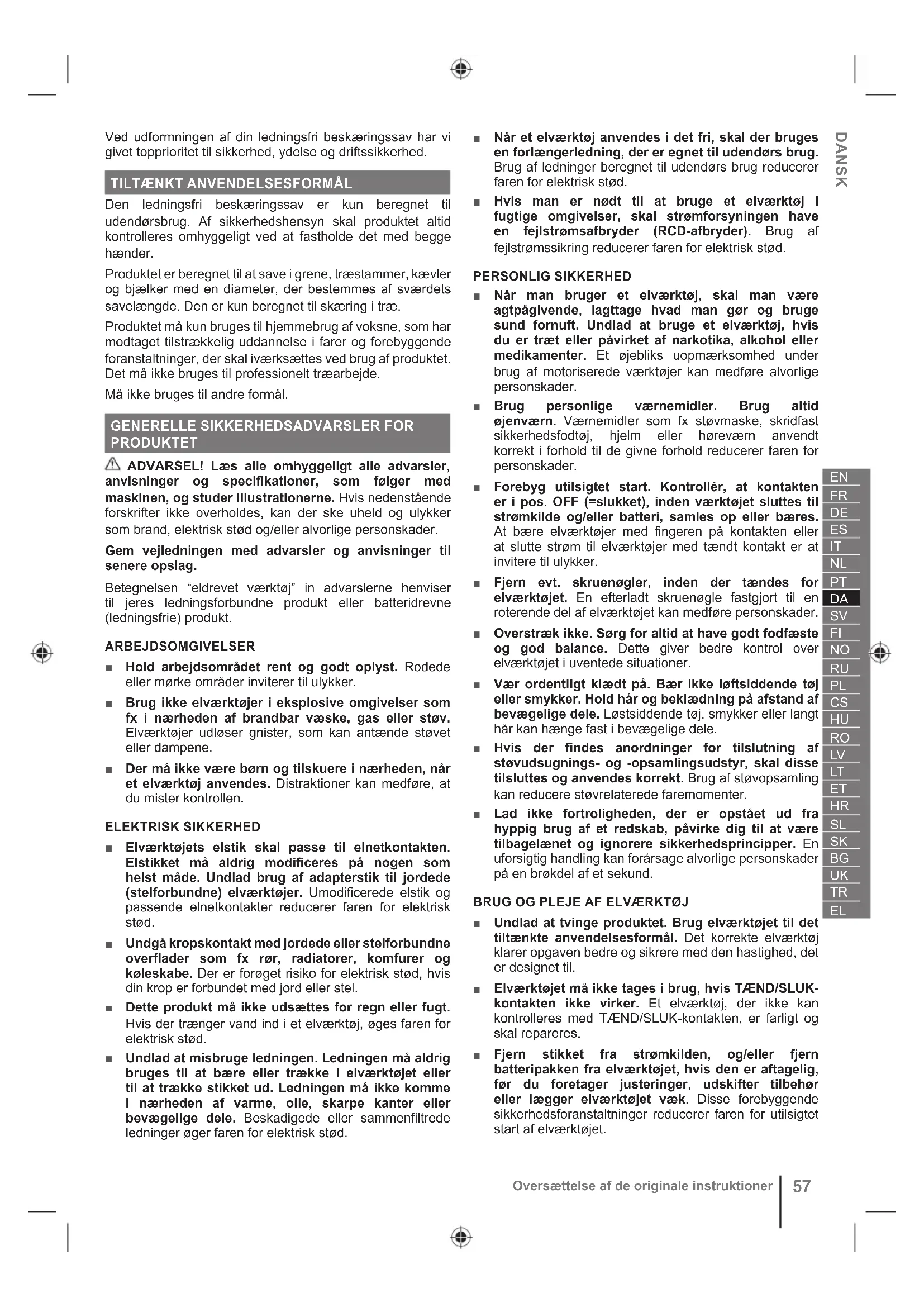 PRODUKTET ADVARSEL! Læs alle omhyggeligt alle advarsler, anvisninger og specifikationer, som følger med maskinen, og studer illustrationerne. Hvis nedenstående forskrifter ikke overholdes, kan der ske uheld og ulykker som brand, elektrisk stød og/eller alvorlige personskader. Gem vejledningen med advarsler og anvisninger til senere opslag. Betegnelsen “eldrevet værktøj” in advarslerne henviser til jeres ledningsforbundne produkt eller batteridrevne (ledningsfrie) produkt. ARBEJDSOMGIVELSER ■ Hold arbejdsområdet rent og godt oplyst. Rodede eller mørke områder inviterer til ulykker. ■ Brug ikke elværktøjer i eksplosive omgivelser som fx i nærheden af brandbar væske, gas eller støv. Elværktøjer udløser gnister, som kan antænde støvet eller dampene. ■ Der må ikke være børn og tilskuere i nærheden, når et elværktøj anvendes. Distraktioner kan medføre, at du mister kontrollen. ELEKTRISK SIKKERHED ■ Elværktøjets elstik skal passe til elnetkontakten. Elstikket må aldrig modificeres på nogen som helst måde. Undlad brug af adapterstik til jordede (stelforbundne) elværktøjer. Umodificerede elstik og passende elnetkontakter reducerer faren for elektrisk stød. ■ Undgå kropskontakt med jordede eller stelforbundne overflader som fx rør, radiatorer, komfurer og køleskabe. Der er forøget risiko for elektrisk stød, hvis din krop er forbundet med jord eller stel. ■ Dette produkt må ikke udsættes for regn eller fugt. Hvis der trænger vand ind i et elværktøj, øges faren for elektrisk stød. ■ Undlad at misbruge ledningen. Ledningen må aldrig bruges til at bære eller trække i elværktøjet eller til at trække stikket ud. Ledningen må ikke komme i nærheden af varme, olie, skarpe kanter eller bevægelige dele. Beskadigede eller sammenfiltrede ledninger øger faren for elektrisk stød. ■ Når et elværktøj anvendes i det fri, skal der bruges en forlængerledning, der er egnet til udendørs brug. Brug af ledninger beregnet til udendørs brug reducerer faren for elektrisk stød. ■ Hvis man er nødt til at bruge et elværktøj i fugtige omgivelser, skal strømforsyningen have en fejlstrømsafbryder (RCD-afbryder). Brug af fejlstrømssikring reducerer faren for elektrisk stød. PERSONLIG SIKKERHED ■ Når man bruger et elværktøj, skal man være agtpågivende, iagttage hvad man gør og bruge sund fornuft. Undlad at bruge et elværktøj, hvis du er træt eller påvirket af narkotika, alkohol eller medikamenter. Et øjebliks uopmærksomhed under brug af motoriserede værktøjer kan medføre alvorlige personskader. ■ Brug personlige værnemidler. Brug altid øjenværn. Værnemidler som fx støvmaske, skridfast sikkerhedsfodtøj, hjelm eller høreværn anvendt korrekt i forhold til de givne forhold reducerer faren for personskader. ■ Forebyg utilsigtet start. Kontrollér, at kontakten er i pos. OFF (=slukket), inden værktøjet sluttes til strømkilde og/eller batteri, samles op eller bæres. At bære elværktøjer med fingeren på kontakten eller at slutte strøm til elværktøjer med tændt kontakt er at invitere til ulykker. ■ Fjern evt. skruenøgler, inden der tændes for elværktøjet. En efterladt skruenøgle fastgjort til en roterende del af elværktøjet kan medføre personskader. ■ Overstræk ikke. Sørg for altid at have godt fodfæste og god balance. Dette giver bedre kontrol over elværktøjet i uventede situationer. ■ Vær ordentligt klædt på. Bær ikke løftsiddende tøj eller smykker. Hold hår og beklædning på afstand af bevægelige dele. Løstsiddende tøj, smykker eller langt hår kan hænge fast i bevægelige dele. ■ Hvis der findes anordninger for tilslutning af støvudsugnings- og -opsamlingsudstyr, skal disse tilsluttes og anvendes korrekt. Brug af støvopsamling kan reducere støvrelaterede faremomenter. ■ Lad ikke fortroligheden, der er opstået ud fra hyppig brug af et redskab, påvirke dig til at være tilbagelænet og ignorere sikkerhedsprincipper. En uforsigtig handling kan forårsage alvorlige personskader på en brøkdel af et sekund. BRUG OG PLEJE AF ELVÆRKTØJ ■ Undlad at tvinge produktet. Brug elværktøjet til det tiltænkte anvendelsesformål. Det korrekte elværktøj klarer opgaven bedre og sikrere med den hastighed, det er designet til. ■ Elværktøjet må ikke tages i brug, hvis TÆND/SLUK- kontakten ikke virker. Et elværktøj, der ikke kan kontrolleres med TÆND/SLUK-kontakten, er farligt og skal repareres. ■ Fjern stikket fra strømkilden, og/eller fjern batteripakken fra elværktøjet, hvis den er aftagelig, før du foretager justeringer, udskifter tilbehør eller lægger elværktøjet væk. Disse forebyggende sikkerhedsforanstaltninger reducerer faren for utilsigtet start af elværktøjet.58 Oversættelse af de originale instruktioner ■ Når elværktøjer ikke bruges, skal de opbevares utilgængeligt for børn; personer, som ikke er fortrolige med elværktøjet eller denne brugsanvisning, må ikke anvende elværktøjet. Elværktøjer er farlige i hænderne på ukyndige brugere. ■ Vedligehold elværktøj og tilbehør. Kontrollér, om der er forkert indjusterede eller forbundne bevægelige dele, afbrækkede dele samt andre tilstande, som kan påvirke elværktøjets funktionsmåde. Hvis der konstateres skader, skal elværktøjet repareres inden brug. Mange ulykker skyldes dårligt vedligeholdte elværktøjer. ■ Skærende værktøjer skal holdes skarpe og rene. Korrekt vedligeholdte skærende værktøjer med skarpe skær er mindre tilbøjelige til at binde/blokere og er lettere at kontrollere. ■ Brug elværktøjet, tilbehøret og værktøjs-bits osv. som foreskrevet i denne brugsanvisning, og tag højde for arbejdsforholdene og den aktuelle arbejdsopgave. Brug af elværktøjet i strid med de tiltænkte anvendelsesformål kan medføre farlige situationer. ■ Hold håndtagene og gribefladerne tørre, rene og fri for olie og fedt. Glatte håndtag og gribeflader umuliggør sik