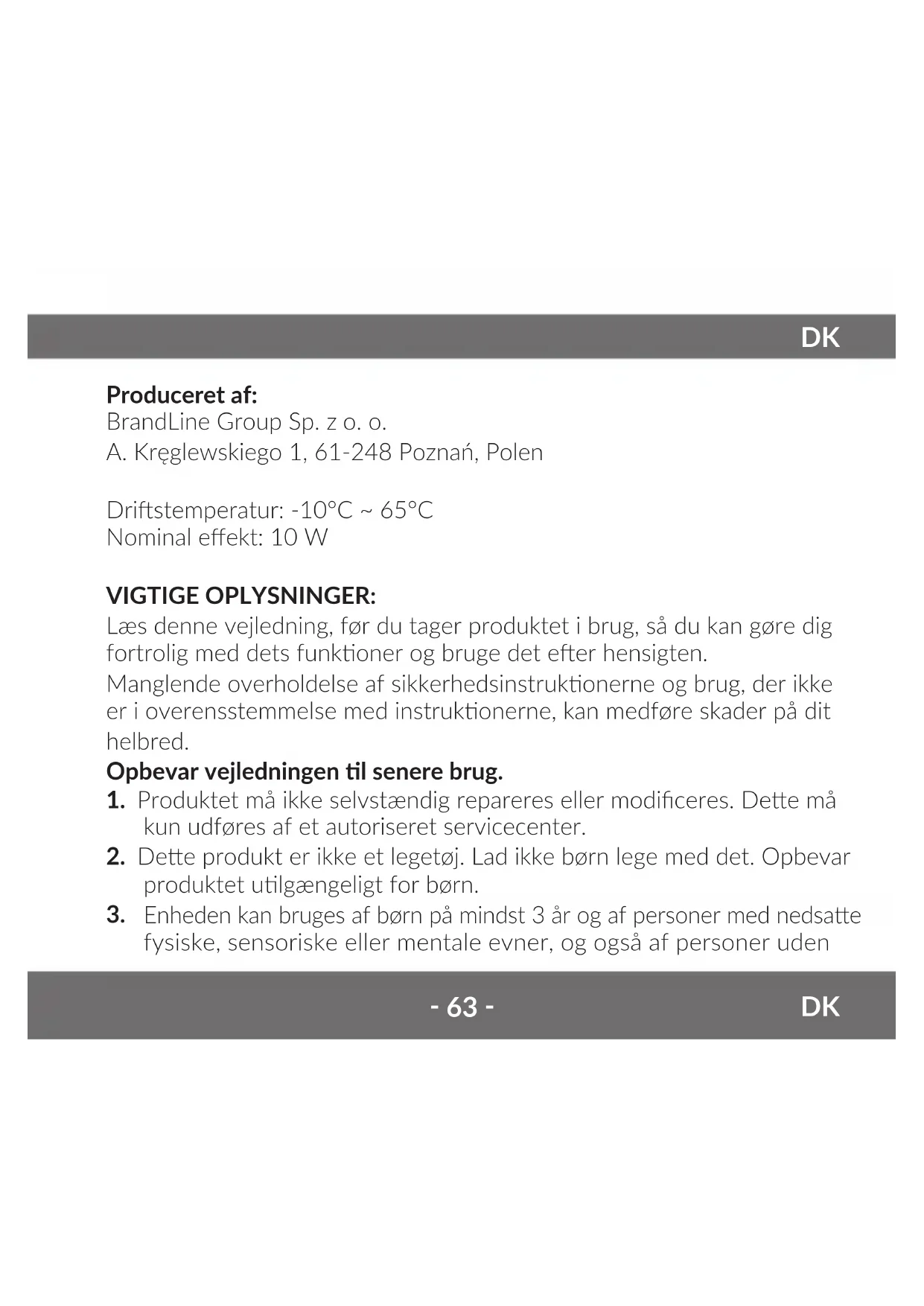 Produceret af: BrandLine Group Sp. z o. o. A. Kręglewskiego 1, 61-248 Poznań, Polen Dristemperatur: -10°C ~ 65°C Nominal eekt: 10 W VIGTIGE OPLYSNINGER: Læs denne vejledning, før du tager produktet i brug, så du kan gøre dig fortrolig med dets funkoner og bruge det eer hensigten. Manglende overholdelse af sikkerhedsinstrukonerne og brug, der ikke er i overensstemmelse med instrukonerne, kan medføre skader på dit helbred. Opbevar vejledningen l senere brug.