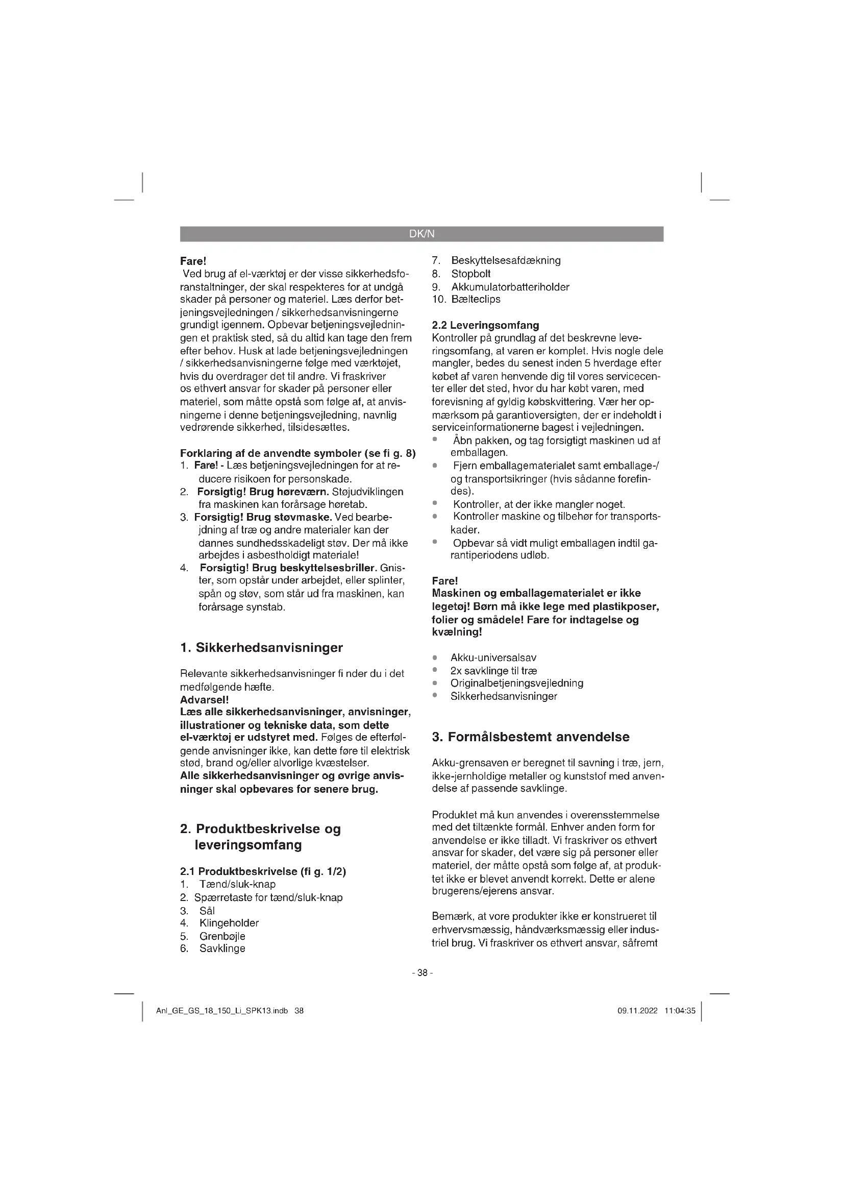 Akku-grensaven er beregnet til savning i træ, jern, ikke-jernholdige metaller og kunststof med anven- delse af passende savklinge. Produktet må kun anvendes i overensstemmelse med det tiltænkte formål. Enhver anden form for anvendelse er ikke tilladt. Vi fraskriver os ethvert ansvar for skader, det være sig på personer eller materiel, der måtte opstå som følge af, at produk- tet ikke er blevet anvendt korrekt. Dette er alene brugerens/ejerens ansvar. Bemærk, at vore produkter ikke er konstrueret til erhvervsmæssig, håndværksmæssig eller indus- triel brug. Vi fraskriver os ethvert ansvar, såfremt Anl_GE_GS_18_150_Li_SPK13.indb 38Anl_GE_GS_18_150_Li_SPK13.indb 38 09.11.2022 11:04:3509.11.2022 11:04:35DK/N
