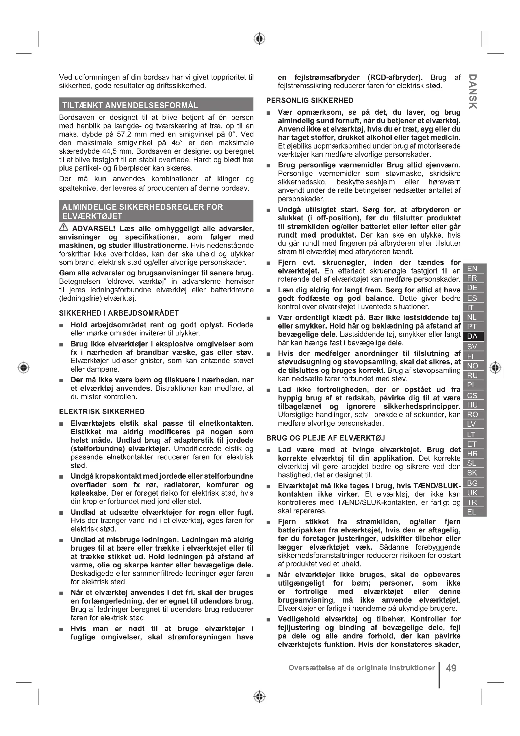 Bordsaven er designet til at blive betjent af én person med henblik på længde- og tværskæring af træ, op til en maks. dybde på 57,2 mm med en smigvinkel på 0°. Ved den maksimale smigvinkel på 45° er den maksimale skæredybde 44,5 mm. Bordsaven er designet og beregnet til at blive fastgjort til en stabil overfl ade. Hårdt og blødt træ plus partikel- og fi berplader kan skæres. Der må kun anvendes kombinationer af klinger og spalteknive, der leveres af producenten af denne bordsav.