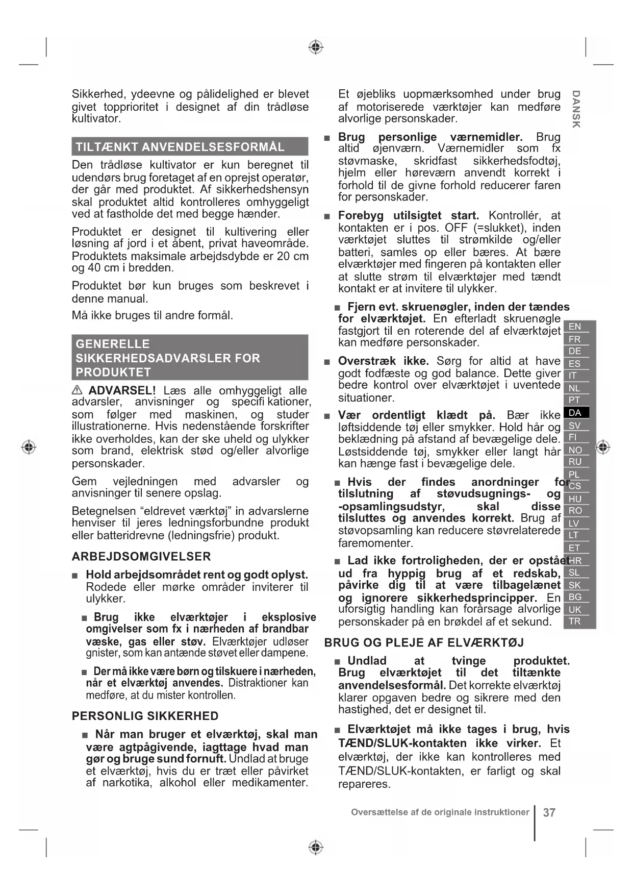 Den trådløse kultivator er kun beregnet til udendørs brug foretaget af en oprejst operatør, der går med produktet. Af sikkerhedshensyn skal produktet altid kontrolleres omhyggeligt ved at fastholde det med begge hænder. Produktet er designet til kultivering eller løsning af jord i et åbent, privat haveområde. Produktets maksimale arbejdsdybde er 20 cm og 40 cm i bredden. Produktet bør kun bruges som beskrevet i denne manual. Må ikke bruges til andre formål. GENERELLE SIKKERHEDSADVARSLER FOR PRODUKTET ADVARSEL! Læs alle omhyggeligt alle advarsler, anvisninger og specifi kationer, som følger med maskinen, og studer illustrationerne. Hvis nedenstående forskrifter ikke overholdes, kan der ske uheld og ulykker som brand, elektrisk stød og/eller alvorlige personskader. Gem vejledningen med advarsler og anvisninger til senere opslag. Betegnelsen “eldrevet værktøj” in advarslerne henviser til jeres ledningsforbundne produkt eller batteridrevne (ledningsfrie) produkt. ARBEJDSOMGIVELSER ■ Hold arbejdsområdet rent og godt oplyst. Rodede eller mørke områder inviterer til ulykker. ■ Brug ikke elværktøjer i eksplosive omgivelser som fx i nærheden af brandbar væske, gas eller støv. Elværktøjer udløser gnister, som kan antænde støvet eller dampene. ■ Der må ikke være børn og tilskuere i nærheden, når et elværktøj anvendes. Distraktioner kan medføre, at du mister kontrollen. PERSONLIG SIKKERHED ■ Når man bruger et elværktøj, skal man være agtpågivende, iagttage hvad man gør og bruge sund fornuft. Undlad at bruge et elværktøj, hvis du er træt eller påvirket af narkotika, alkohol eller medikamenter. Et øjebliks uopmærksomhed under brug af motoriserede værktøjer kan medføre alvorlige personskader. ■ Brug personlige værnemidler. Brug altid øjenværn. Værnemidler som fx støvmaske, skridfast sikkerhedsfodtøj, hjelm eller høreværn anvendt korrekt i forhold til de givne forhold reducerer faren for personskader. ■ Forebyg utilsigtet start. Kontrollér, at kontakten er i pos. OFF (=slukket), inden værktøjet sluttes til strømkilde og/eller batteri, samles op eller bæres. At bære elværktøjer med fingeren på kontakten eller at slutte strøm til elværktøjer med tændt kontakt er at invitere til ulykker. ■ Fjern evt. skruenøgler, inden der tændes for elværktøjet. En efterladt skruenøgle fastgjort til en roterende del af elværktøjet kan medføre personskader. ■ Overstræk ikke. Sørg for altid at have godt fodfæste og god balance. Dette giver bedre kontrol over elværktøjet i uventede situationer. ■ Vær ordentligt klædt på. Bær ikke løftsiddende tøj eller smykker. Hold hår og beklædning på afstand af bevægelige dele. Løstsiddende tøj, smykker eller langt hår kan hænge fast i bevægelige dele. ■ Hvis der findes anordninger for tilslutning af støvudsugnings- og -opsamlingsudstyr, skal disse tilsluttes og anvendes korrekt. Brug af støvopsamling kan reducere støvrelaterede faremomenter. ■ Lad ikke fortroligheden, der er opstået ud fra hyppig brug af et redskab, påvirke dig til at være tilbagelænet og ignorere sikkerhedsprincipper. En uforsigtig handling kan forårsage alvorlige personskader på en brøkdel af et sekund. BRUG OG PLEJE AF ELVÆRKTØJ ■ Undlad at tvinge produktet. Brug elværktøjet til det tiltænkte anvendelsesformål. Det korrekte elværktøj klarer opgaven bedre og sikrere med den hastighed, det er designet til. ■ Elværktøjet må ikke tages i brug, hvis TÆND/SLUK-kontakten ikke virker. Et elværktøj, der ikke kan kontrolleres med TÆND/SLUK-kontakten, er farligt og skal repareres.38 Oversættelse af de originale instruktioner ■ Fjern stikket fra strømkilden, og/eller fjern batteripakken fra elværktøjet, hvis den er aftagelig, før du foretager justeringer, udskifter tilbehør eller lægger elværktøjet væk. Disse forebyggende sikkerhedsforanstaltninger reducerer faren for utilsigtet start af elværktøjet. ■ Når elværktøjer ikke bruges, skal de opbevares utilgængeligt for børn; personer, som ikke er fortrolige med elværktøjet eller denne brugsanvisning, må ikke anvende elværktøjet. Elværktøjer er farlige i hænderne på ukyndige brugere. ■ Vedligehold elværktøj og tilbehør. Kontrollér, om der er forkert indjusterede eller forbundne bevægelige dele, afbrækkede dele samt andre tilstande, som kan påvirke elværktøjets funktionsmåde. Hvis der konstateres skader, skal elværktøjet repareres inden brug. Mange ulykker skyldes dårligt vedligeholdte elværktøjer. ■ Skærende værktøjer skal holdes skarpe og rene. Korrekt vedligeholdte skærende værktøjer med skarpe skær er mindre tilbøjelige til at binde/blokere og er lettere at kontrollere. ■ Brug elværktøjet, tilbehøret og værktøjs-bits osv. som foreskrevet i denne brugsanvisning, og tag højde for arbejdsforholdene og den aktuelle arbejdsopgave. Brug af elværktøjet i strid med de tiltænkte anvendelsesformål kan medføre farlige situationer. ■ Hold håndtagene og gribefladerne tørre, rene og fri for olie og fedt. Glatte håndtag og gribeflader umuliggør sikker håndtering og kontrol af redskabet i uventede situationer. BRUG OG PLEJE AF BATTERIVÆRKTØJ ■ Opladning må kun finde sted med den af producenten foreskrevne oplader. En oplader, der er beregnet til én type batteri, kan udgøre en brandrisiko, hvis den bruges til en anden batteritype. ■ Brug kun elværktøjer sammen med specifikt godkendte batterier. Brug af andre batterityper kan medføre fare for personskade og brand. ■ Når batteriet ikke bruges, må det ikke opbevares sammen med metalgenstande som fx papirclips, mønter, nøgler, søm, skruer eller andre metalgenstande, som kan skabe forbindelse mellem batteriets poler. Hvis batteriets poler kortsluttes, kan det forårsage forbrændinger eller ildebrand. ■ Hvis batteriet misbruges, kan der sprøjte væske ud af det; undgå kontakt med batterivæsken. Ved