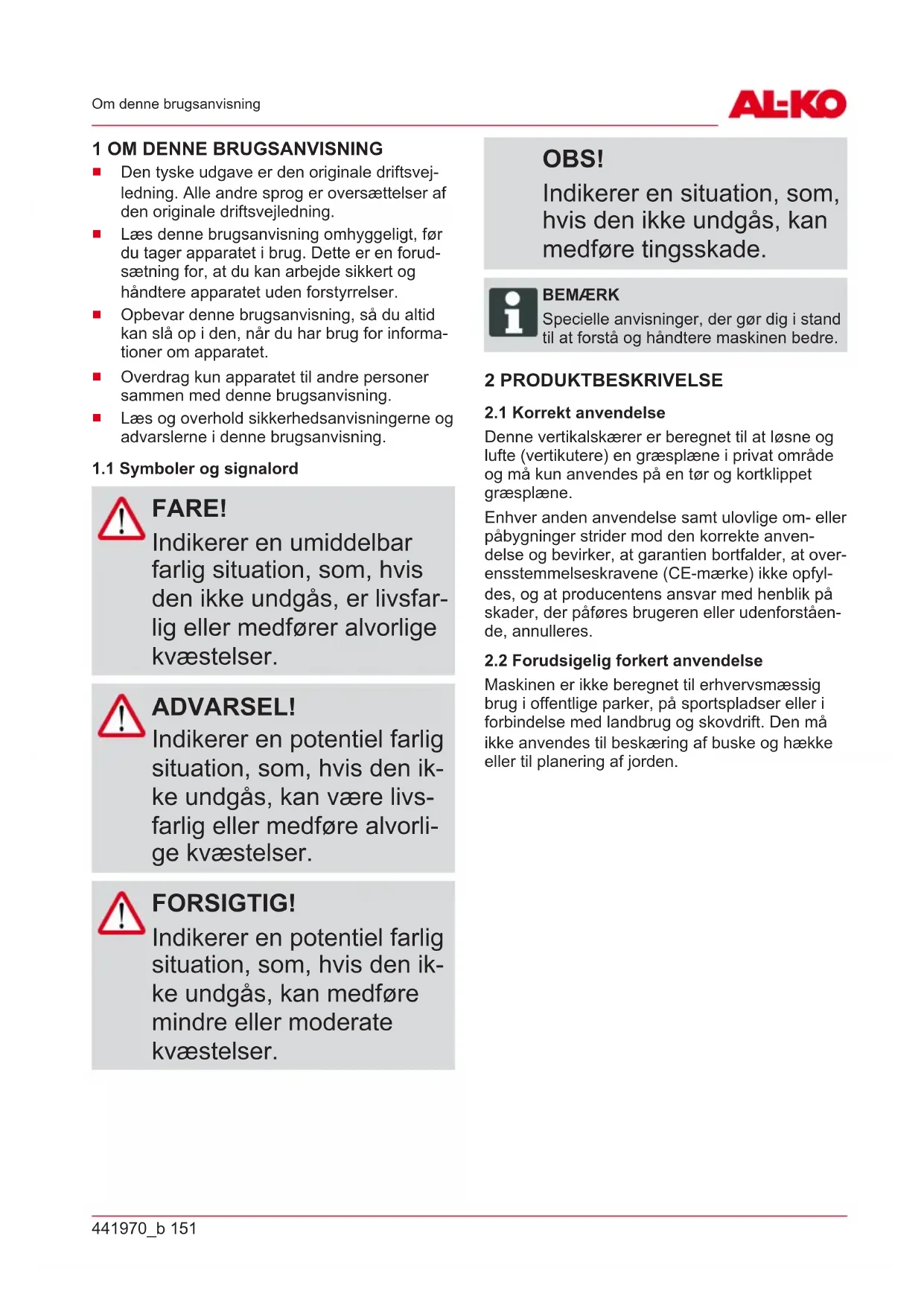 FARE! Indikerer en umiddelbar farlig situation, som, hvis den ikke undgås, er livsfar- lig eller medfører alvorlige kvæstelser. ADVARSEL! Indikerer en potentiel farlig situation, som, hvis den ik- ke undgås, kan være livs- farlig eller medføre alvorli- ge kvæstelser. FORSIGTIG! Indikerer en potentiel farlig situation, som, hvis den ik- ke undgås, kan medføre mindre eller moderate kvæstelser. OBS! Indikerer en situation, som, hvis den ikke undgås, kan medføre tingsskade. BEMÆRK Specielle anvisninger, der gør dig i stand til at forstå og håndtere maskinen bedre. 2 PRODUKTBESKRIVELSE