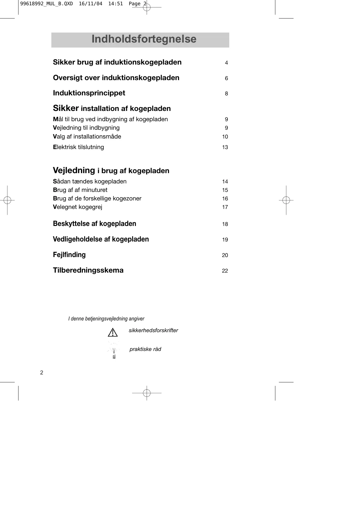 16/11/04 14:51 Page 2 Indholdsfortegnelse Sikker brug af induktionskogepladen
