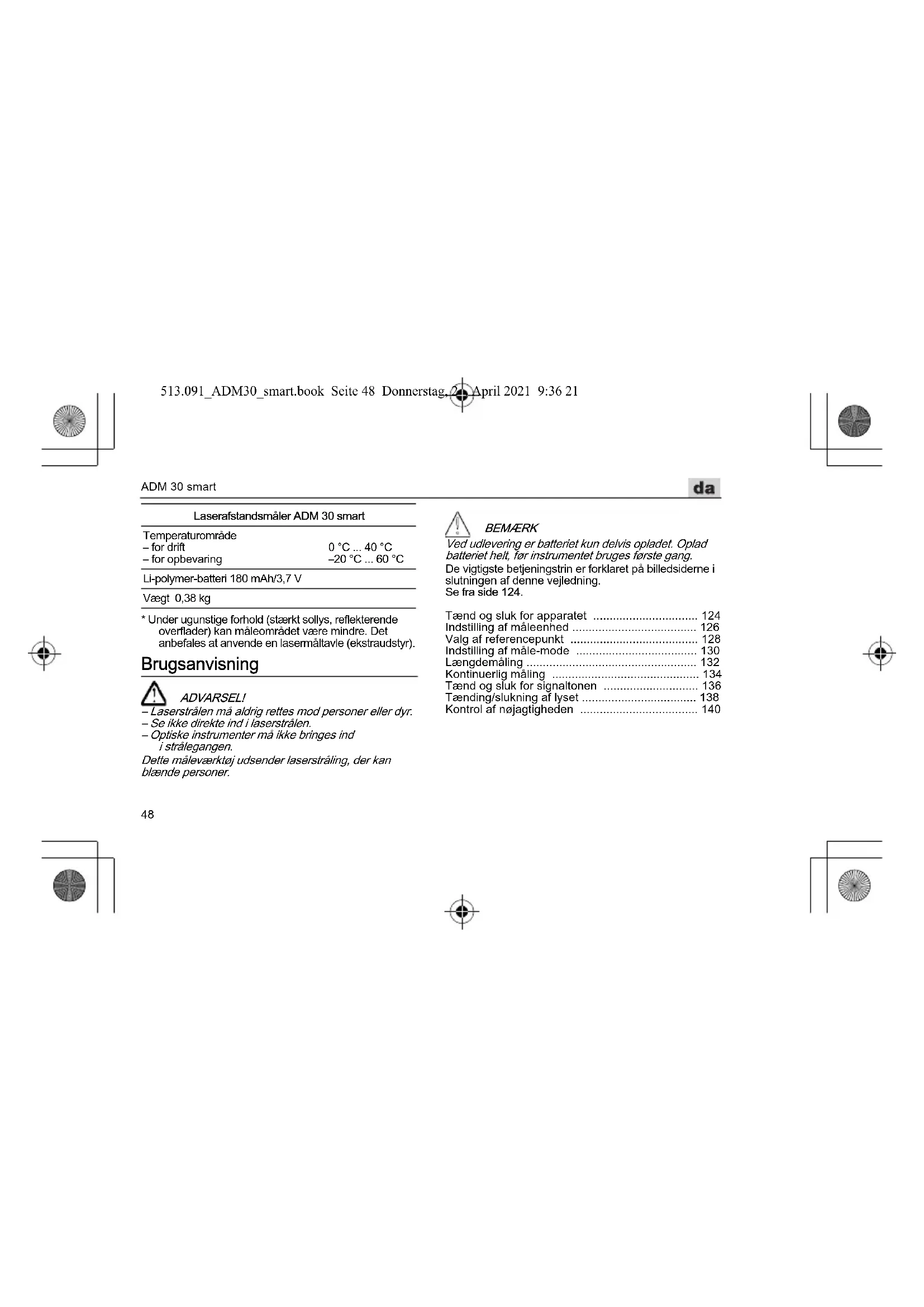 =670 nm EN 60825-1:2015-07 Laserklassificering Instrumentet svarer til laserklasse 2, baseret på standard IEC 825-1/EN 60825. 513.091_ADM30_smart.book Seite 45 Donnerstag, 22. April 2021 9:36 2146 ADM 30 smart Bestemmelsesmæssig brug Dette måleværktøj er beregnet til erhvervsmæssig brug inden for industri og håndværk. En laserafstandsmåler er beregnet til måling af længder, højder og afstande samt til bestemmelse af arealer. Laserafstandsmåler – Laserstrålen må aldrig rettes mod personer eller dyr; pas på ikke selv at komme til at se direkte ind i laserstrålen. Dette måleværktøj frembringer laserstråling, som kan blænde personer. – Få altid instrumentet repareret af kvalificerede fagfolk og kun med originale dele. Det er en garanti for, at instrumentets sikkerhed opretholdes. – Børn må aldrig bruge instrumentet uden opsyn. Du kan ved en fejl komme til at blænde andre personer. – Arbejd aldrig med instrumentet i eksplosionsfarlige omgivelser, hvor der befinder sig brændbare væsker, gasser eller støv. Måleværktøjet kan give gnister, der kan antænde støvet eller dampene. – Hvis der anvendes andre end disse anførte betjenings- eller justeringsindretninger eller andre metoder, kan det medføre farlig stråleeksponering. – Det er forbudt at sætte sikkerhedsanordninger ud af funktion eller at fjerne henvisnings- og advarselsskilte. – Før instrumentet tages i brug, skal det undersøges for synlige skader. Instrumenter, der er beskadiget, må ikke tages i brug. – Ved anvendelse af stiger bør akavede stillinger undgås. Sørg for at have et sikkert fodfæste, og hold balancen. 513.091_ADM30_smart.book Seite 46 Donnerstag, 22. April 2021 9:36 2147 ADM 30 smart Oversigt 1 Laserudgangsvindue 2 Modtagerlinse 3 Display 4 Tænd-knap/Måleknap/Mode 5 Mode-knap 6 Sluk-knap 7 USB-ladebøsning 8 USB-ladekabel Tekniske data Laserafstandsmåler ADM 30 smart Synlig laserdiode 670 nm Laserklasse 2 Måleområde * 0,03–30 m Nøjagtighed * ± 3 mm Enkeltmålinger (antal) ≤ 3000 513.091_ADM30_smart.book Seite 47 Donnerstag, 22. April 2021 9:36 2148 ADM 30 smart