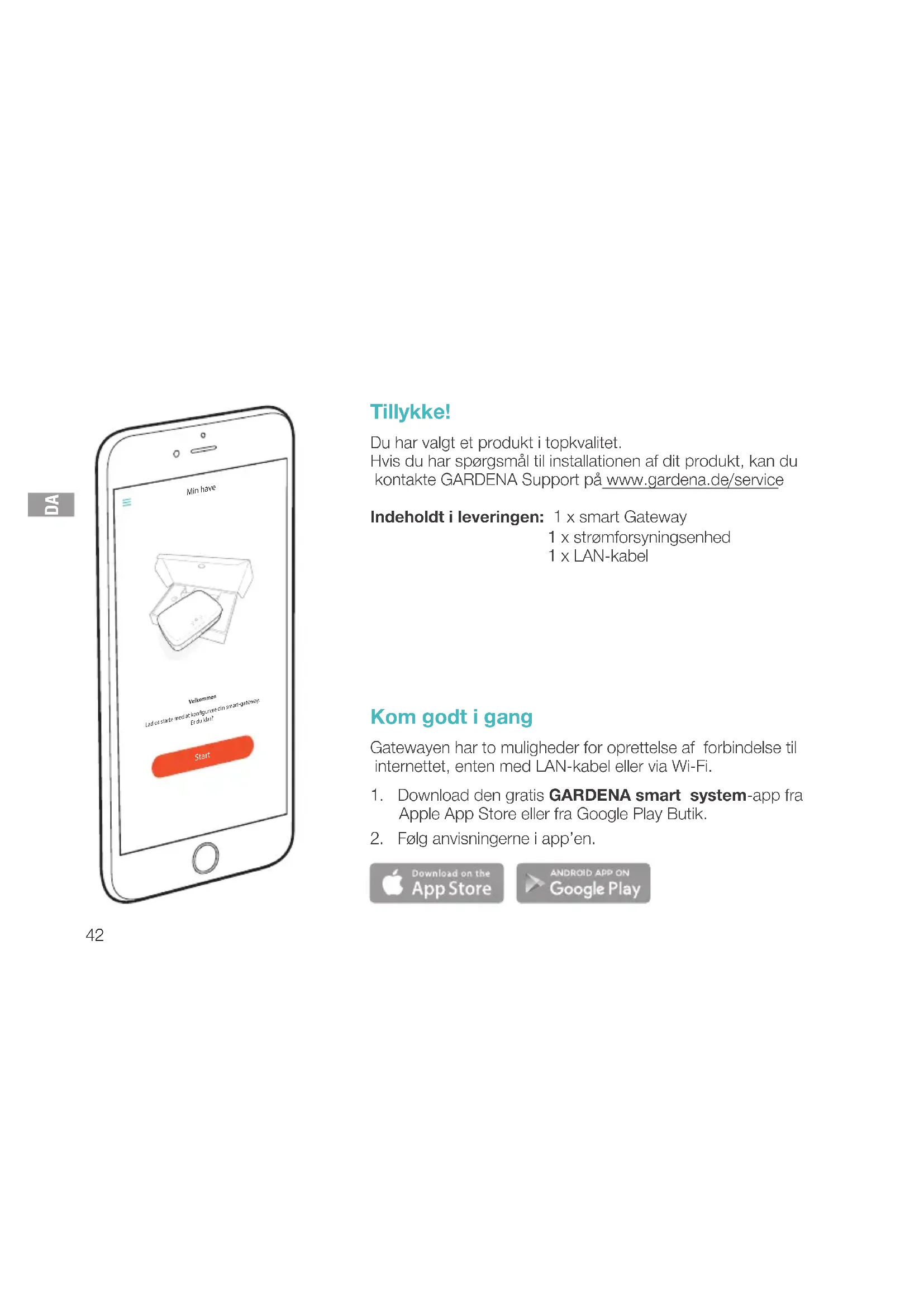 Tillykke! Du har valgt et produkt i topkvalitet. Hvis du har spørgsmål til installationen af dit produkt, kan du kontakte GARDENA Support på www.gardena.de/service Indeholdt i leveringen: 1 x smart Gateway 1 x strømforsyningsenhed 1 x LAN-kabel Kom godt i gang Gatewayen har to muligheder for oprettelse af forbindelse til internettet, enten med LAN-kabel eller via Wi-Fi.