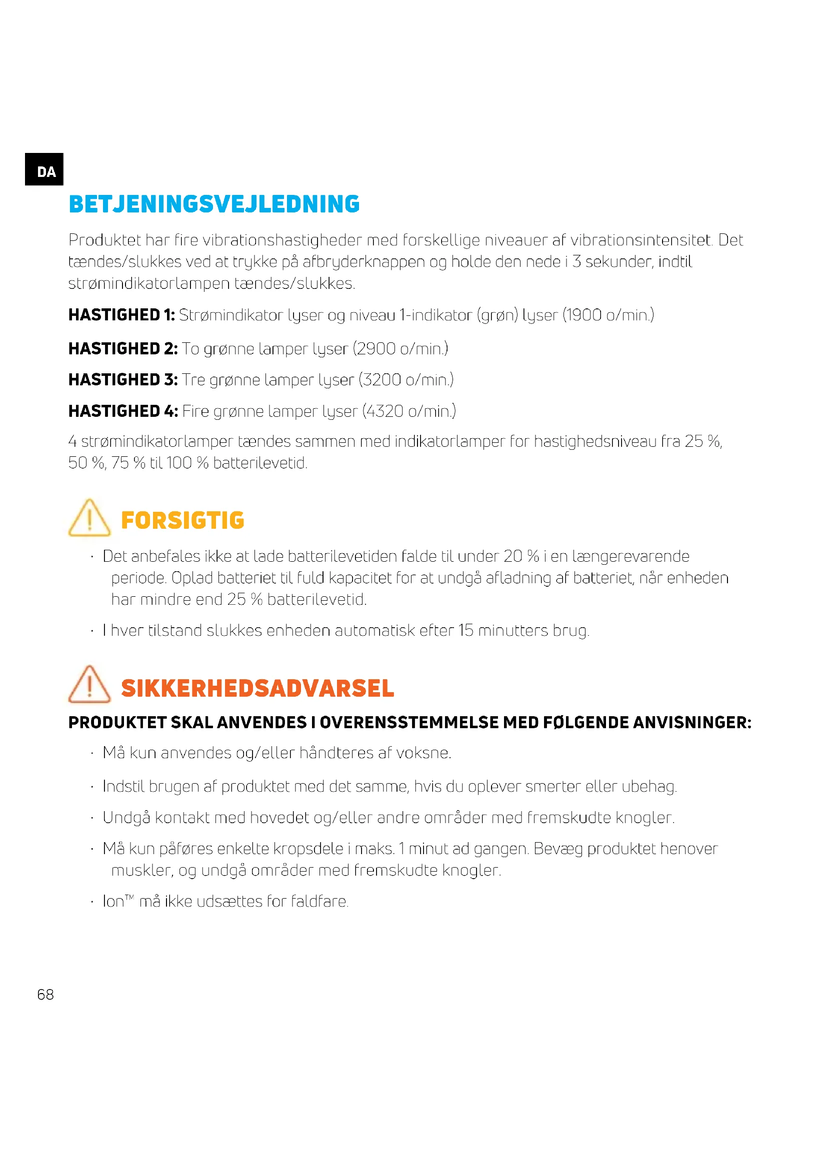 BETJENINGSVEJLEDNING Produktet har fire vibrationshastigheder med forskellige niveauer af vibrationsintensitet. Det tændes/slukkes ved at trykke på afbryderknappen og holde den nede i 3 sekunder, indtil strømindikatorlampen tændes/slukkes. HASTIGHED 1: Strømindikator lyser og niveau 1-indikator (grøn) lyser (1900 o/min.) HASTIGHED 2: To grønne lamper lyser (2900 o/min.) HASTIGHED 3: Tre grønne lamper lyser (3200 o/min.) HASTIGHED 4: Fire grønne lamper lyser (4320 o/min.) 4 strømindikatorlamper tændes sammen med indikatorlamper for hastighedsniveau fra 25 %, 50 %, 75 % til 100 % batterilevetid. FORSIGTIG