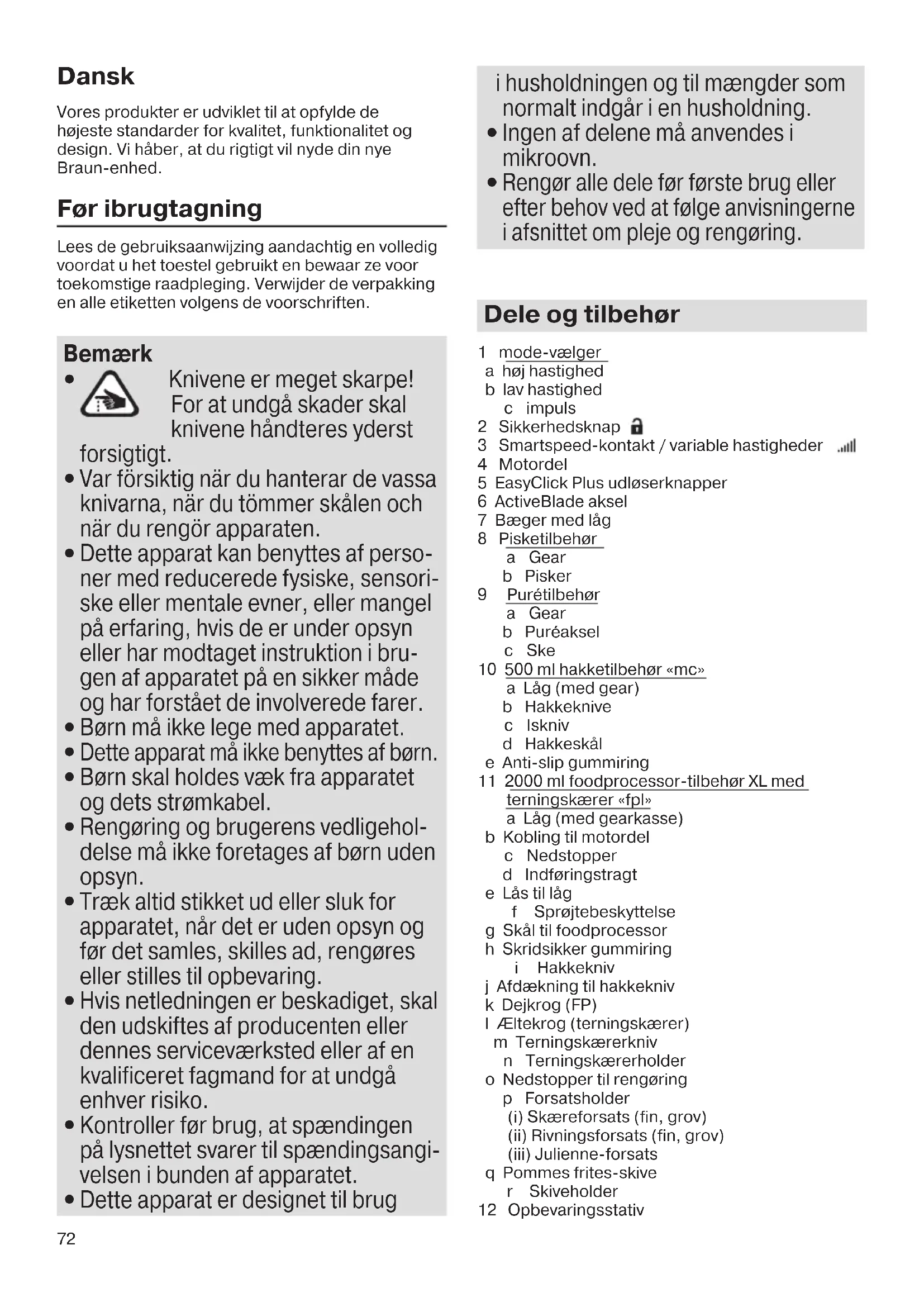 - Ved tilberedning af madvarer med højt pigmentindhold (f.eks. gulerødder eller gurkemeje) kan tilbehørsdelene blive misfarvede. Aftør disse dele med vegetabilsk olie, før de rengøres. Garanti og service For detaljeret information, se separat garanti- og servicebrochure eller besøg www.braunhousehold.com . Både designspecifikationer og denne brugervejledning kan ændres uden varsel. Bortskaf ikke apparatet som husholdnings- affald efter enden på dets levetid. Borts- kaffelse kan ske på Braun Service Centre eller passende indsamlingssted lokalt. Materialer og genstande bestemt til kontakt med fødevarer er i overens- stemmelse med EU-forordning 1935/2004. 5722112384_HB901-MQ91-75-87-95 INT.indd 78 01.07.20 13:4779 Fejlfinding Problem Mulige årsager Løsning Håndblenderen kører ikke. Ingen strøm Kontrollér, at apparatet er tilsluttet. Kontrollér sikringen / kredsløbsafbryderen i dit hjem. Hvis intet af ovenstående, kontakt Braun Service. Håndblenderen er varm og fungerer ikke Apparatet er overophedet, og overophedningsbeskyttelsen er aktiveret Lad apparatet køle ned en time. Efter den tid kan håndblenderen bruges igen. Låget (med gearkassen) kan ikke lukkes helt Der sidder mad fast mellem foodprocessorens skål og låget (med gearkassen) Åbn låget (med gearkassen), og fjern resterne Værktøjet er ikke indsat helt i foodprocessorens skål Drej værktøjet med hånden, mens der trykkes let nedad, indtil det låser på plads Kun terningskærer: Terningskæreren er ikke tilsluttet sprøjtebeskyttelsem eller er ikke tilsluttet korrekt Fastgør terningskæreren til sprøjtebeskyttelsen, før låget (med gearkassen) anbringes i foodprocessorens skål (vær opmærksom på symbolerne for korrekt justering) Kun terningskærer: Terningskæreren blokeres af madrester i skæregitteret Åbn terningskæreren og fjern maden fra gitteret Den er ikke tilsluttet korrekt Tilslut korrekt Vand i låget (med gearkassen) Låget (med gearkassen) blev ved et uheld dyppet i vand eller sat i opvaskemaskinen Fjern gummiproppen inde i koblingen til motordelen. Tøm vandet af. Udskift proppen. Forsigtig: Vand i låget (med gearkassen) kan beskadige apparatet. Den beskrevne metode må derfor ikke anvendes med vilje til at sætte låget (med gearkassen) i opvaskemaskinen Vand i et af værktøjerne (dejkrogen, æltekrogen, kniv eller skiveholder) Lækage ved berørt værktøj Kontakt et Braun-servicecenter med henblik på udskiftning 5722112384_HB901-MQ91-75-87-95 INT.indd 79 01.07.20 13:4780 Norsk Våre produkter er konstruert for å imøtekomme de høyeste standarder når det gjelder kvalitet, funksjonalitet og design. Vi håper du blir fornøyd med ditt nye Braun-produkt. Før bruk Les grundig gjennm hele bruksanvisningen før apparatet tas i bruk, og ta vare på den for fremtidig referanse. Fjern all emballasje og alle etiketter, og foreta passende kassering av disse. Advarsel
