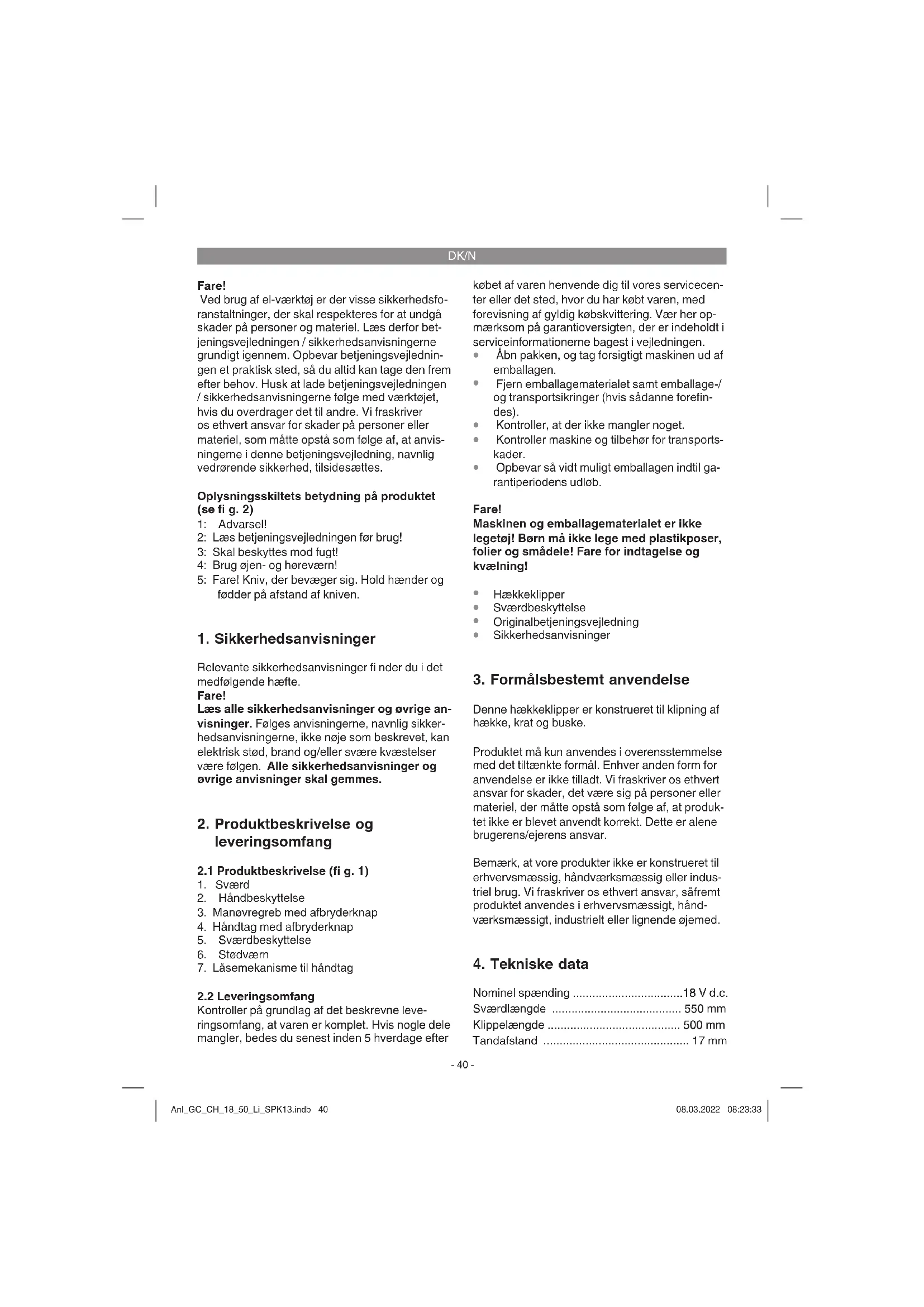 Kontroller, om akkumulatorbatteriet er ladet op, og om opladeren fungerer. Hvis produktet ikke fungerer, selv om spænding er til stede, skal du indsende den til den angivne kundeservice. Anl_GC_CH_18_50_Li_SPK13.indb 43Anl_GC_CH_18_50_Li_SPK13.indb 43 08.03.2022 08:23:3408.03.2022 08:23:34DK/N