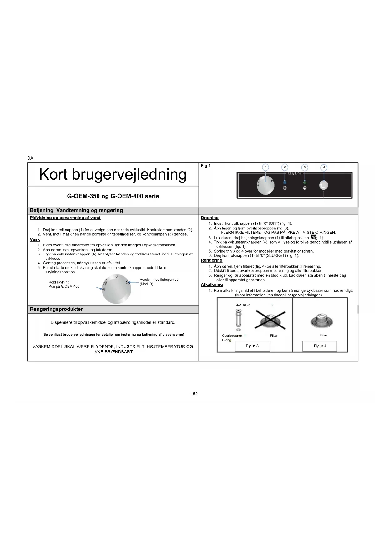 Rengøringsprodukter Dispensere til opvaskemiddel og afspændingsmiddel er standard. (Se venligst brugervejledningen for detaljer om justering og betjening af dispenserne) VASKEMIDDEL SKAL VÆRE FLYDENDE, INDUSTRIELT, HØJTEMPERATUR OG IKKE-BRÆNDBART Kold skylning. Kun på G/OEM-400 Version med fløbspumpe (Mod. B) JA! NEJ! Overløbsprop Filter O-ring Figur 3 Filter Figur 4