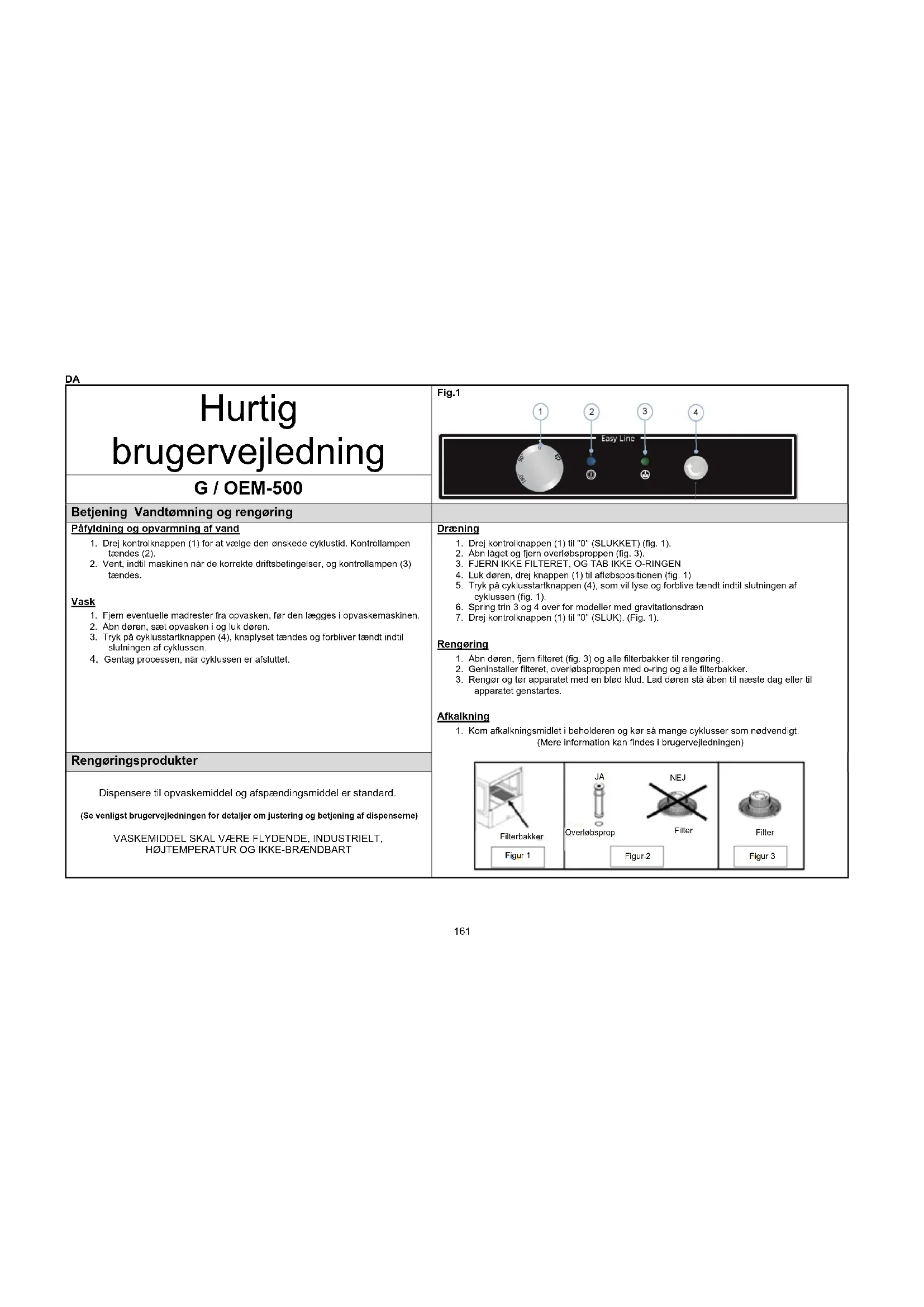 Hurtig brugervejledning Fig.1 G / M-OEM-500 Virkning Vandtømning og rengøring Påfyldning og opvarmning 1. Luk døren, tryk på knappen (1). Baggrundslyset på knappen (1) lyser 2. Vent, indtil maskinen når de korrekte driftsbetingelser, og kontrollampen (2) tændes. Vask 1. Fjern eventuelle rester fra servicet, inden du sætter det i opvaskemaskinen. 2. Åbn døren, sæt opvasken i, luk døren. 3. Vælg cyklus ved at trykke på knappen (4), (5) eller (6). Når den valgte cyklusknap lyser, kører maskinen. 4. Gentag processen, når cyklussen er afsluttet. BEMÆRKNINGER: For at fremskynde opvarmningsprocessen skal du køre et par cyklusser, men først efter at have nået skylletemperaturen på 85°C. Hvis du starter vaskecyklussen, før den mindste skylletemperatur på 85°C er nået VASKECYKLUSSEN KAN TAGE LÆNGERE TID. Dræning 1. Åbn døren, når maskinen er tændt. 2. Træk filterbakkerne (fig. 2) og overløbsproppen (fig. 3) ud. FJERN IKKE FILTERET OG PAS PÅ IKKE AT MISTE O-RINGEN. 3. Tryk på knappen (4) i 3 sekunder for at starte tømningscyklussen. Baggrundslyset på knappen (5) begynder at blinke. 4. Vent, indtil baggrundslyset på knappen (4) slukker. 5. Spring trin 3 og 4 over for modeller med gravitationsdræn. 6. Tryk på knappen (1) for at slukke for maskinen og lukke døren. Regenerering 1. Regenereringscyklussen på blødgøringsmodeller kan startes efter tørrecyklussen. Maskinen skal være tom. 2. Hvis LED'en (3) er tændt, skal du fylde saltdåsen inde i maskinen. 3. Åben døren. 4. Tryk og hold knappen (5) nede i 3 sekunder. 5. Når baggrundsbelysningen på knappen (5) begynder at blinke, skal du lukke døren. 6. Vent, indtil baggrundslyset på knappen (5) slukker. 7. Rengør maskinens indvendige dele. Rengøring 1. Åbn døren, fjern filteret (fig. 3) og alle filterbakker til rengøring. 2. Geninstaller filteret, overløbsproppen med o-ring og alle filterbakker. 3. Rengør og tør apparatet med en blød klud. Lad døren stå åben til næste dag eller til apparatet genstartes. Afkalkning 1. Kom afkalkningsmidlet i beholderen og kør så mange cyklusser som nødvendigt. (Mere information kan findes i brugervejledningen) Rengøringsprodukter Dispensere til opvaskemiddel og afspændingsmiddel er standard. (Se venligst brugervejledningen for detaljer om justering og betjening af dispenserne) VASKEMIDDEL SKAL VÆRE FLYDENDE, INDUSTRIELT,