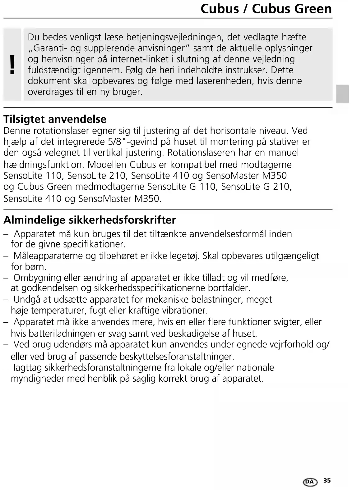 Tilsigtet anvendelse Denne rotationslaser egner sig til justering af det horisontale niveau. Ved hjælp af det integrerede 5/8"-gevind på huset til montering på stativer er den også velegnet til vertikal justering. Rotationslaseren har en manuel hældningsfunktion. Modellen Cubus er kompatibel med modtagerne SensoLite 110, SensoLite 210, SensoLite 410 og SensoMaster M350 og Cubus Green medmodtagerne SensoLite G 110, SensoLite G 210, SensoLite 410 og SensoMaster M350. Almindelige sikkerhedsforskrifter – Apparatet må kun bruges til det tiltænkte anvendelsesformål inden for de givne specikationer. – Måleapparaterne og tilbehøret er ikke legetøj. Skal opbevares utilgængeligt for børn. – Ombygning eller ændring af apparatet er ikke tilladt og vil medføre, at godkendelsen og sikkerhedsspecikationerne bortfalder. – Undgå at udsætte apparatet for mekaniske belastninger, meget høje temperaturer, fugt eller kraftige vibrationer. – Apparatet må ikke anvendes mere, hvis en eller ere funktioner svigter, eller hvis batteriladningen er svag samt ved beskadigelse af huset. – Ved brug udendørs må apparatet kun anvendes under egnede vejrforhold og/ eller ved brug af passende beskyttelsesforanstaltninger. – Iagttag sikkerhedsforanstaltningerne fra lokale og/eller nationale myndigheder med henblik på saglig korrekt brug af apparatet. Du bedes venligst læse betjeningsvejledningen, det vedlagte hæfte „Garanti- og supplerende anvisninger“ samt de aktuelle oplysninger og henvisninger på internet-linket i slutning af denne vejledning fuldstændigt igennem. Følg de heri indeholdte instrukser. Dette dokument skal opbevares og følge med laserenheden, hvis denne overdrages til en ny bruger.