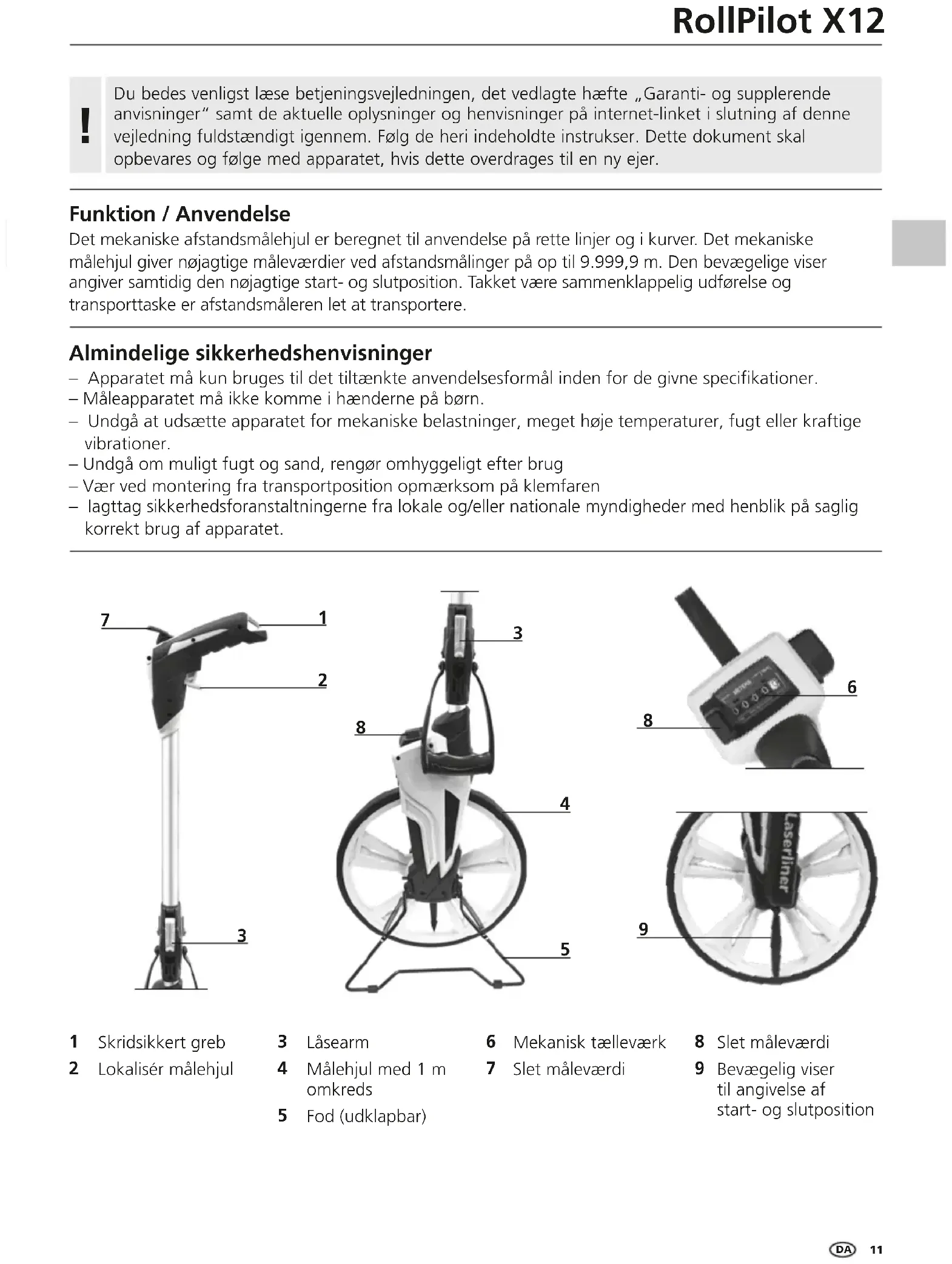 Funktion / Anvendelse Det mekaniske afstandsmålehjul er beregnet til anvendelse på rette linjer og i kurver. Det mekaniske målehjul giver nøjagtige måleværdier ved afstandsmålinger på op til 9.999,9 m. Den bevægelige viser angiver samtidig den nøjagtige start- og slutposition. Takket være sammenklappelig udførelse og transporttaske er afstandsmåleren let at transportere. Almindelige sikkerhedshenvisninger – Apparatet må kun bruges til det tiltænkte anvendelsesformål inden for de givne specikationer. – Måleapparatet må ikke komme i hænderne på børn. – Undgå at udsætte apparatet for mekaniske belastninger, meget høje temperaturer, fugt eller kraftige vibrationer. – Undgå om muligt fugt og sand, rengør omhyggeligt efter brug – Vær ved montering fra transportposition opmærksom på klemfaren – Iagttag sikkerhedsforanstaltningerne fra lokale og/eller nationale myndigheder med henblik på saglig korrekt brug af apparatet.