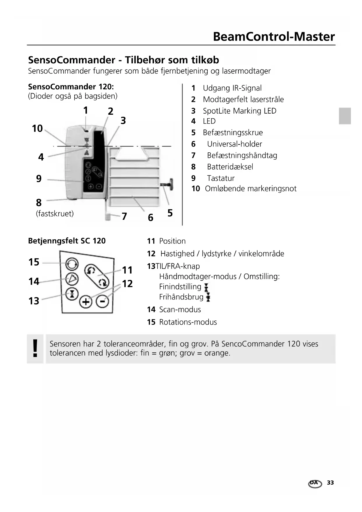 (fastskruet) Betjenngsfelt SC 120 1 Udgang IR-Signal 2 Modtagerfelt laserstråle 3 SpotLite Marking LED 4 LED 5 Befæstningsskrue 6 Universal-holder 7 Befæstningshåndtag 8 Batteridæksel 9 Tastatur 10 Omløbende markeringsnot SensoCommander - Tilbehør som tilkøb SensoCommander fungerer som både fjernbetjening og lasermodtager SensoCommander 120: (Dioder også på bagsiden) Sensoren har 2 toleranceområder, fin og grov. På SencoCommander 120 vises tolerancen med lysdioder: fin = grøn; grov = orange.