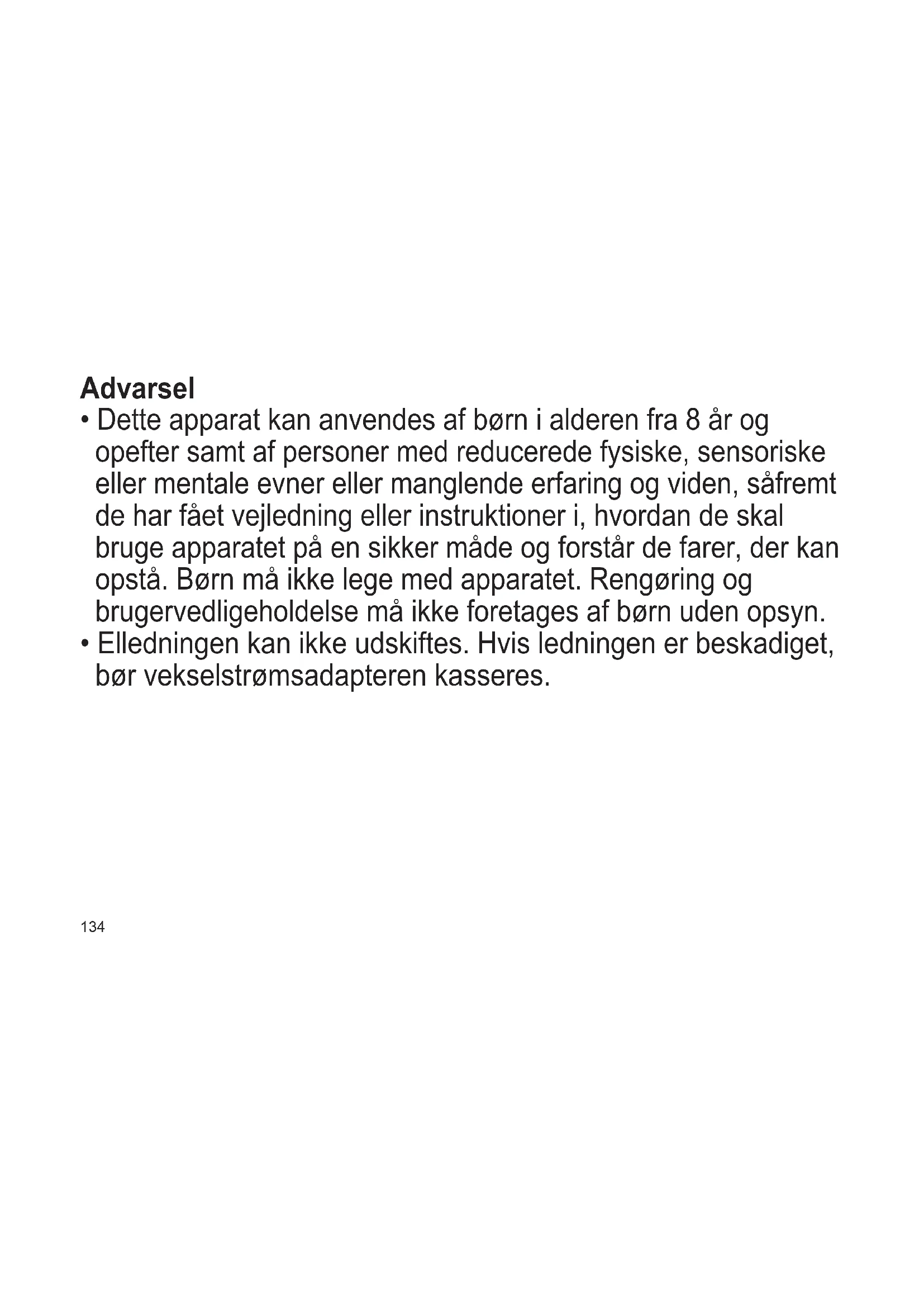 - Dette apparat kan anvendes af børn i alderen fra 8 år og opefter samt af personer med reducerede fysiske, sensoriske eller mentale evner eller manglende erfaring og viden, såfremt de har fået vejledning eller instruktioner i, hvordan de skal bruge apparatet på en sikker måde og forstår de farer, der kan opstå. Børn må ikke lege med apparatet. Rengøring og brugervedligeholdelse må ikke foretages af børn uden opsyn.